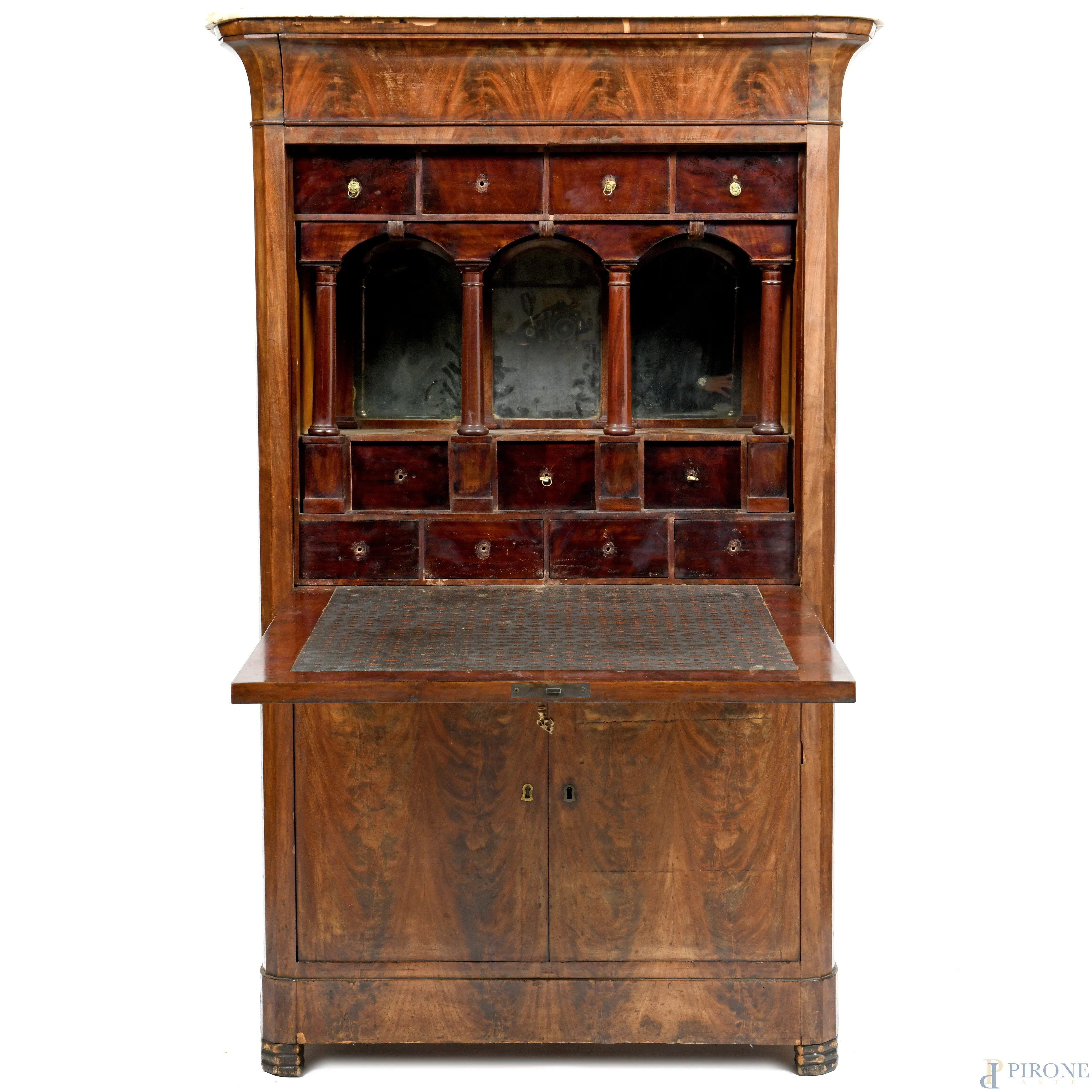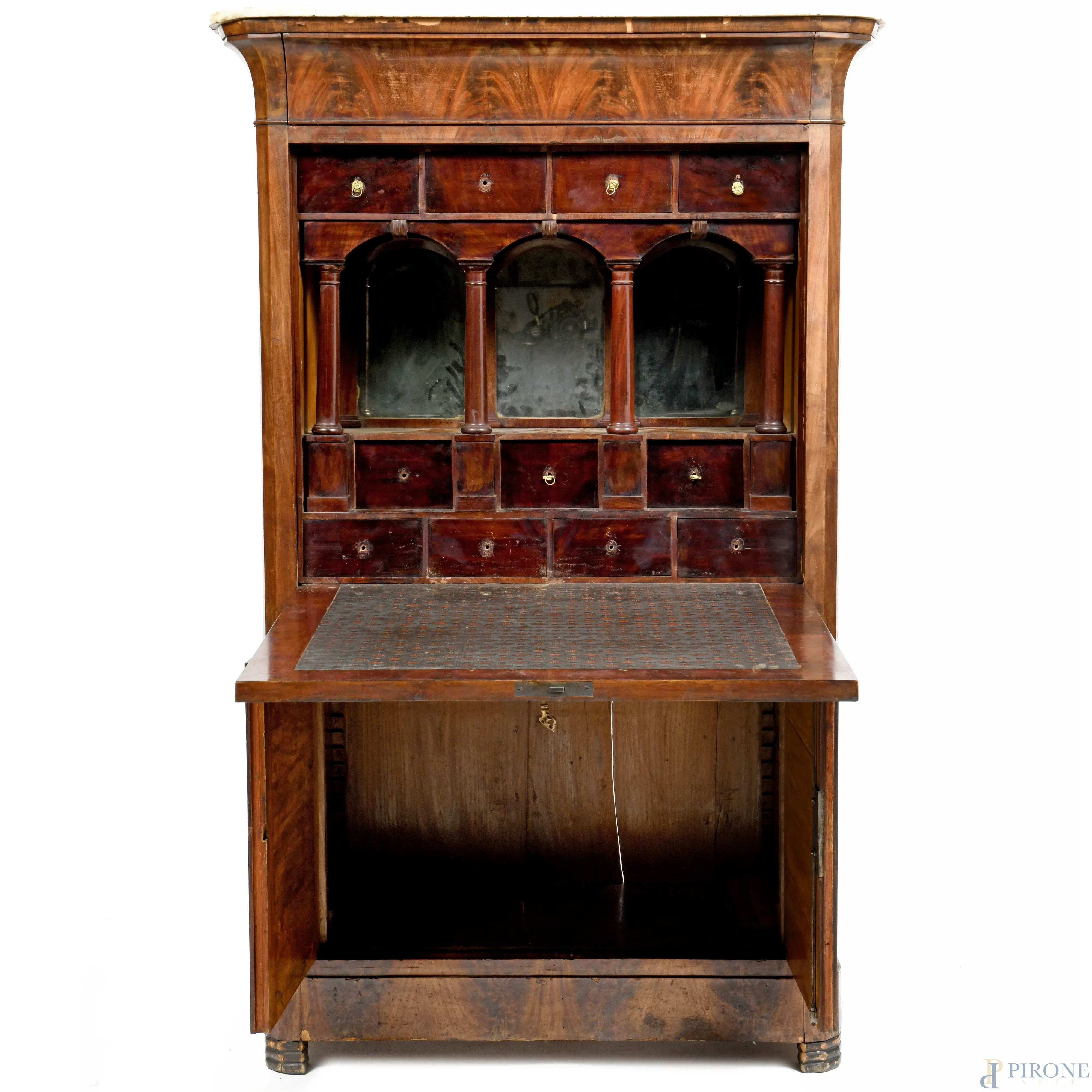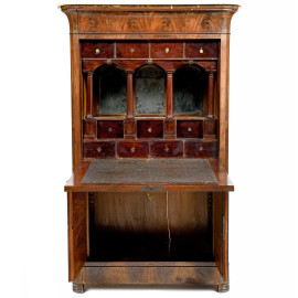 Corpo superiore con sportello a ribalta celante piano scrittoio rivestito in cuoio e vano scandito da tre arcate sostenute da colonnine e sormontato da quattro cassettini. Piano inferiore a doppia anta.