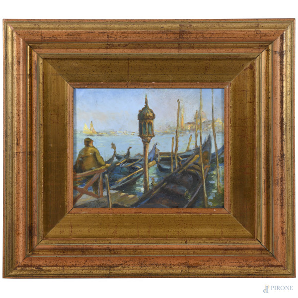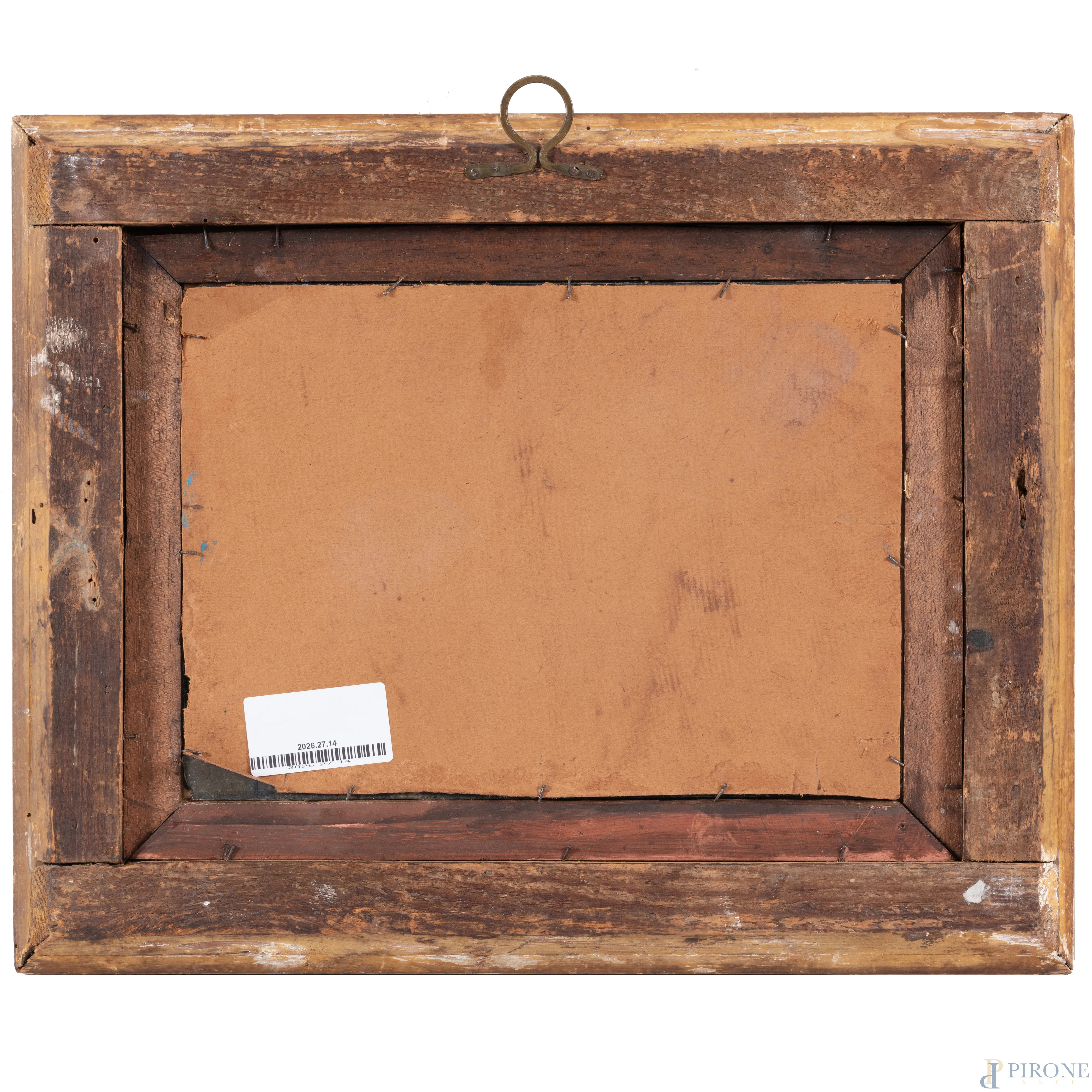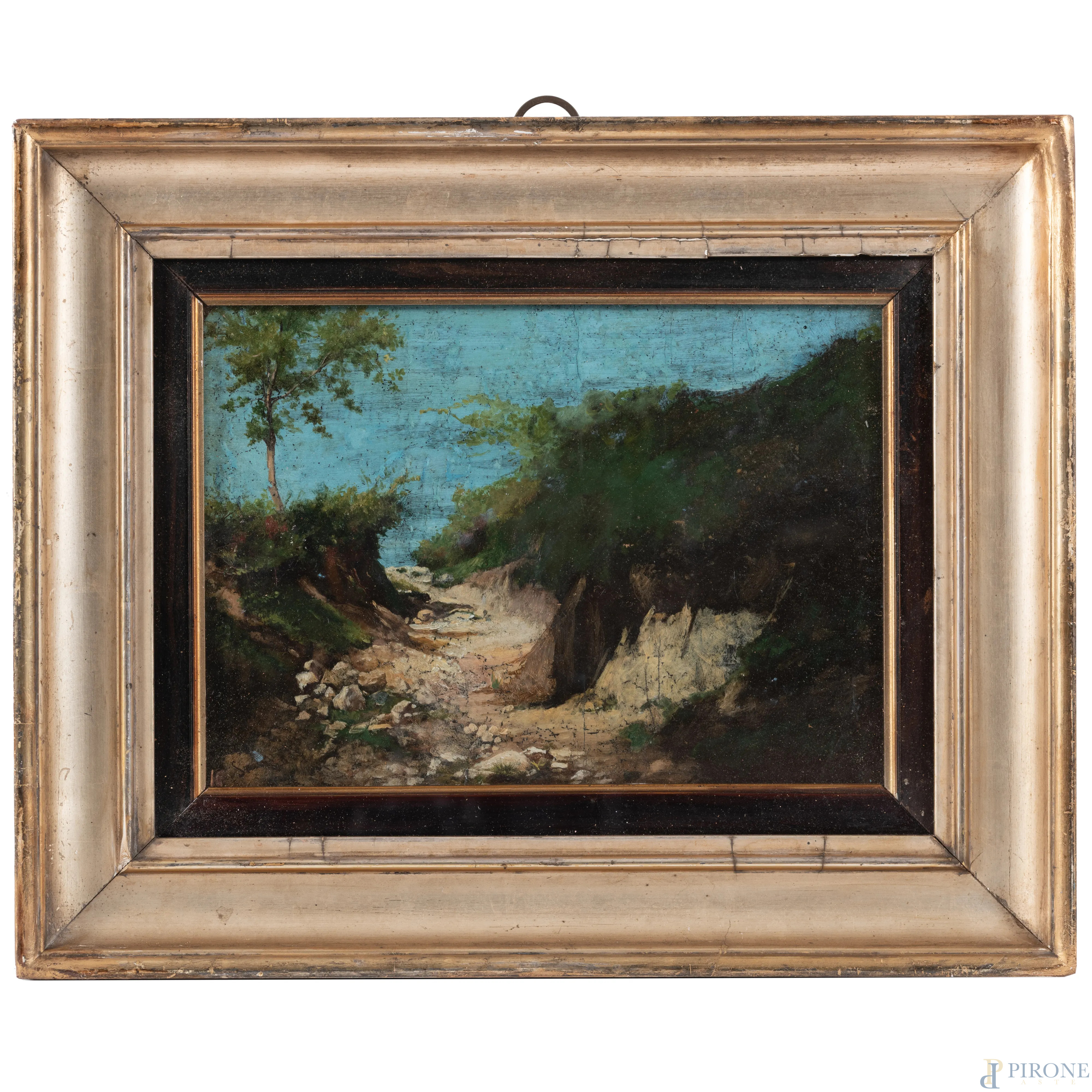 Sentiero, XX secolo, olio su cartone, cm 20x28, firmato in basso a sinistra, entro cornice, (fessurazioni del supporto, sollevamenti di colore, difetti)