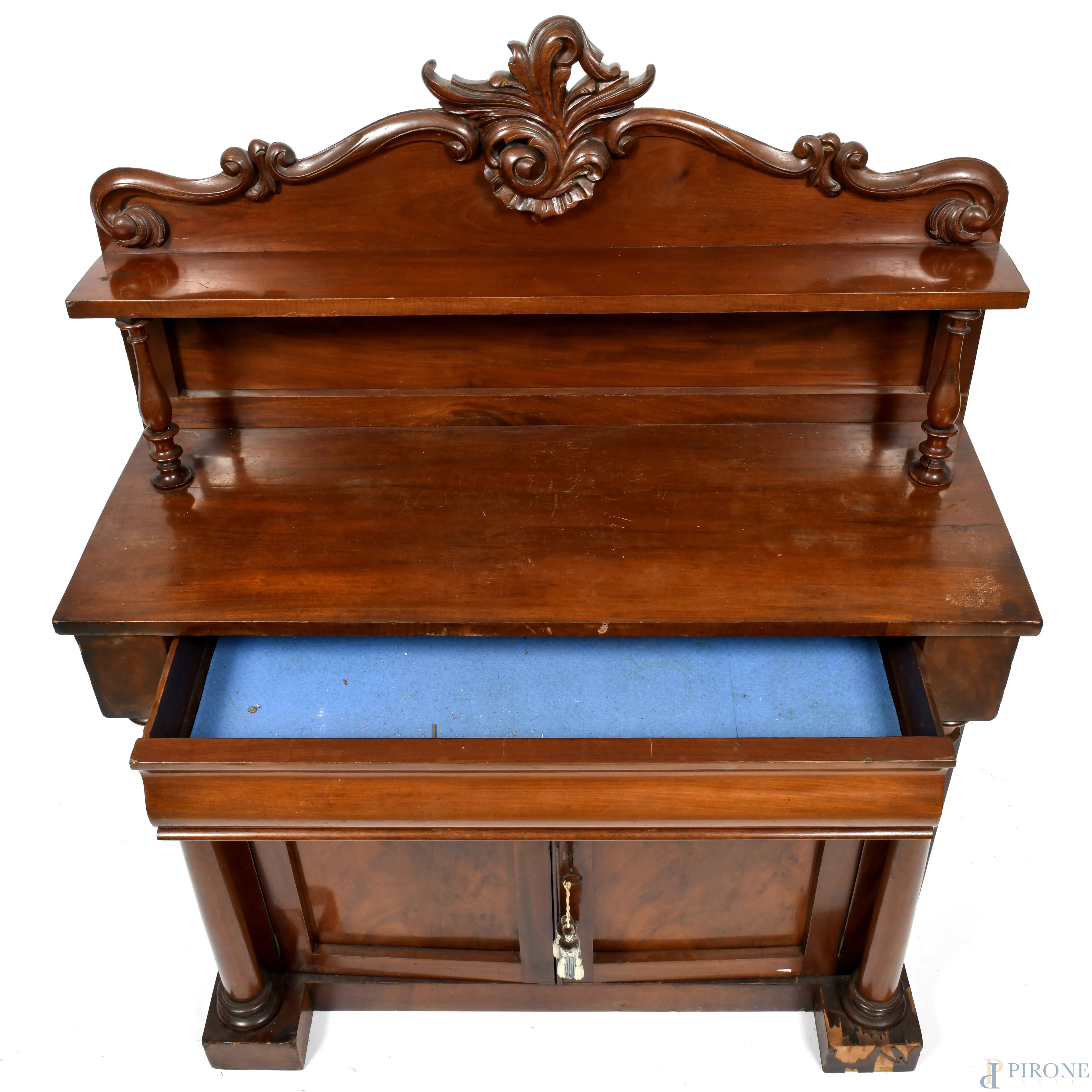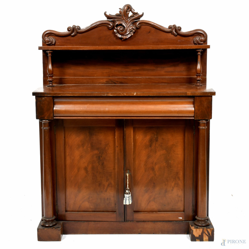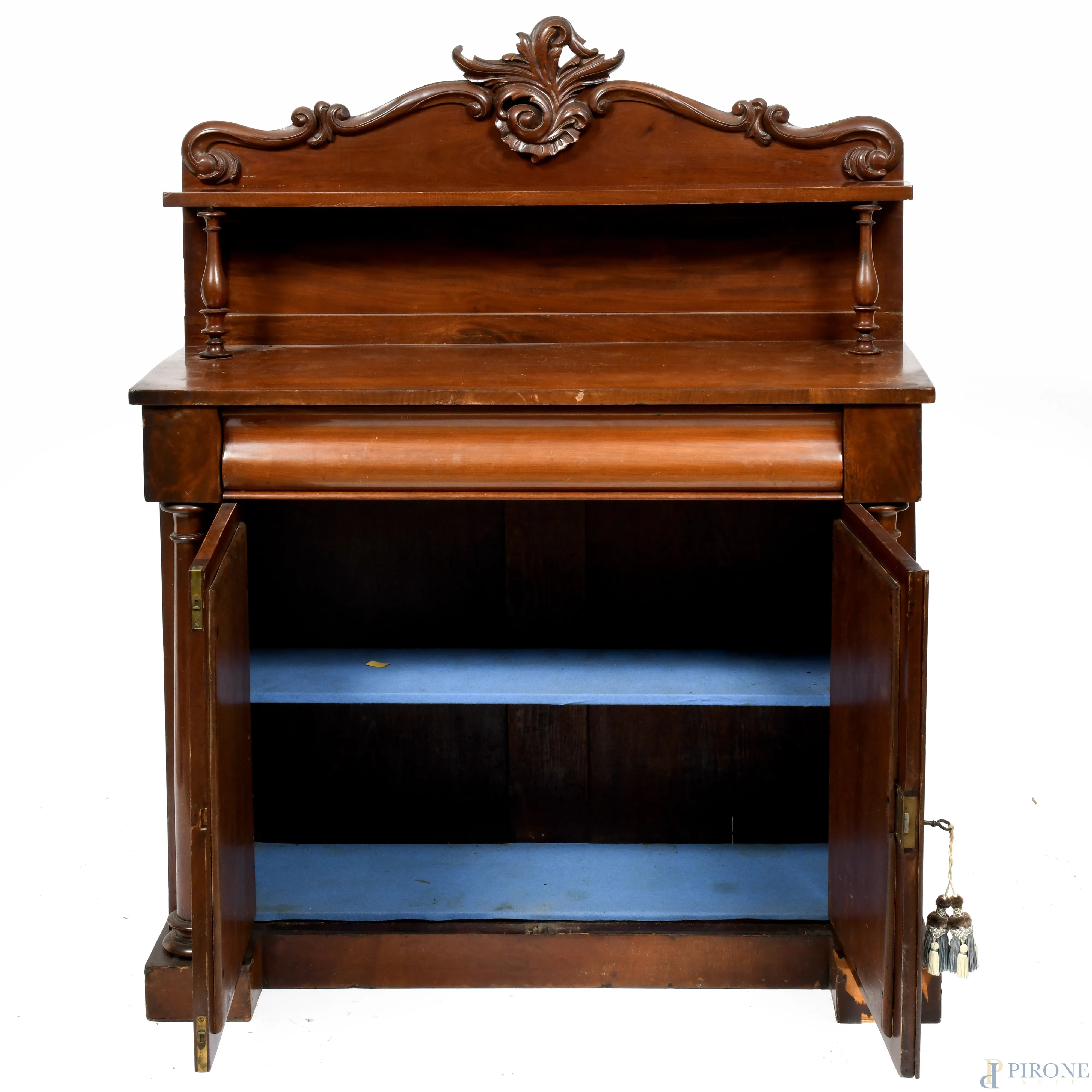 Servantina in mogano a doppia anta inferiore sormontata da cassetto con corpo superiore a giorno con due colonnine sorreggenti mensola e elemento apicale intagliato, XX secolo, cm 134x107x42,5, (segni di usura, difetti)