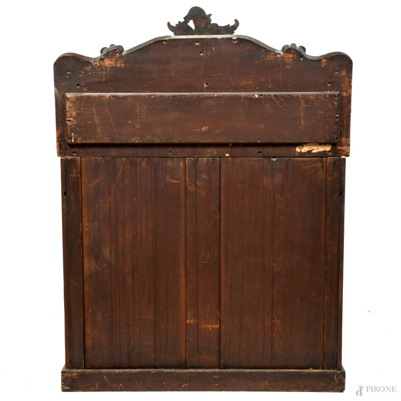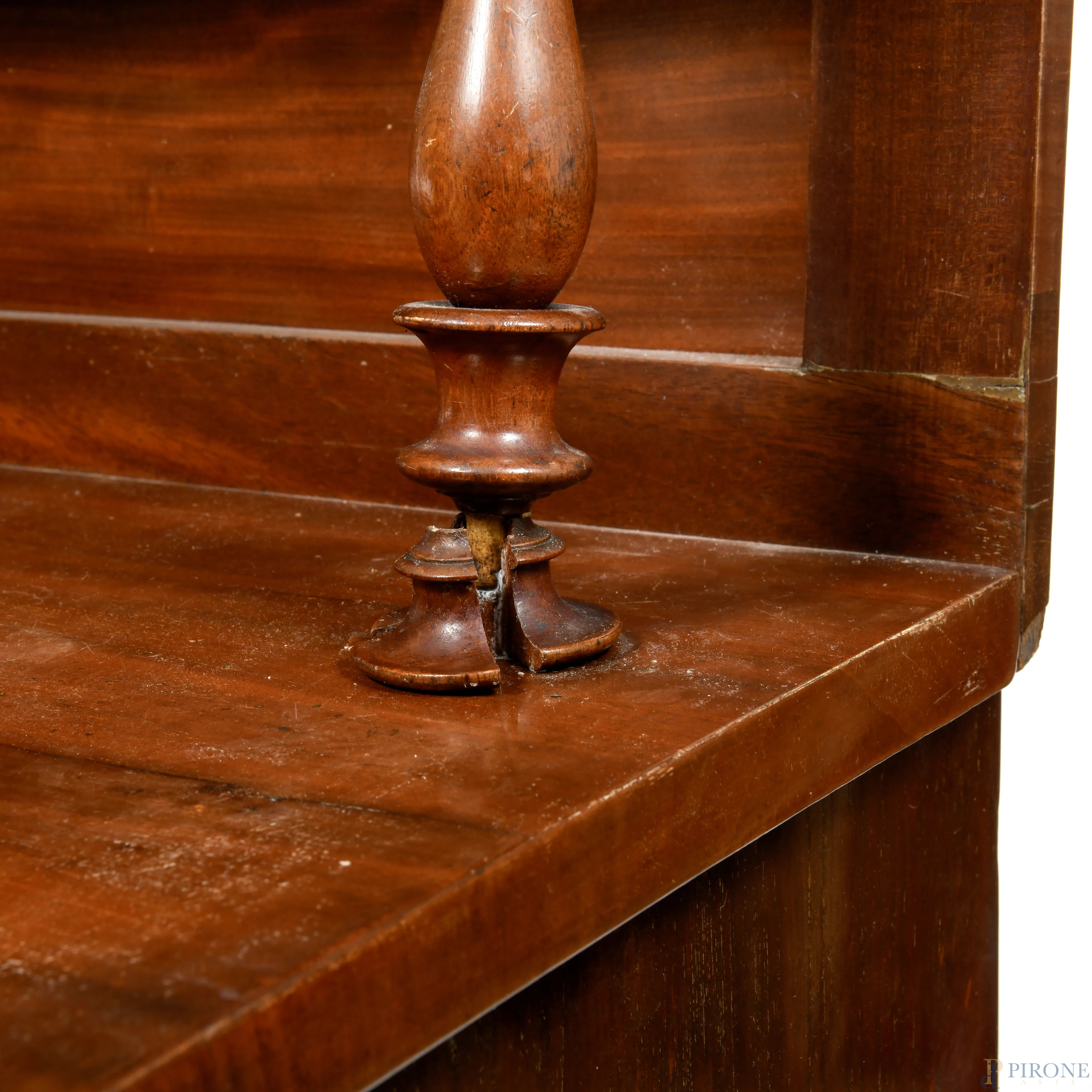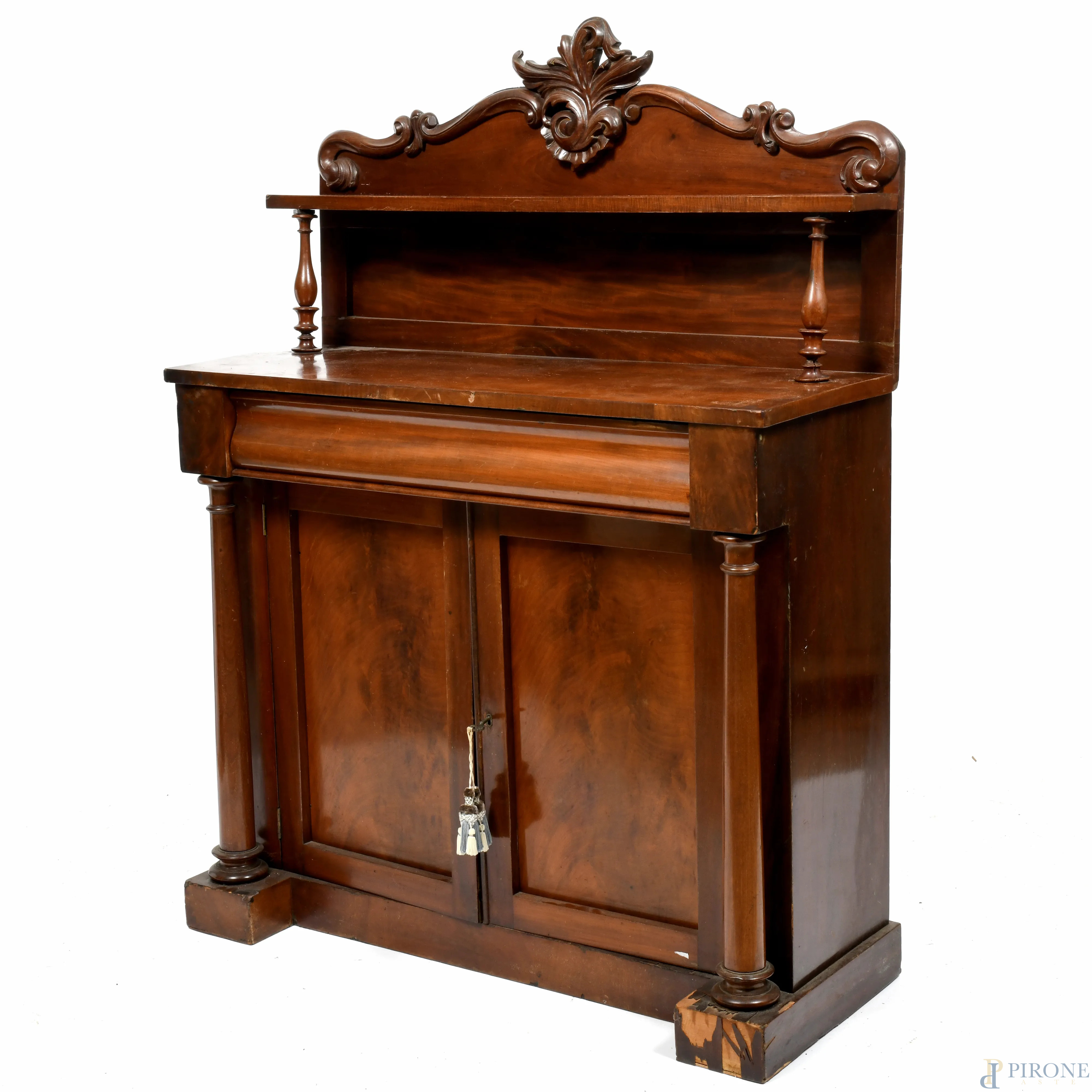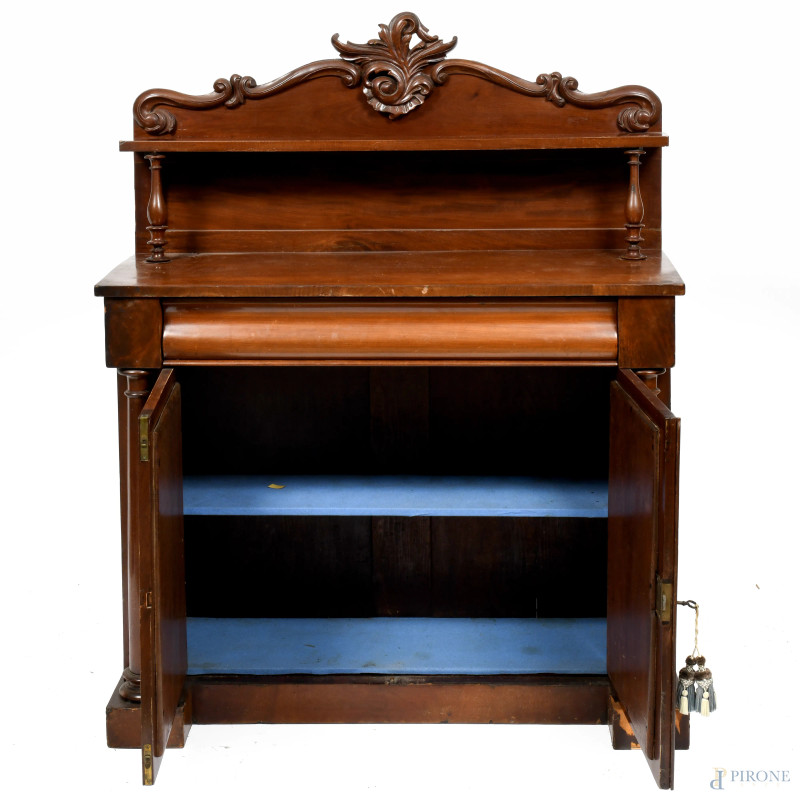 Servantina in mogano a doppia anta inferiore sormontata da cassetto con corpo superiore a giorno con due colonnine sorreggenti mensola e elemento apicale intagliato, XX secolo, cm 134x107x42,5, (segni di usura, difetti)