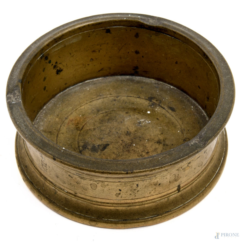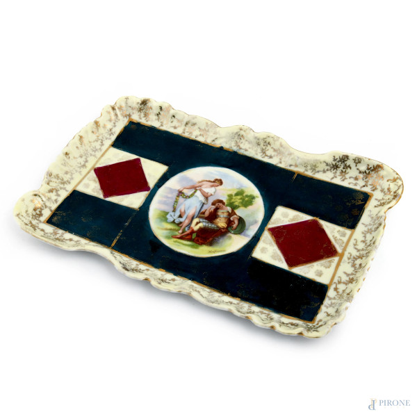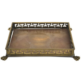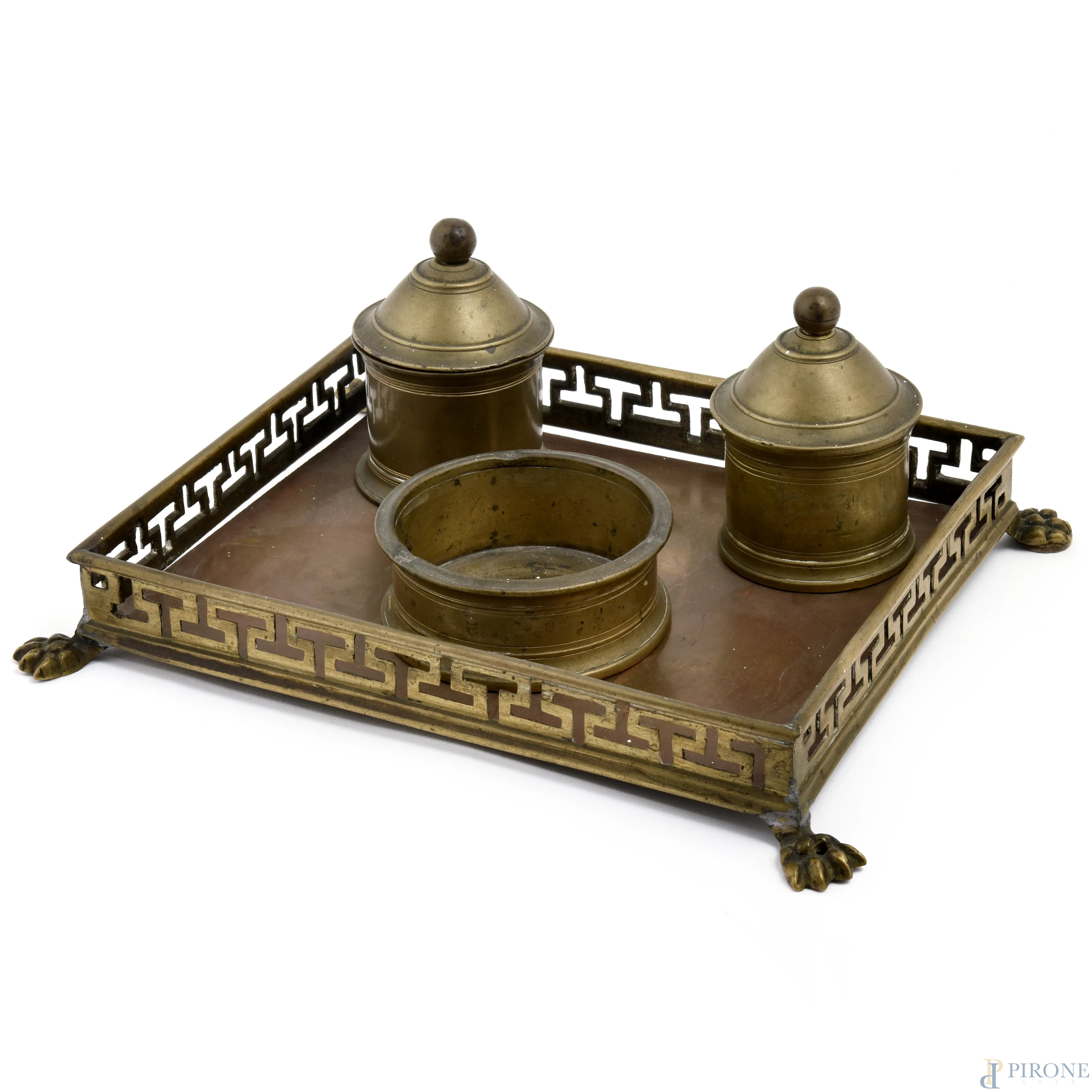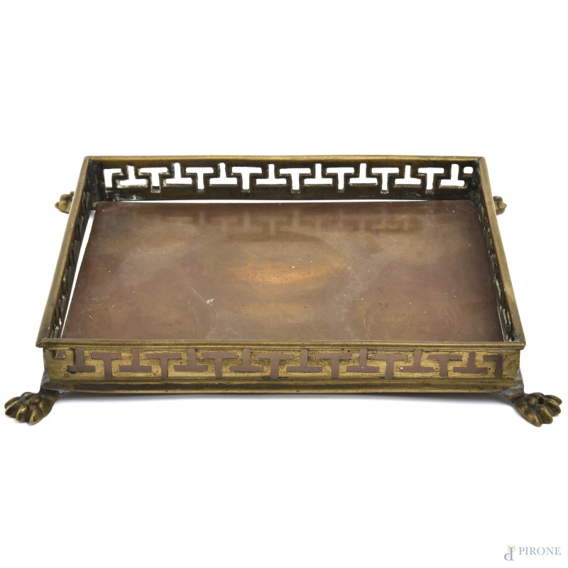 Servito da scrittoio in bronzo dorato con vassoio dal profilo traforato poggiante su quattro piedi ferini, XX secolo, misure vassoio cm 24x29, (segni di usura, difetti)