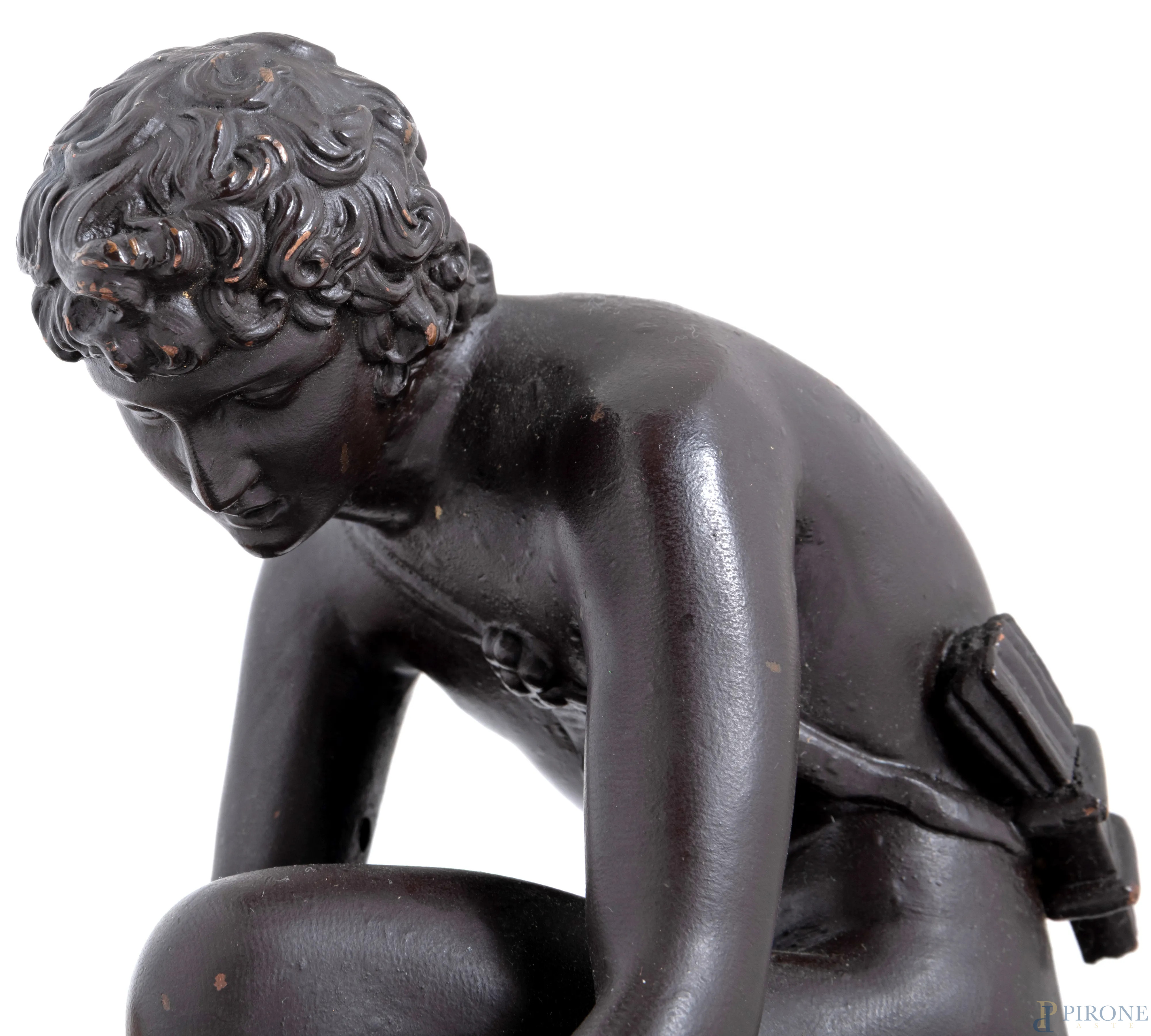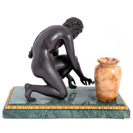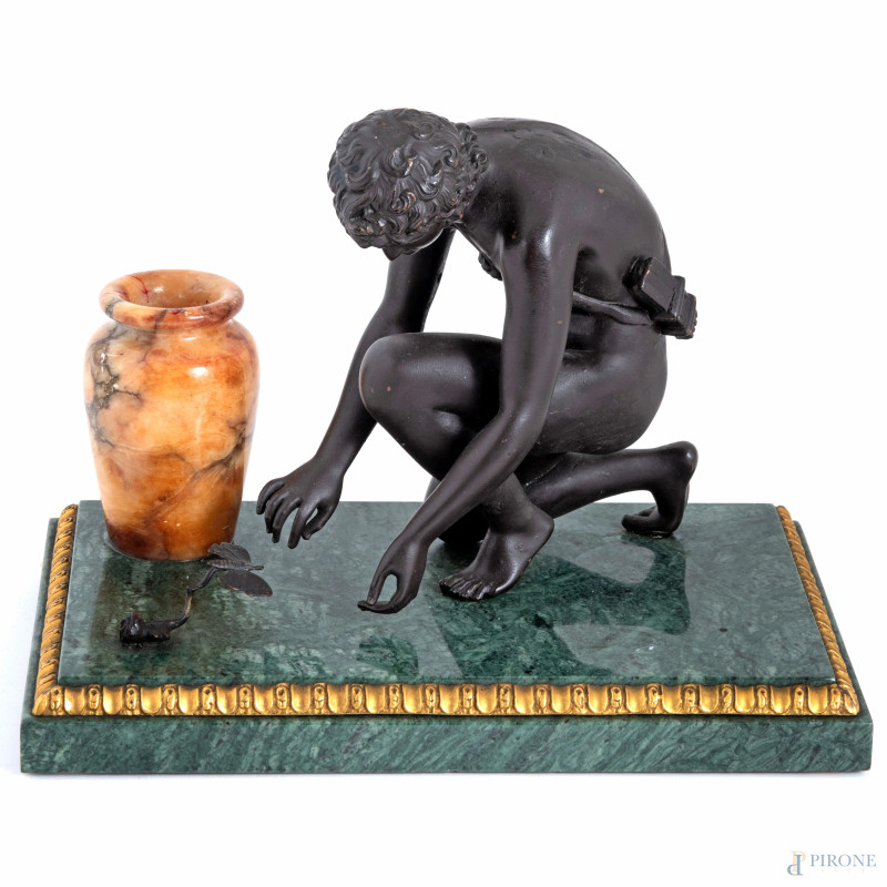 Servito da tavolo con gruppo scultoreo raffigurante Pan con una farfalla, metallo, bronzo e alabastro, XX secolo, cm 21x27,5x17,5, (segni di usura del tempo, difetti)