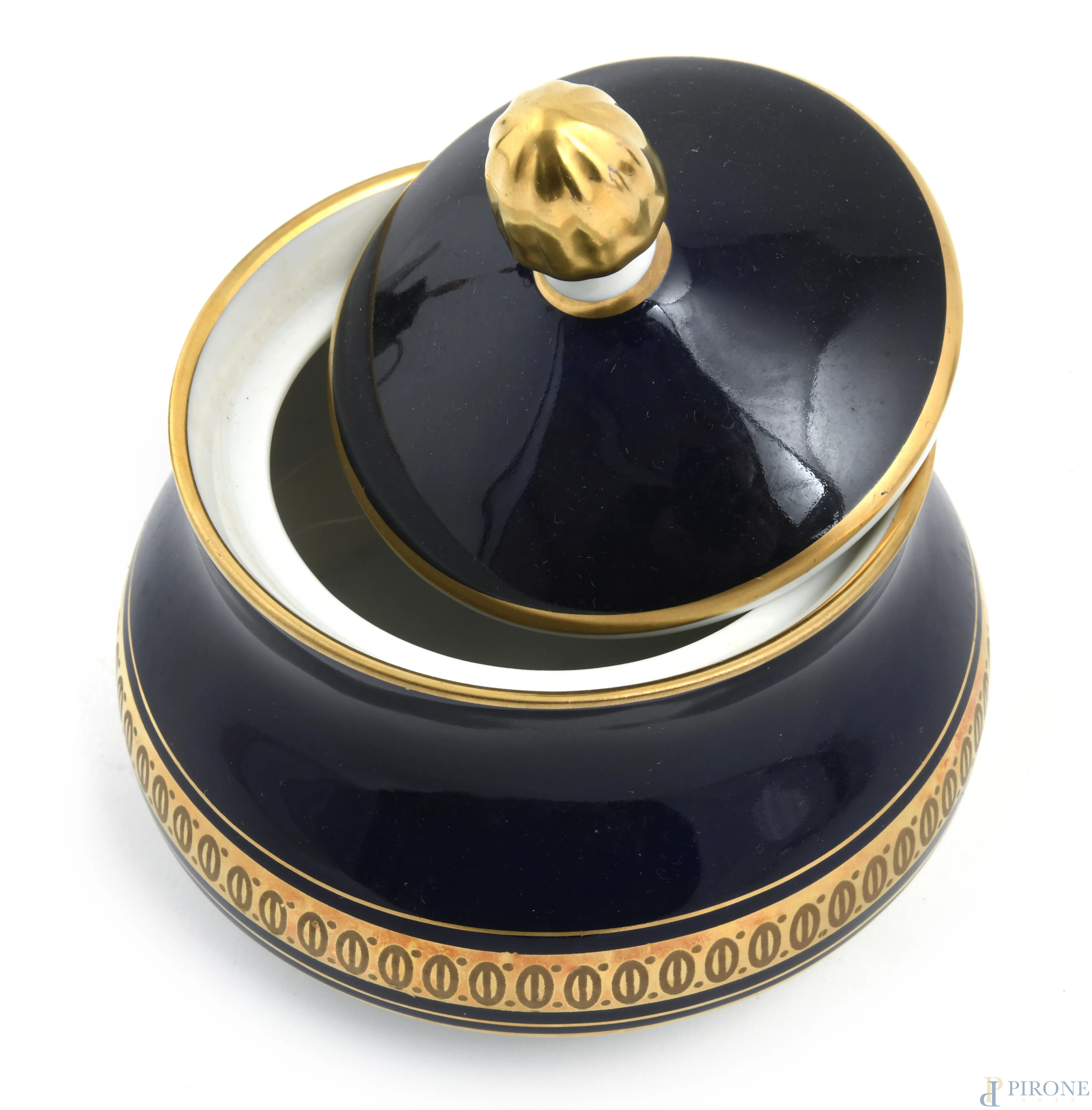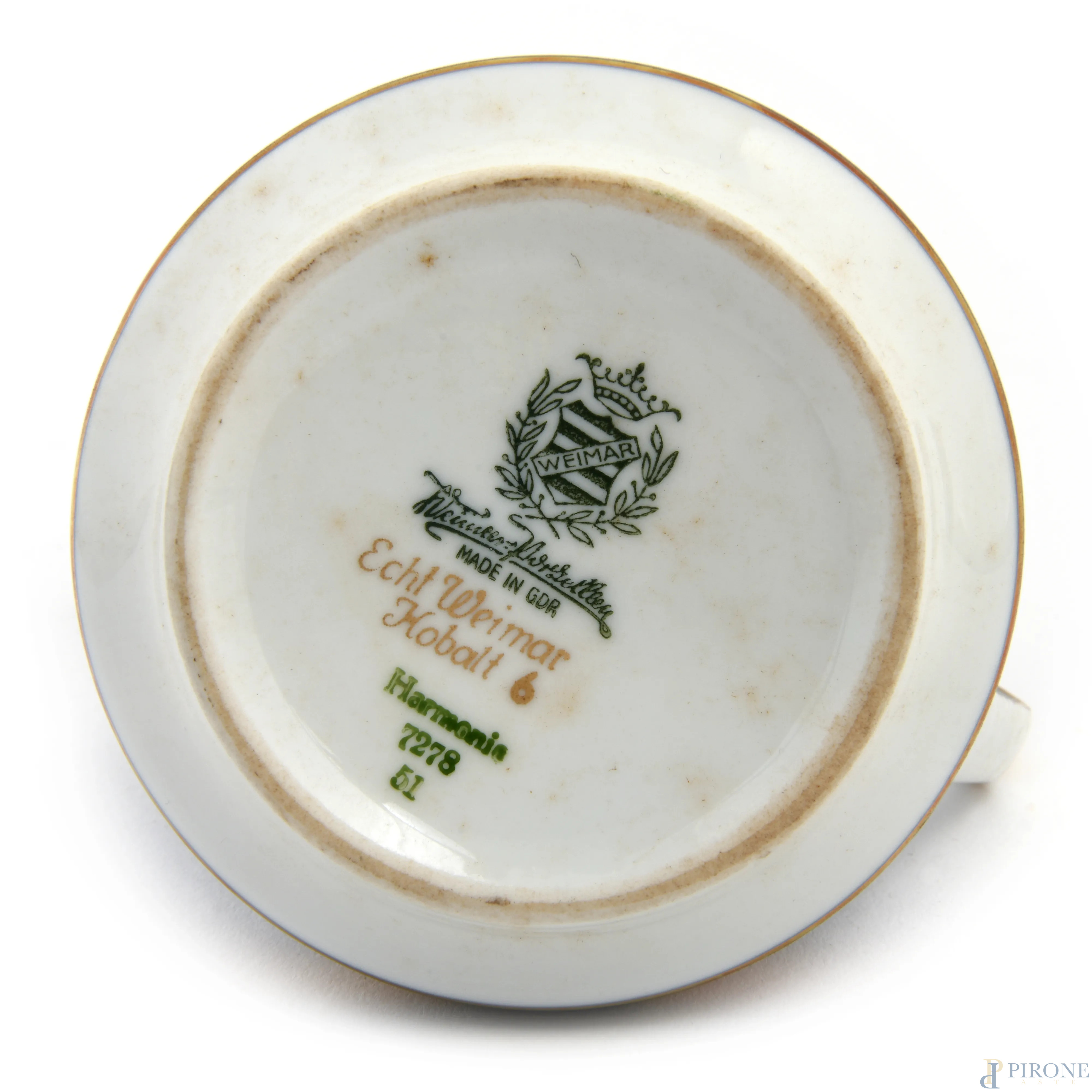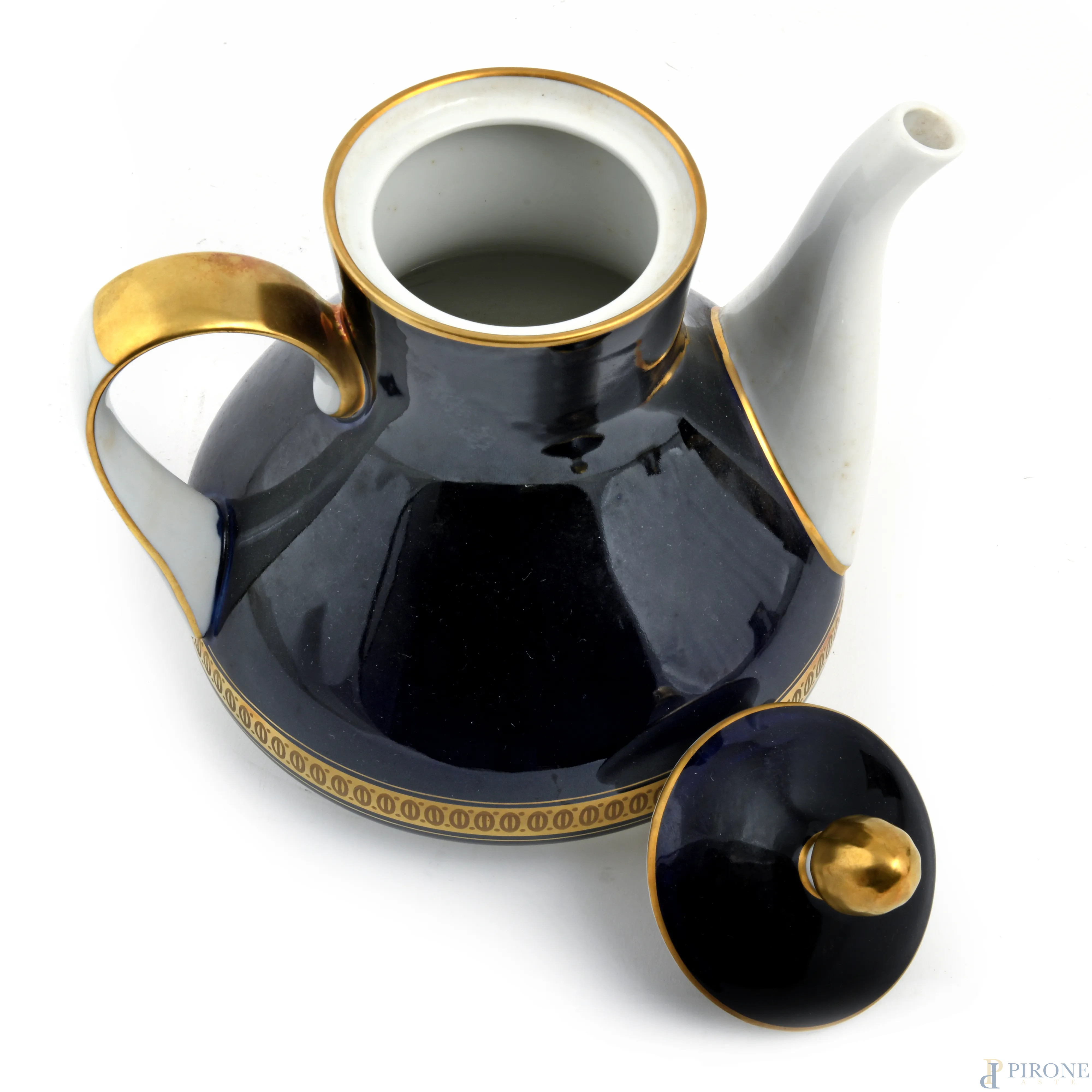 Servizio da the in porcellana Weimar nei toni del blu e dell'oro, XX secolo, altezza cm 17, (lievi segni di usura)