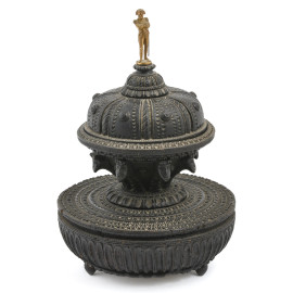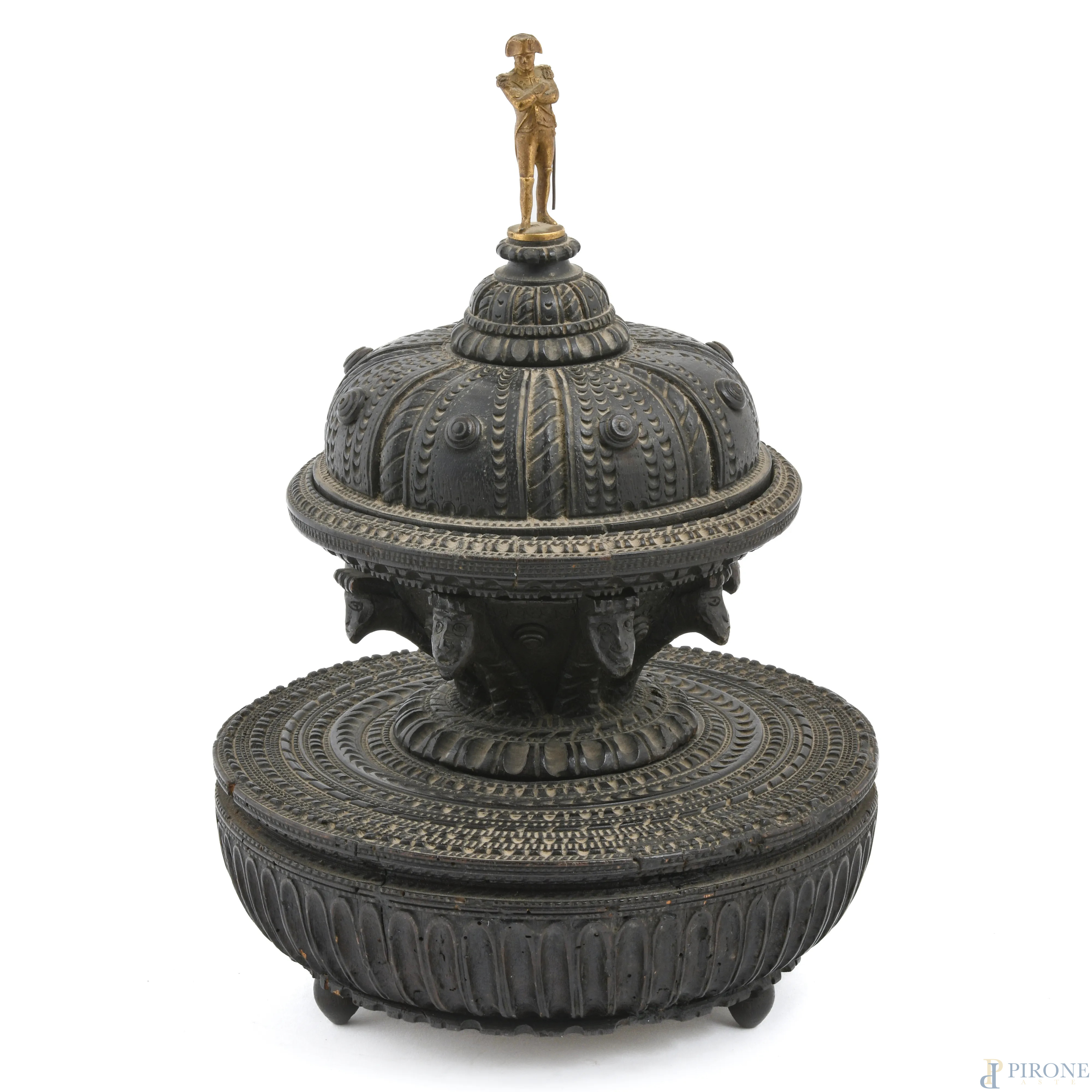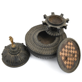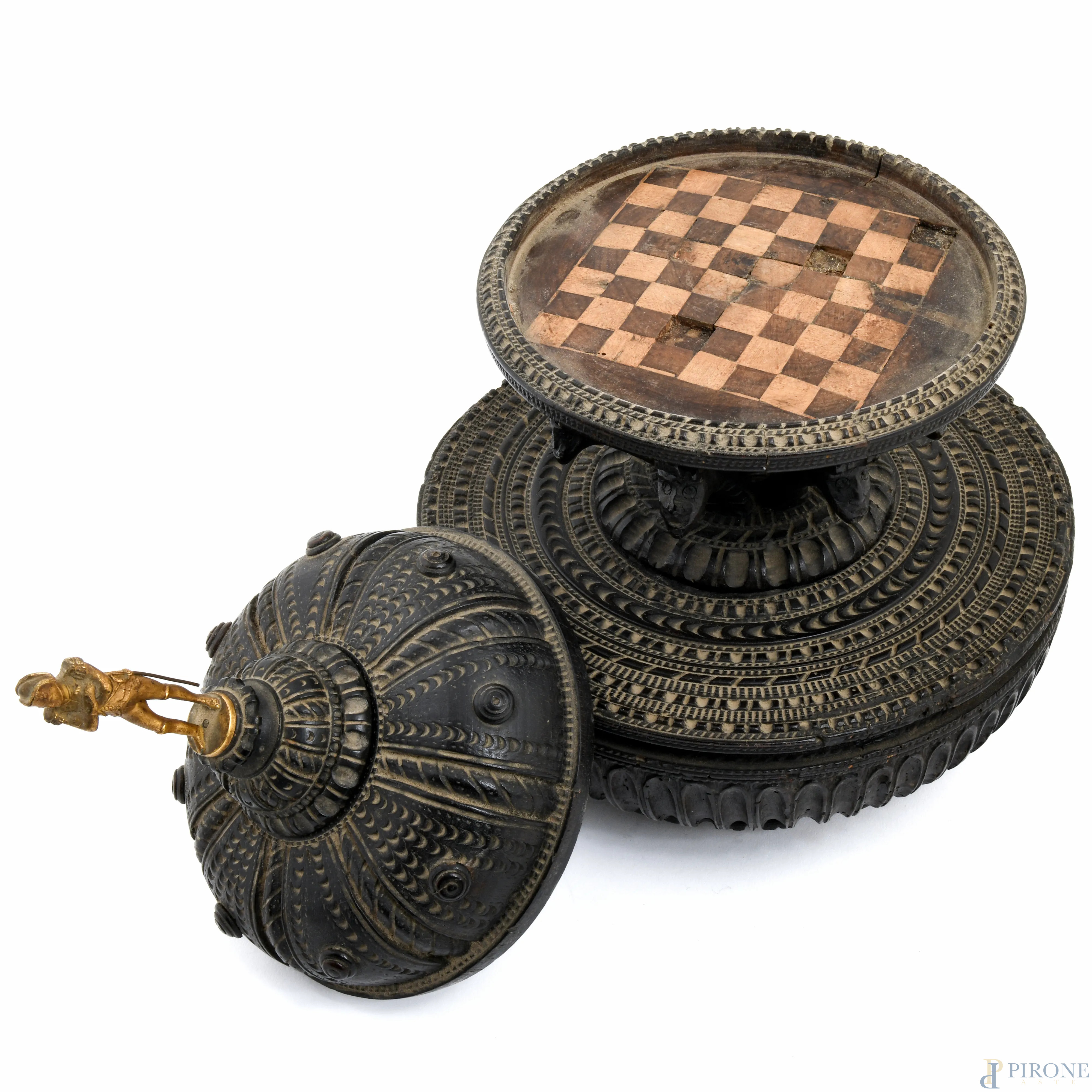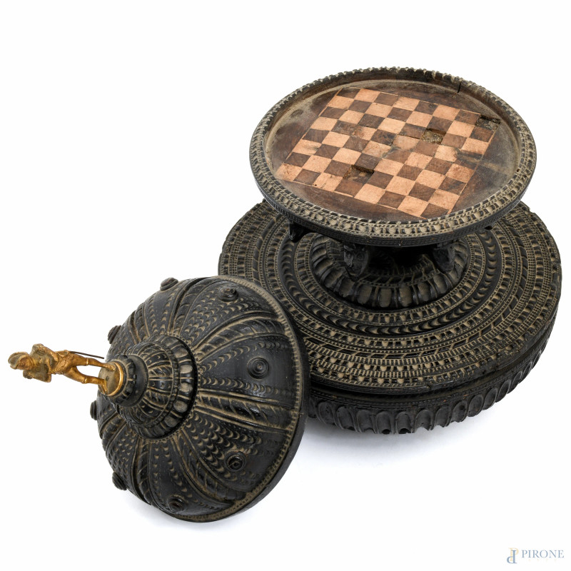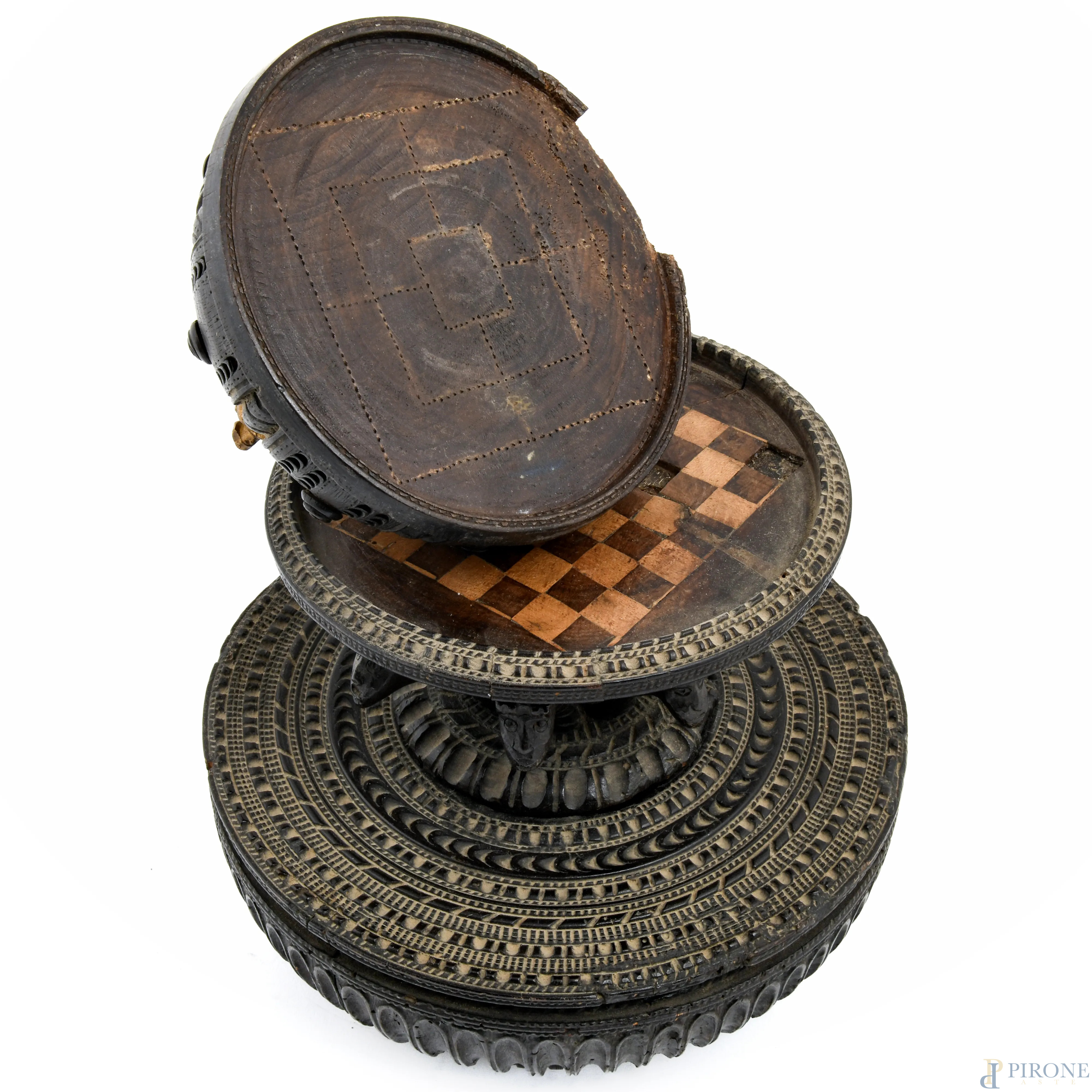 Set da scacchi da viaggio in legno riccamente intagliato, XX secolo, altezza cm 34, (segni di usura, mancanze, scalfiture, graffi, difetti)