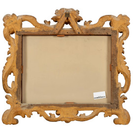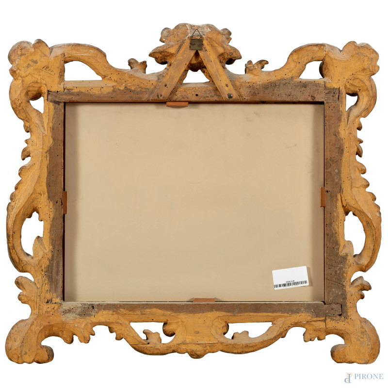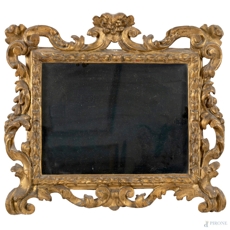 Specchiera in legno intagliato e dorato a volute, XIX secolo, cm 56x60, (scalfiture, fori di tarlo, difetti)