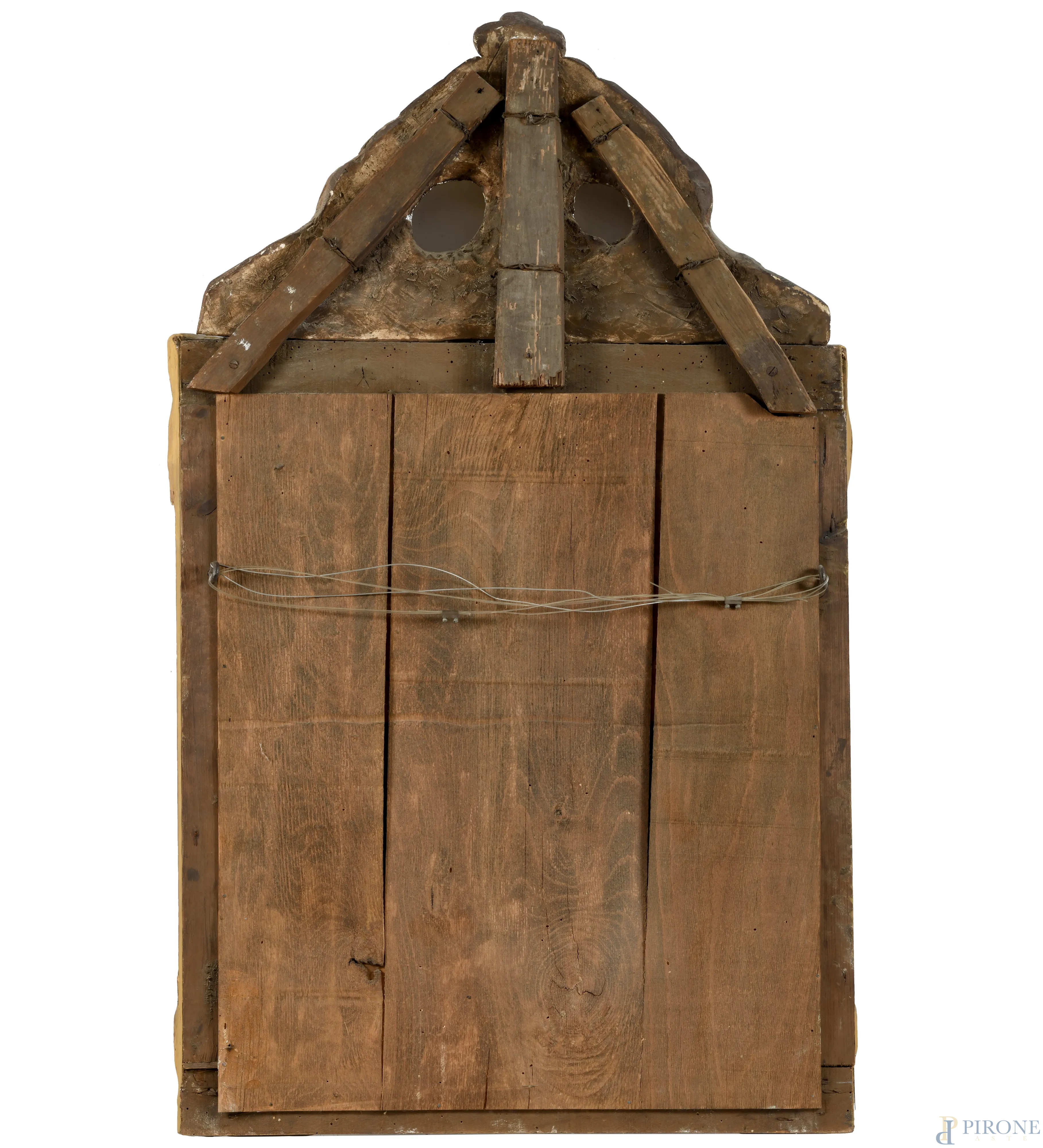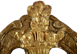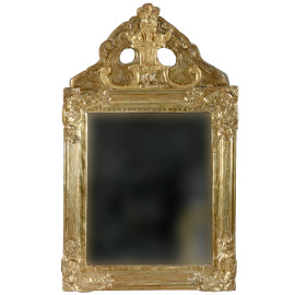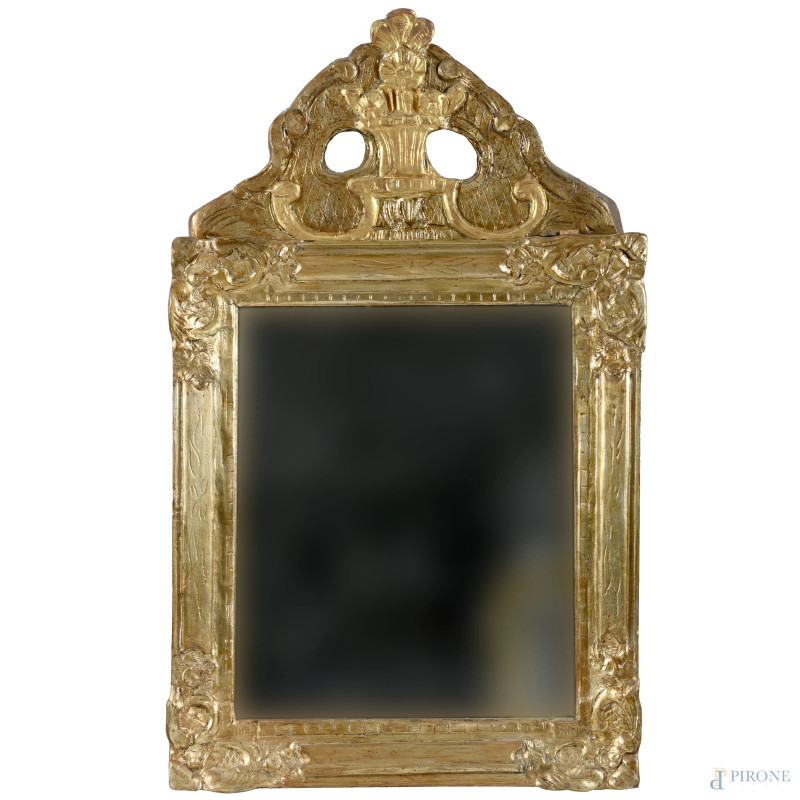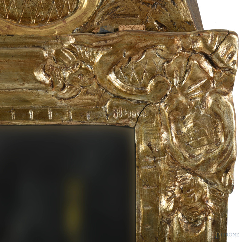 Specchiera in legno intagliato e dorato con cimasa applicata, XX secolo, altezza cm 103,5x63, (lievi difetti, caduta di doratura, restauri, scalfiture)