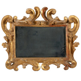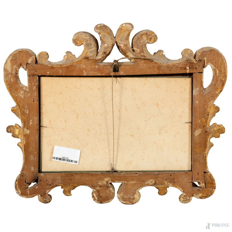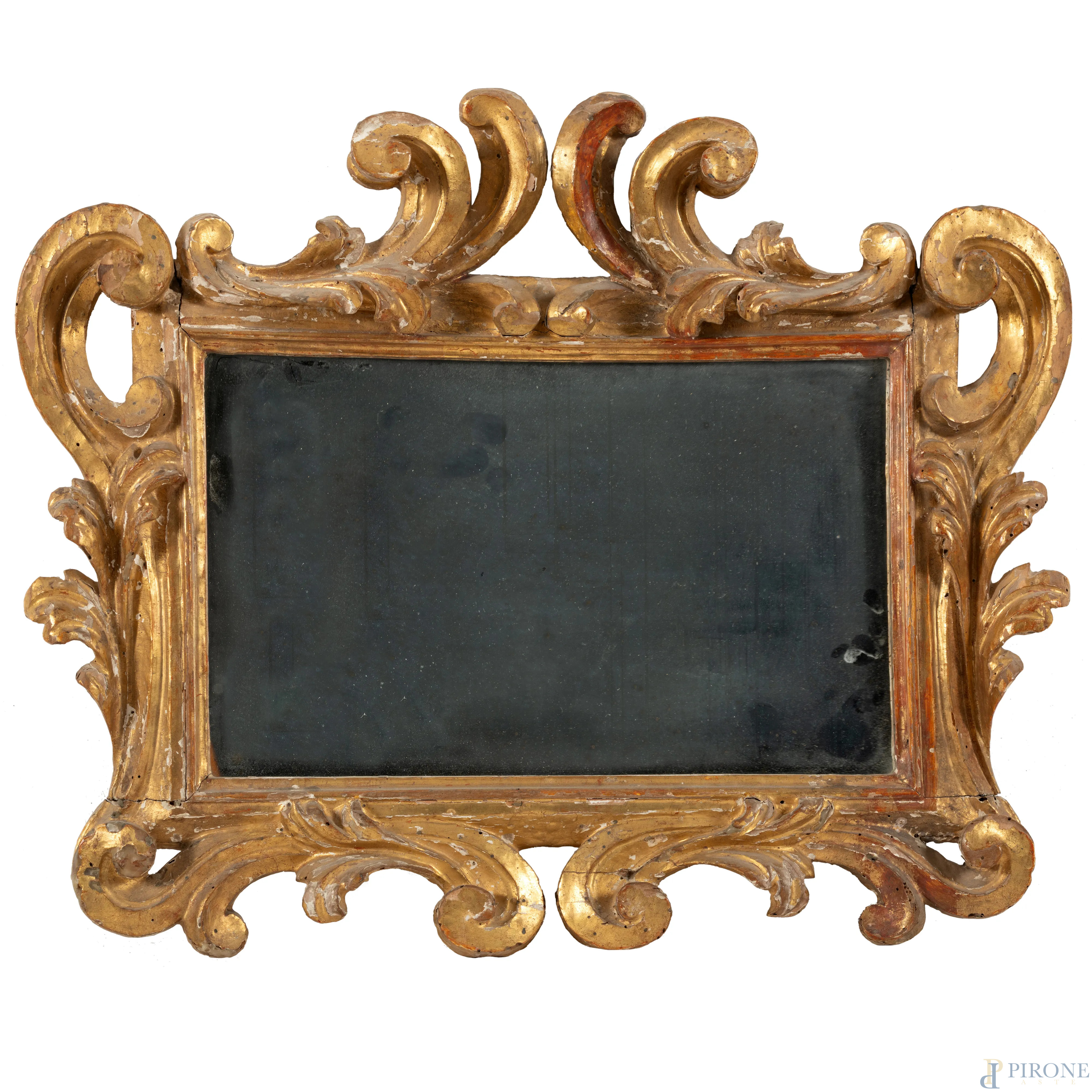 Specchiera n legno intagliato e dorato a volute, XIX secolo, cm 39,5x48,5 (scalfiture, fori di tarlo, difetti, rotture, restauri)