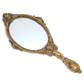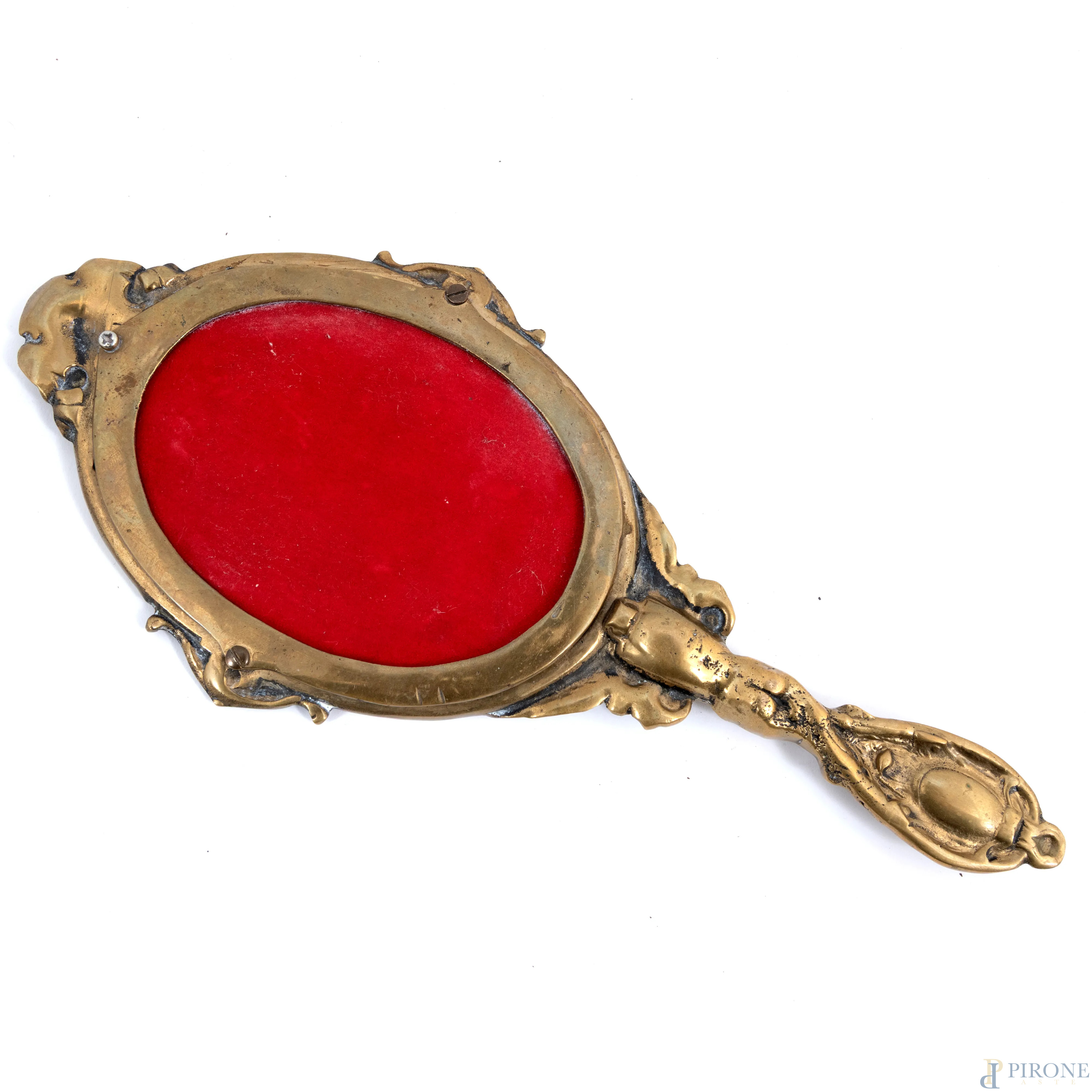 Specchio in bronzo dorato con putti a rilievo, XX secolo, cm 31x14, (segni di usura)