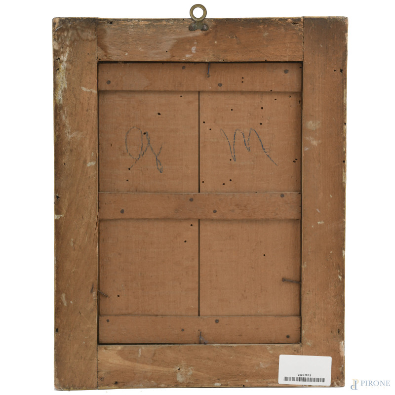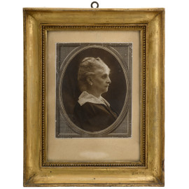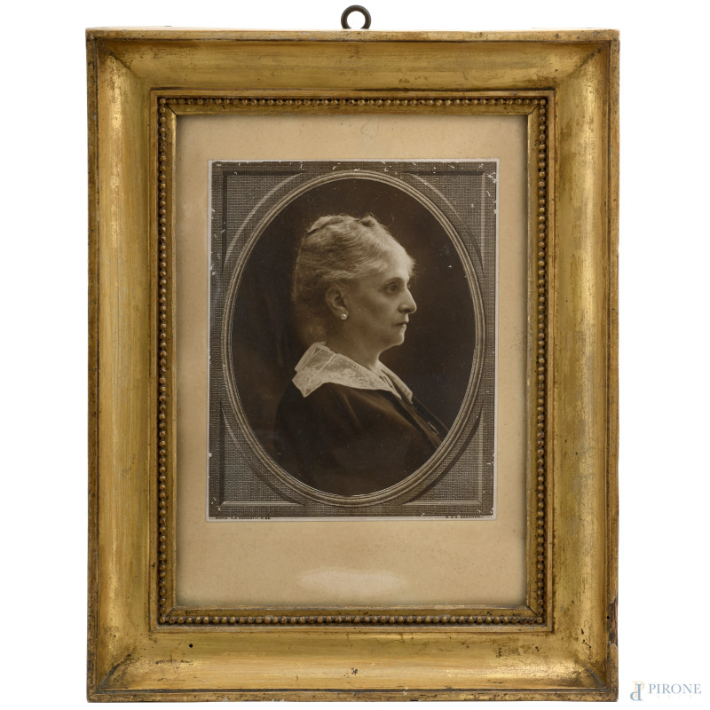 Stampa con fotoritratto di signora entro cornice in legno dorato, XX secolo, misure complessive cm 40x32, (segni di usura, difetti, cadute di doratura, fori di tarlo, scalfiture)