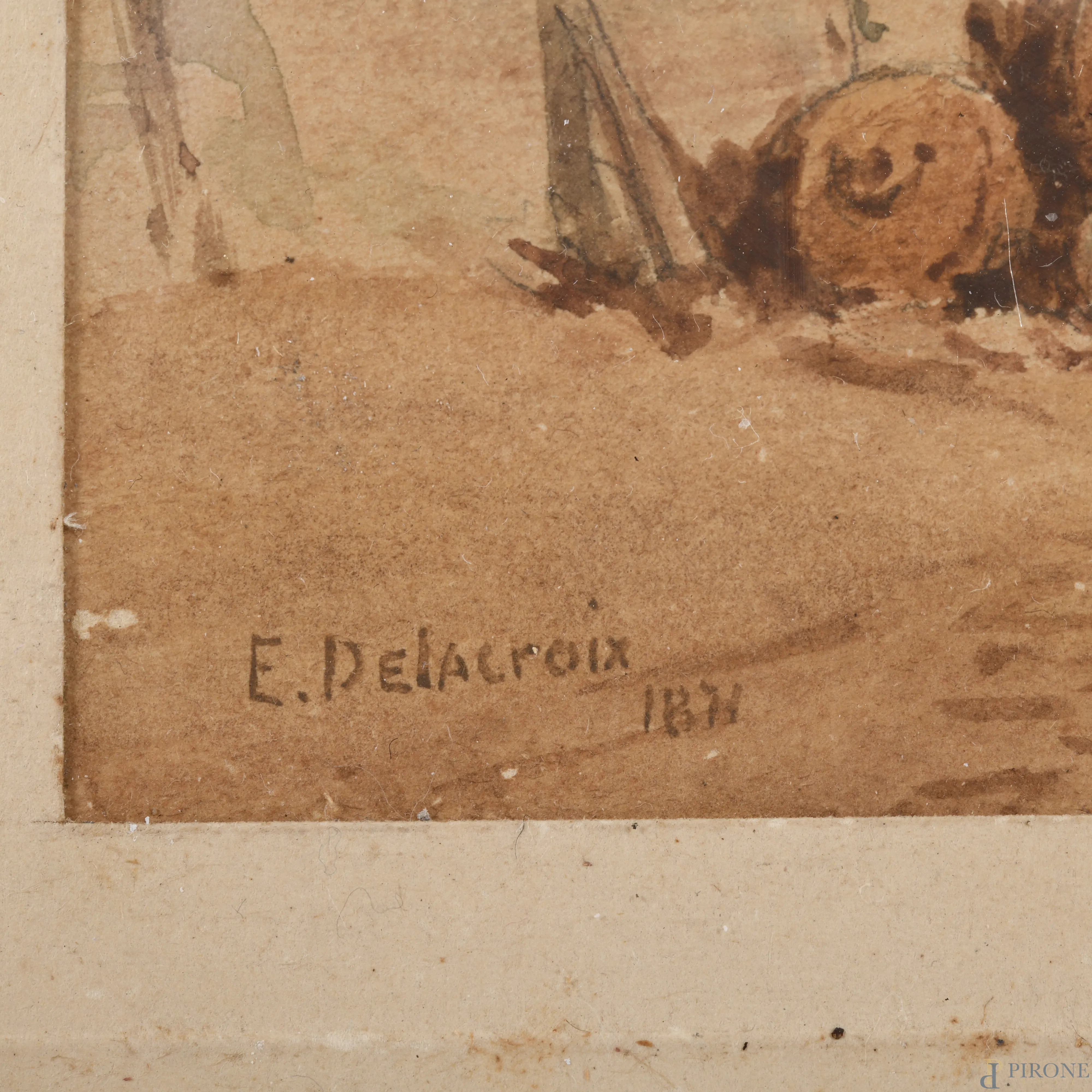 Sulla spiaggia, XIX secolo, tecnica mista su carta,cm 27x22 compreso passepartout, firmato e datato in basso a sinistra, entro cornice, (gore, tracce di umidità. Dietti, fori di tarlo)
