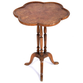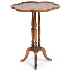 Tavolinetto impiallacciato con piano polilobato poggiante su tre colonnine terminanti in tre gambe mosse, XX secolo, cm 62,5x50,5 (segni di usura, difetti, rotture)