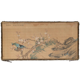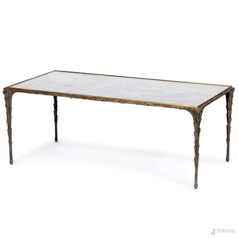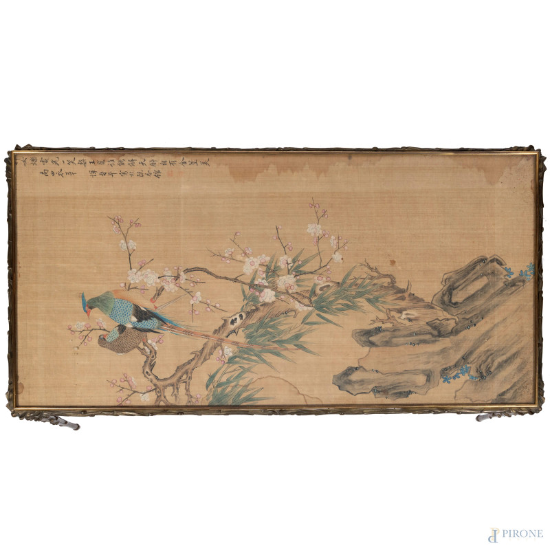 Tavolino con struttura in metallo cesellato con piano in vetro con dipinto su tessuto raffigurante volatili su ramo di ciliegio , XX secolo, cm 40x106x56, (Segni di usura)