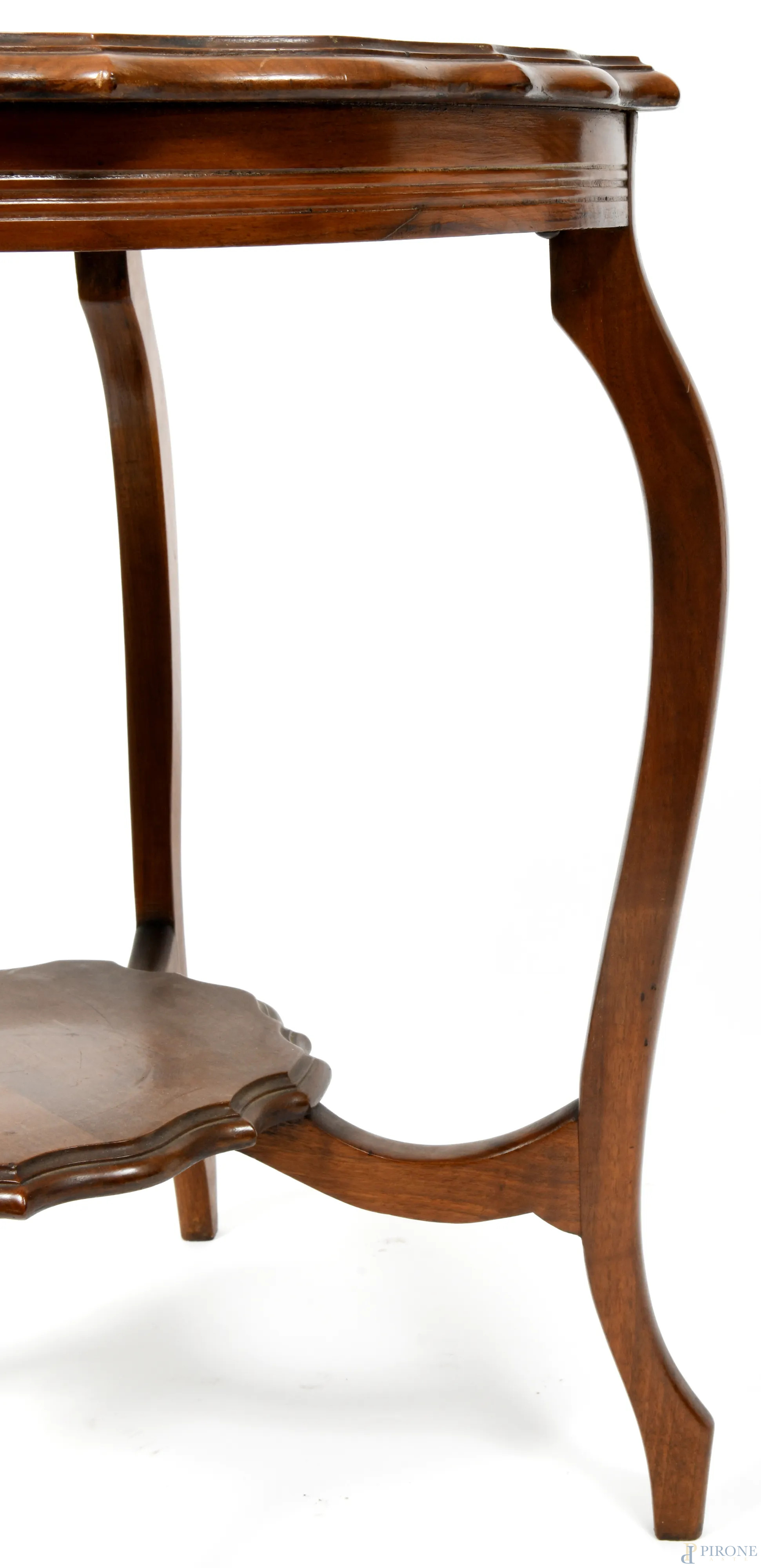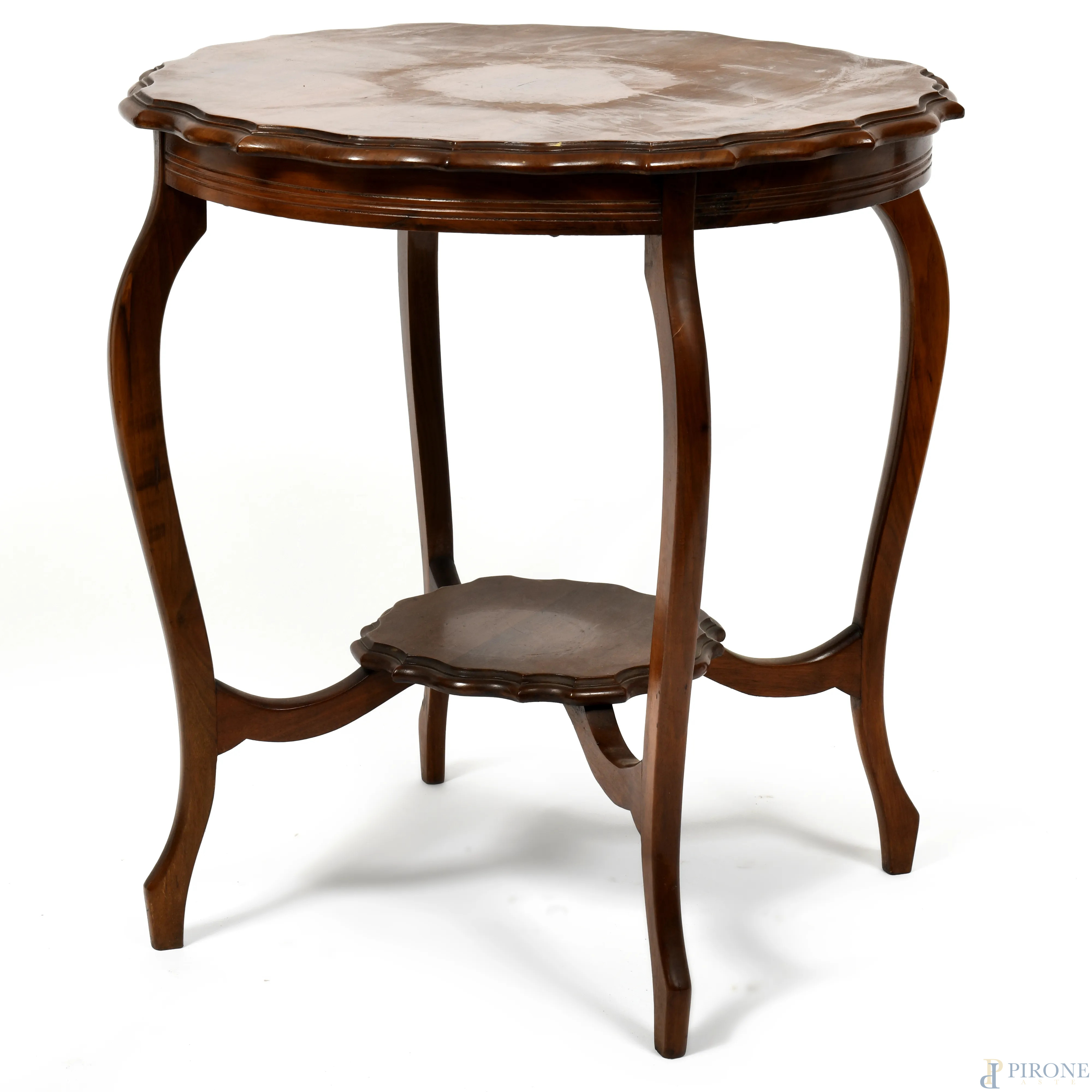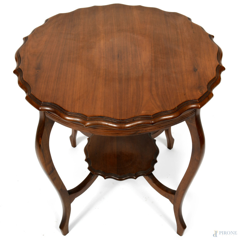 Tavolino in legno con gambe mosse raccordate da pedana centrale e piano sagomato, XX secolo, cm 72x67, (segni di usura, graffi, scalfiture)