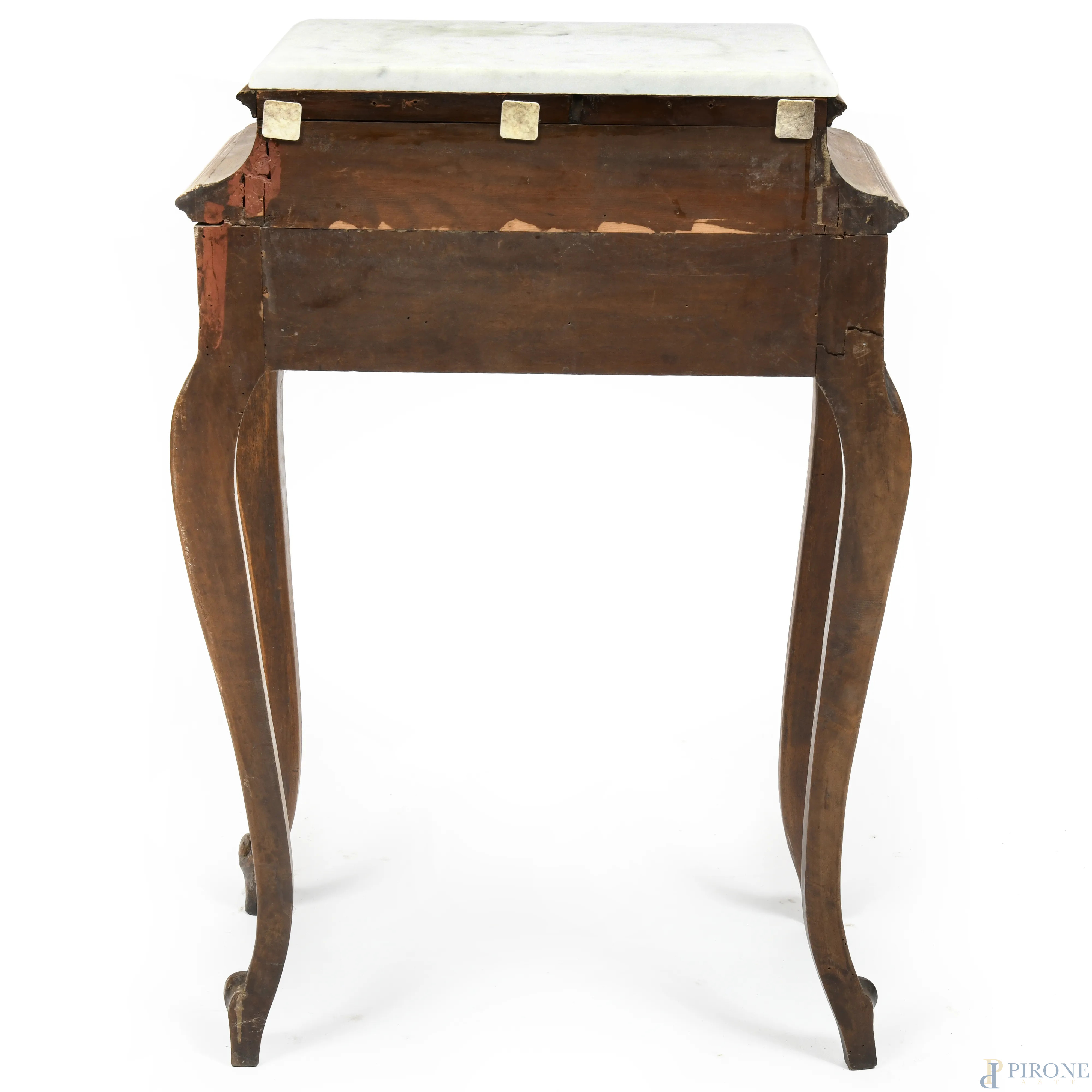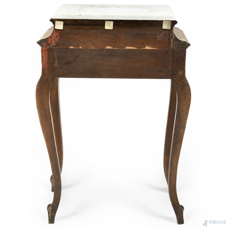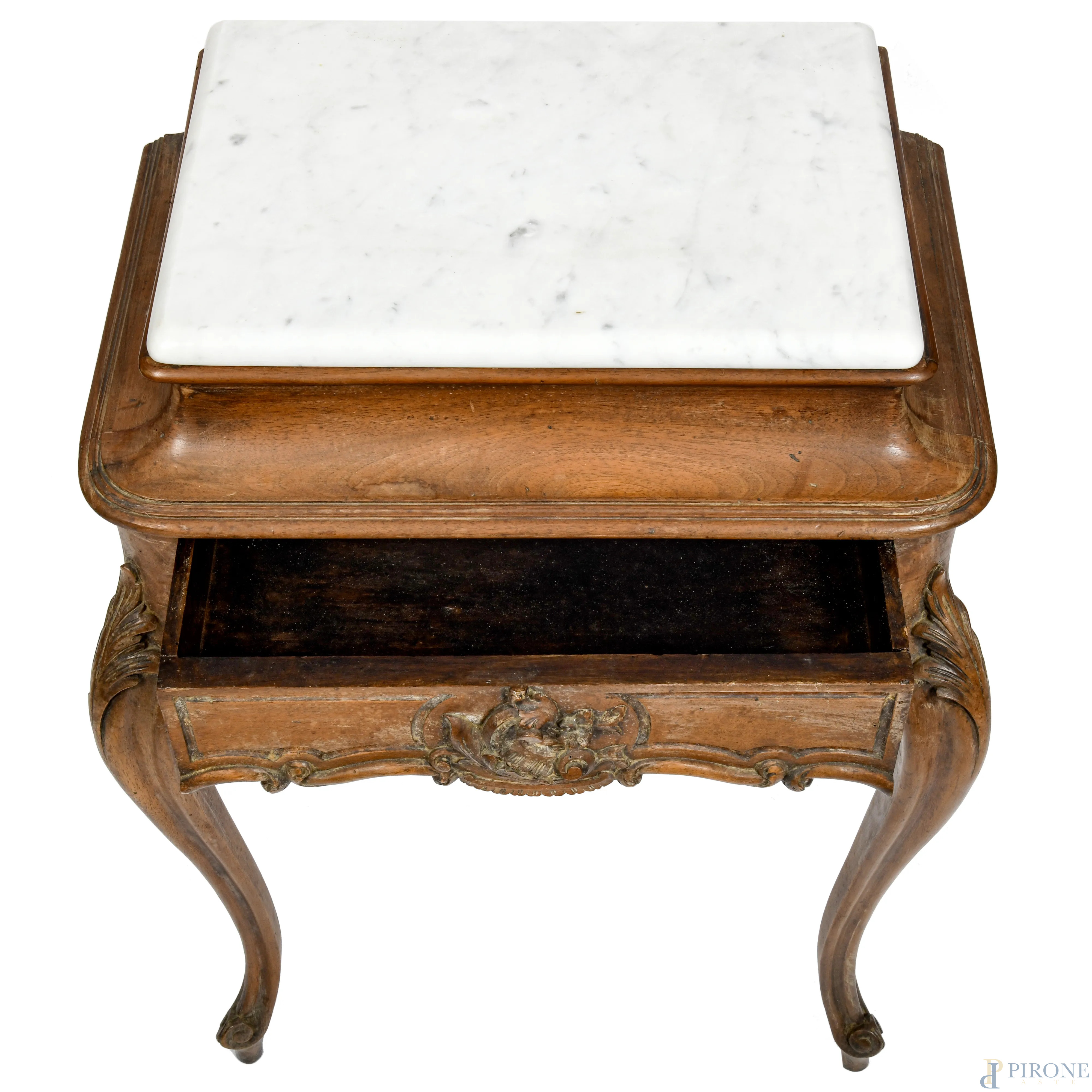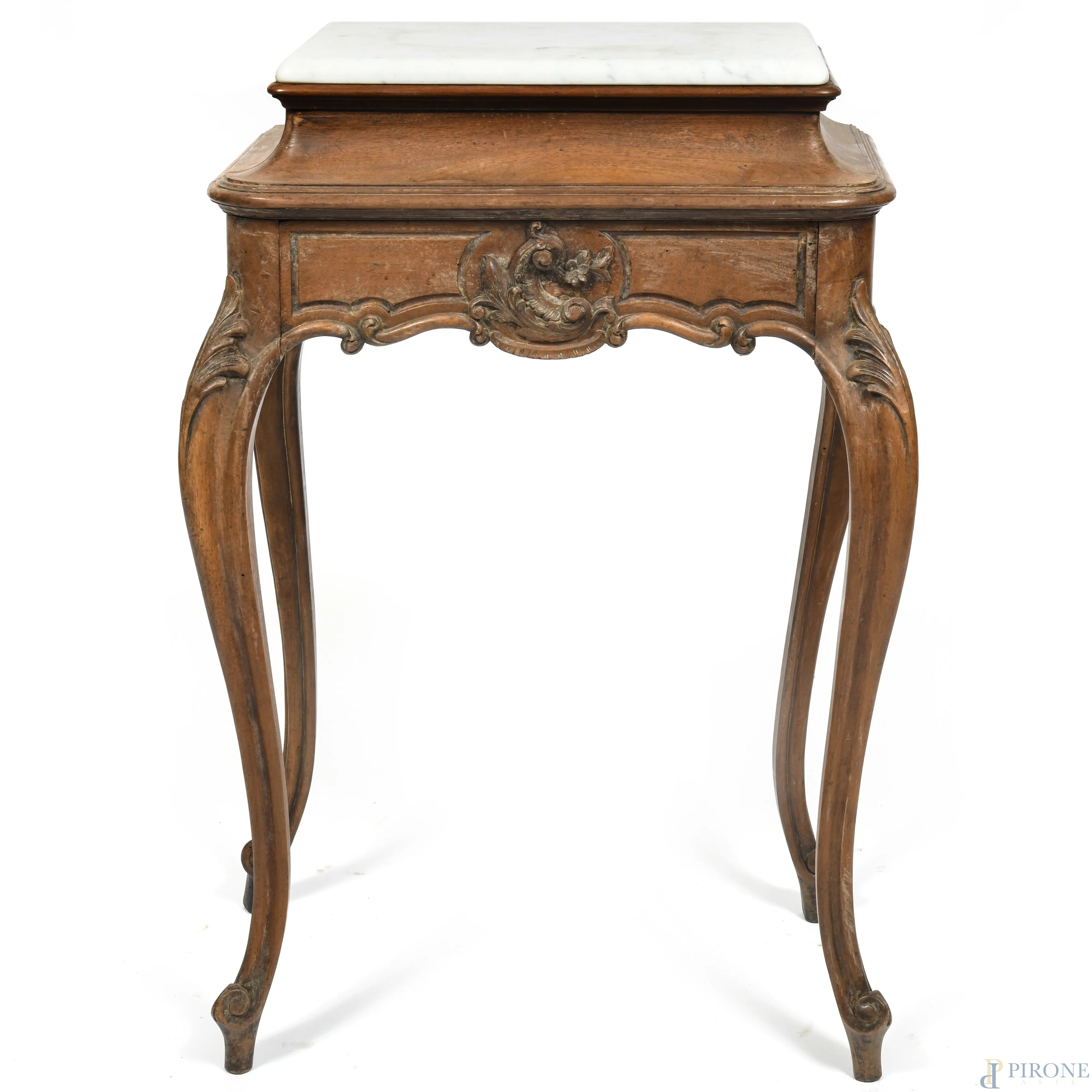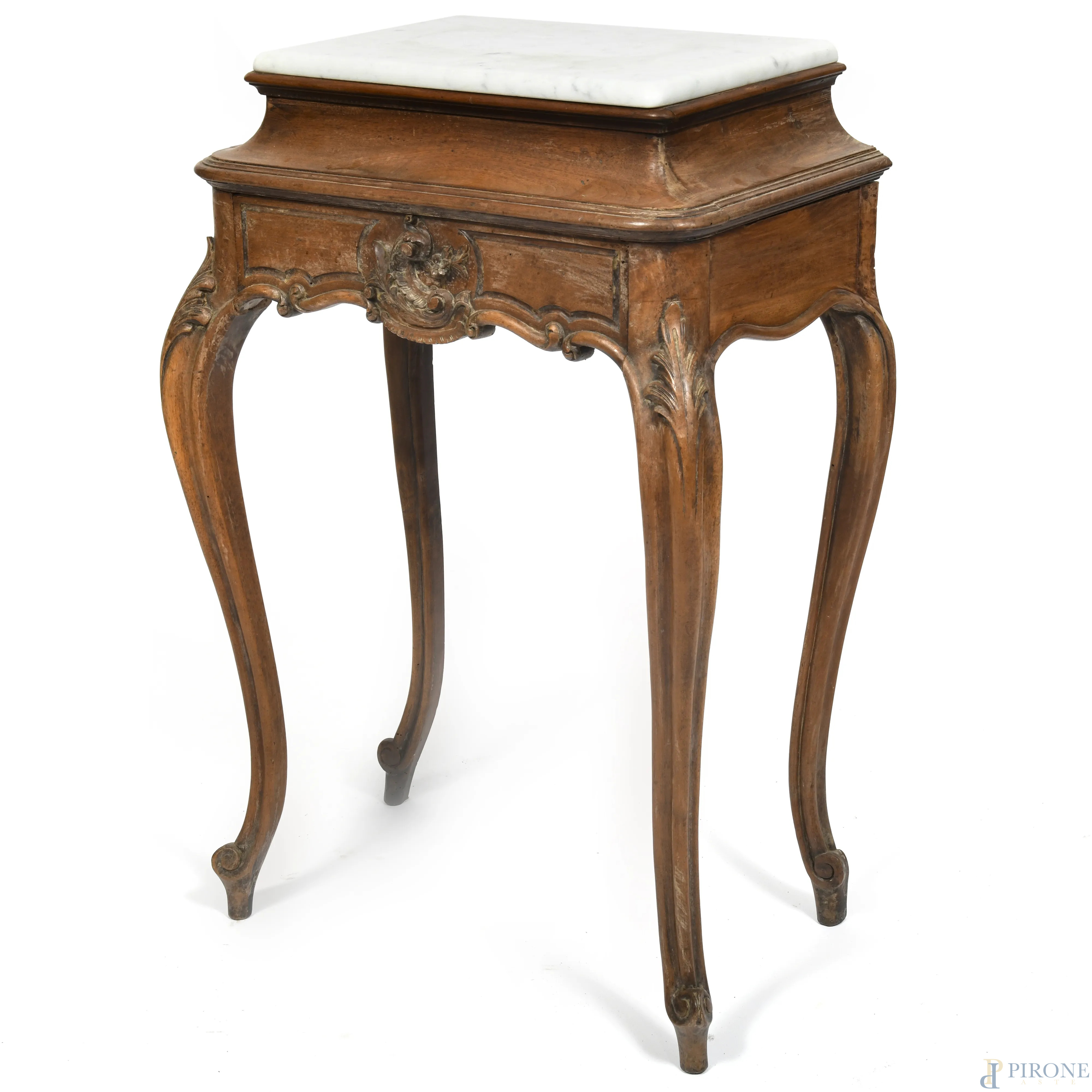 Tavolino in noce intagliato a volute vegetali, con piano in marmo e gambe mosse, XIX secolo, cm 91x62x37, (segni di usura del tempo, scalfiture, difetti)