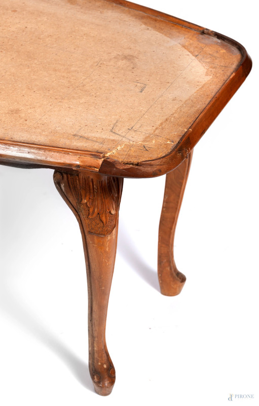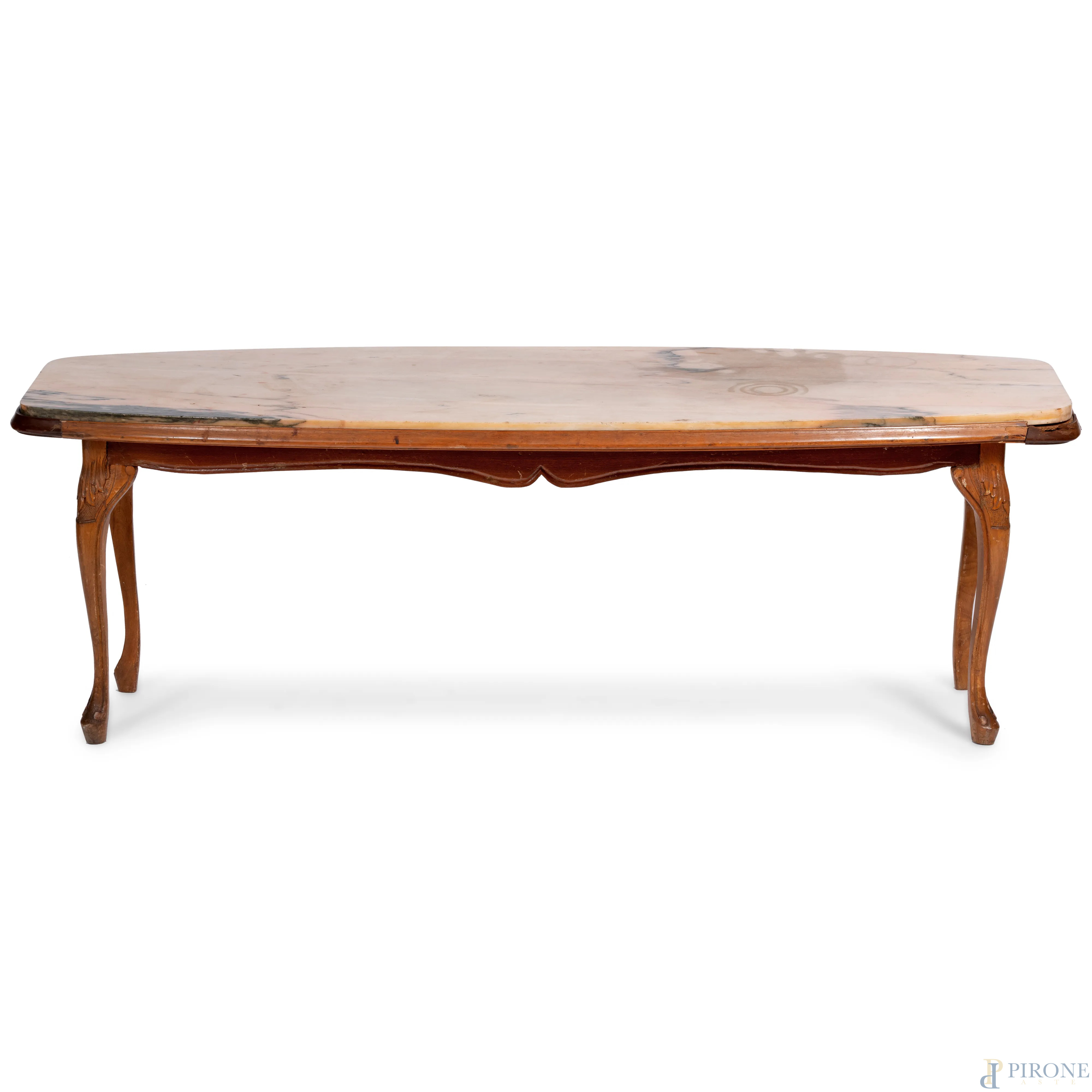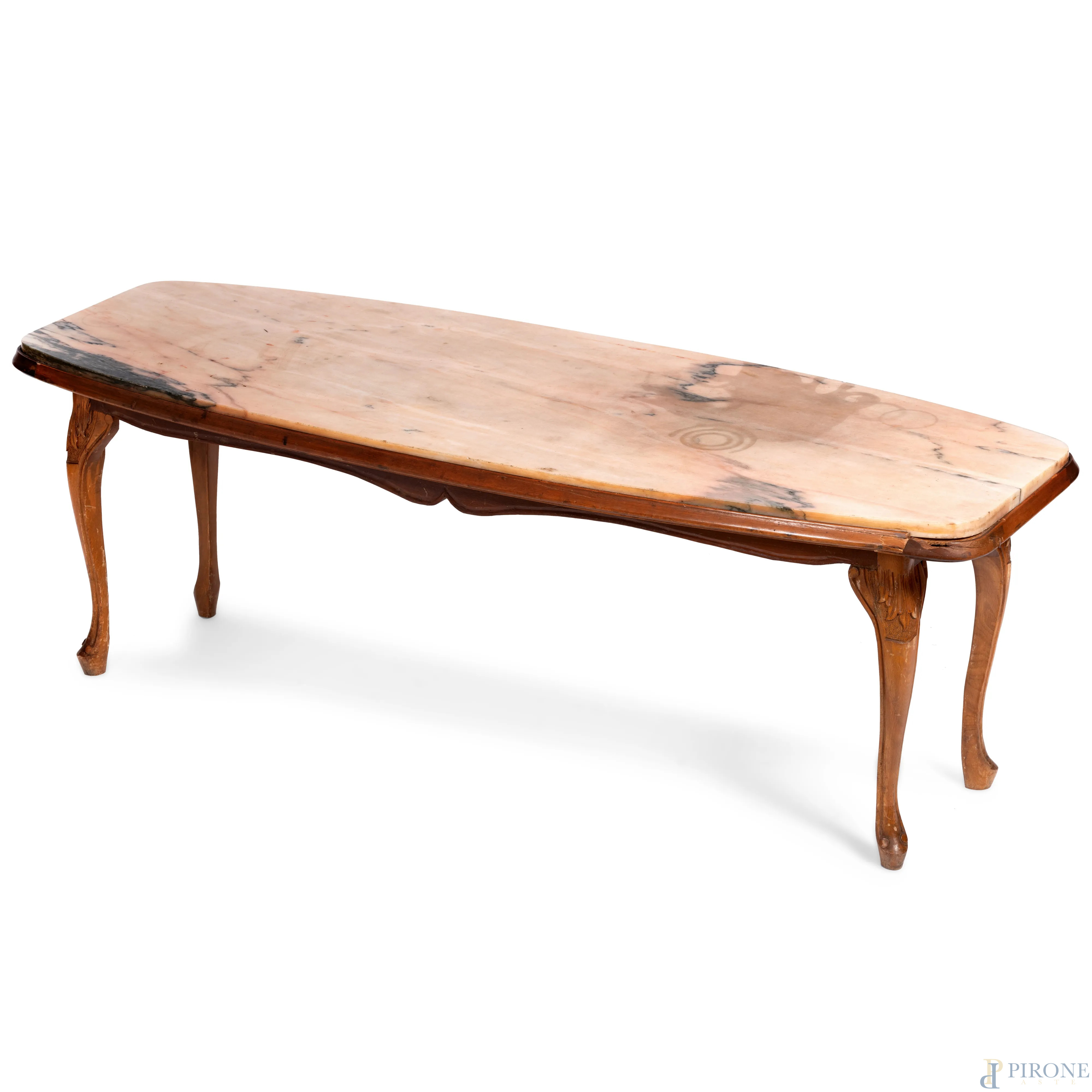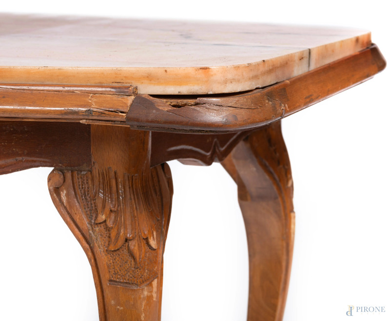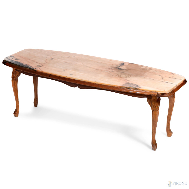 Tavolo basso con piano in marmo con struttura in legno impiallacciato poggiante su gambe mosse, XX secolo, cm 49x145,5x53,5 , (rotture, difetti, scalfiture, graffi)