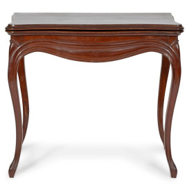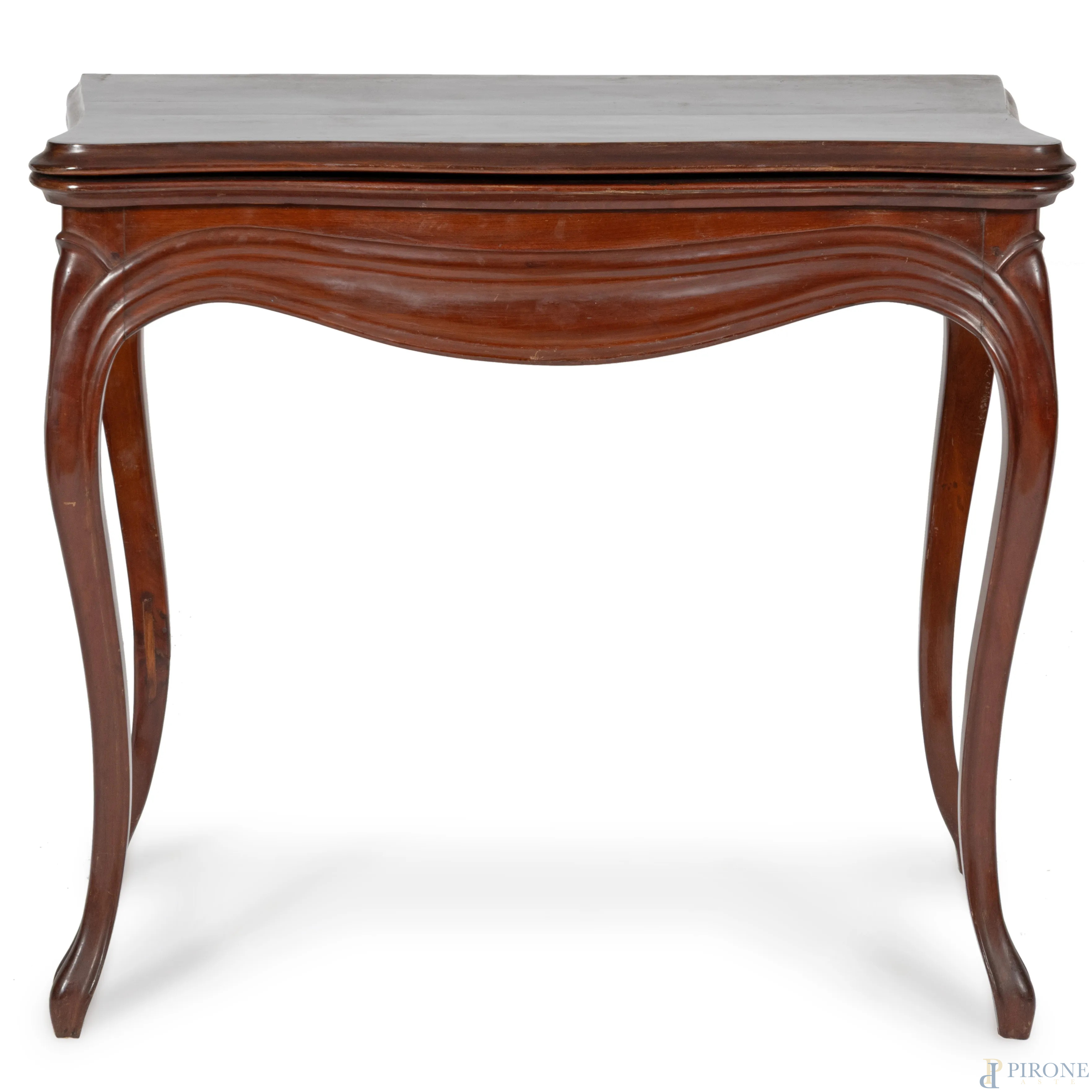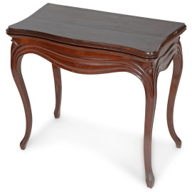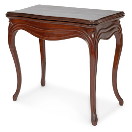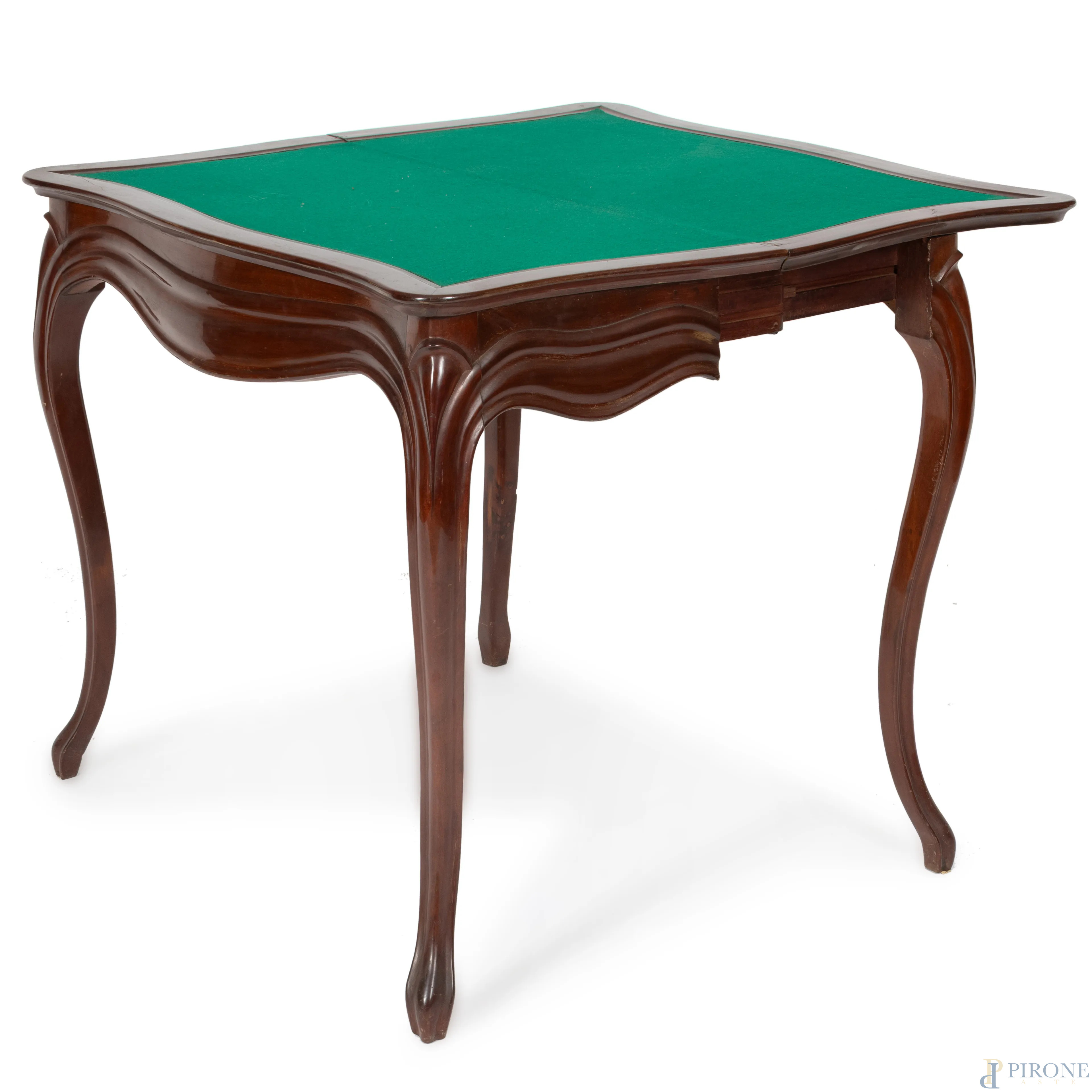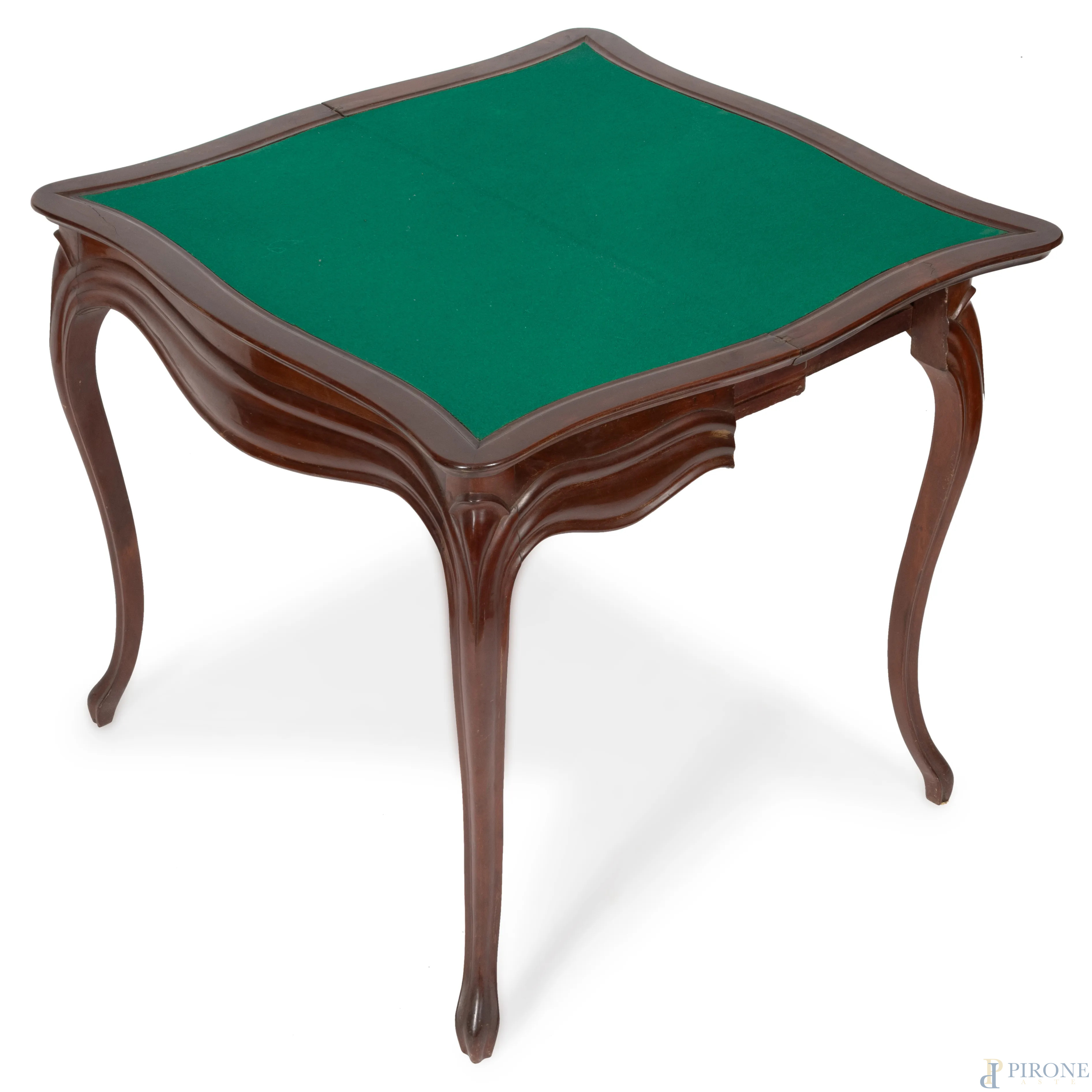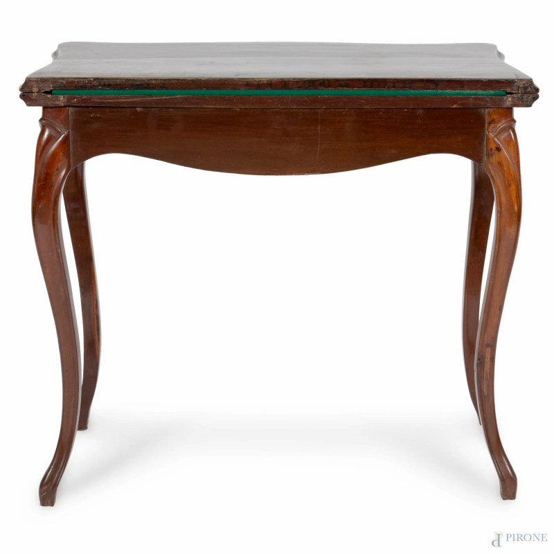 Tavolo da gioco in mogano con piano apribile rivestito in velluto verde, XIX secolo, cm 76x85x43, aperto cm 76x85x84, (segni di usura, scalfiture, difetti)