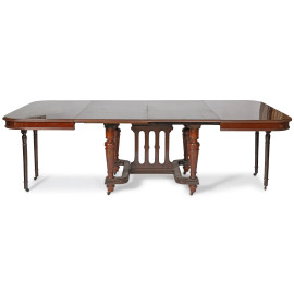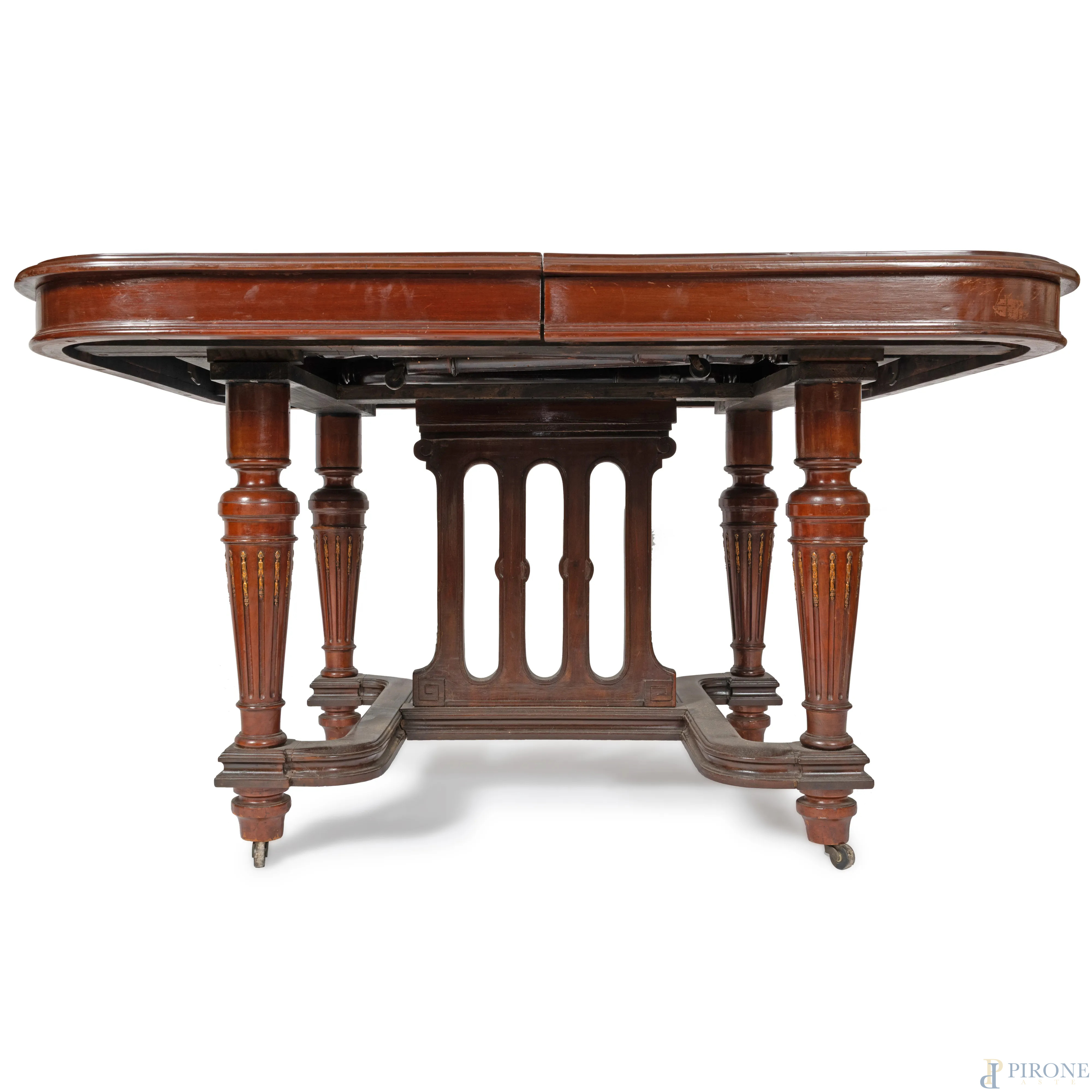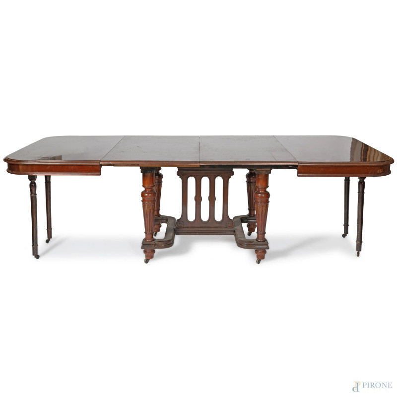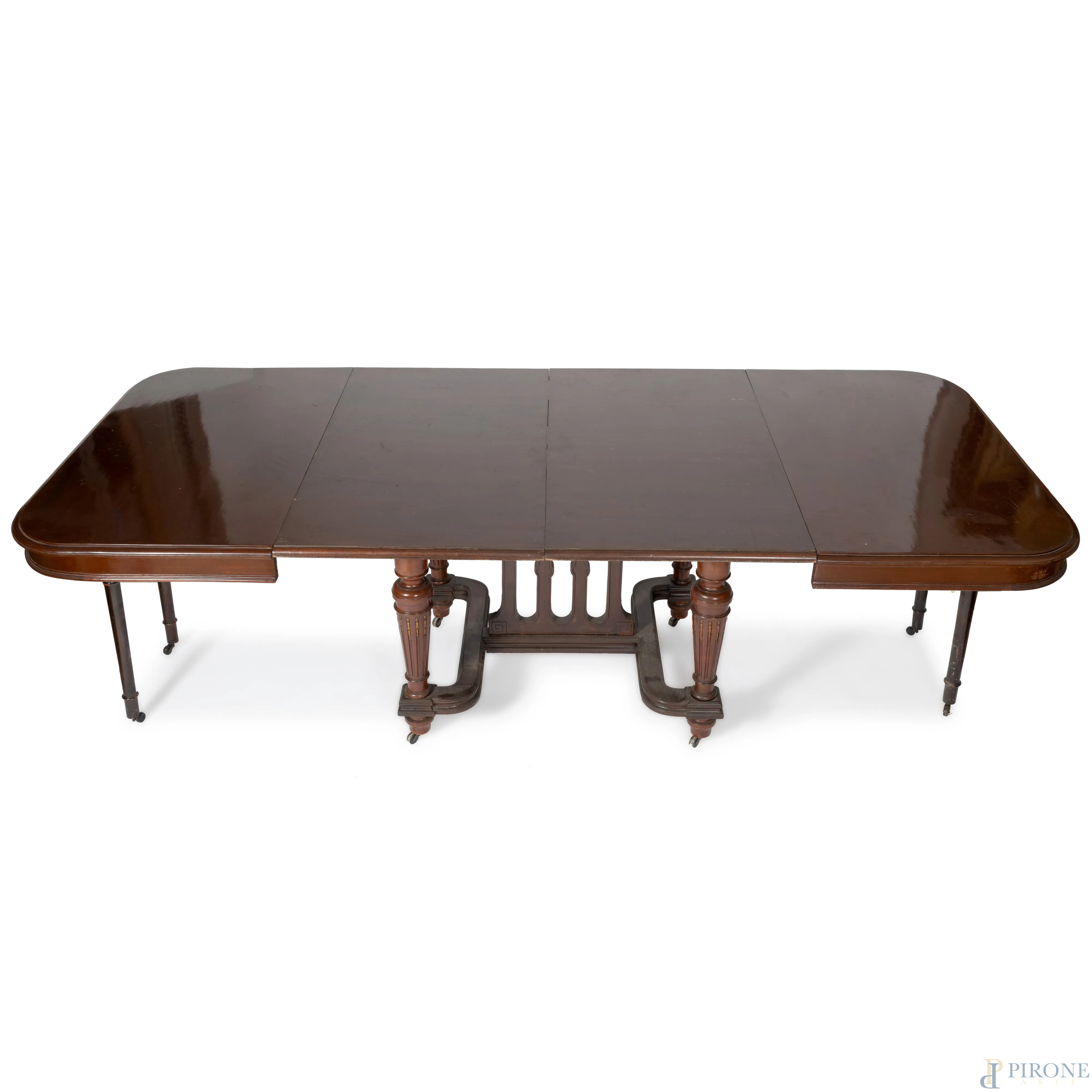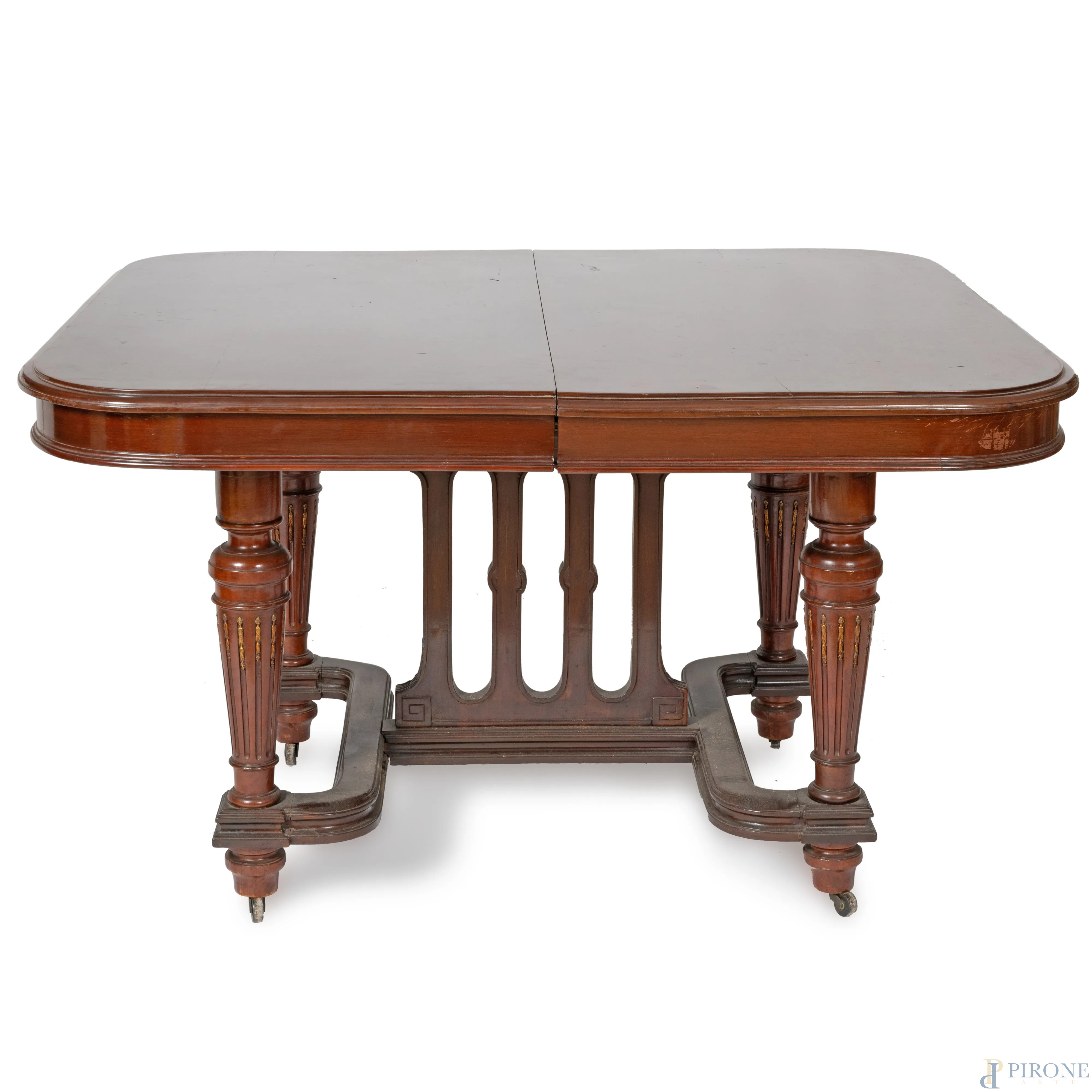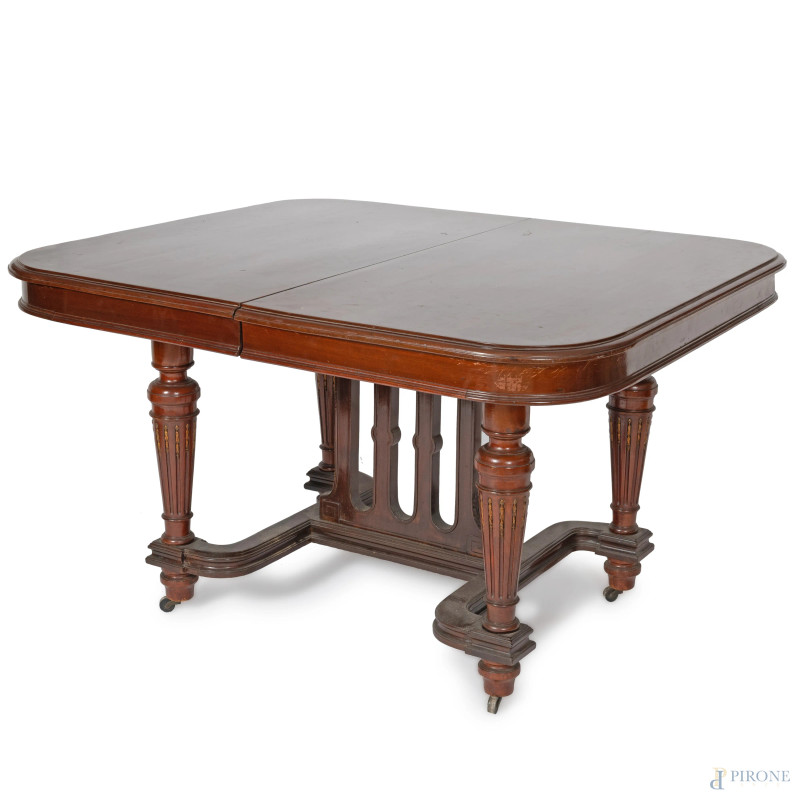 Tavolo in mogano con quattro gambe tornite, munite di rotelle e raccordate da elemento a balaustra, inizi del XX secolo, cm 78x128x113. Corredato di 2 prolunghe, cm 60,5 cad., (segni di usura, graffi, scalfiture)