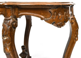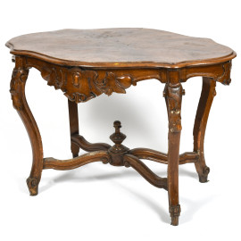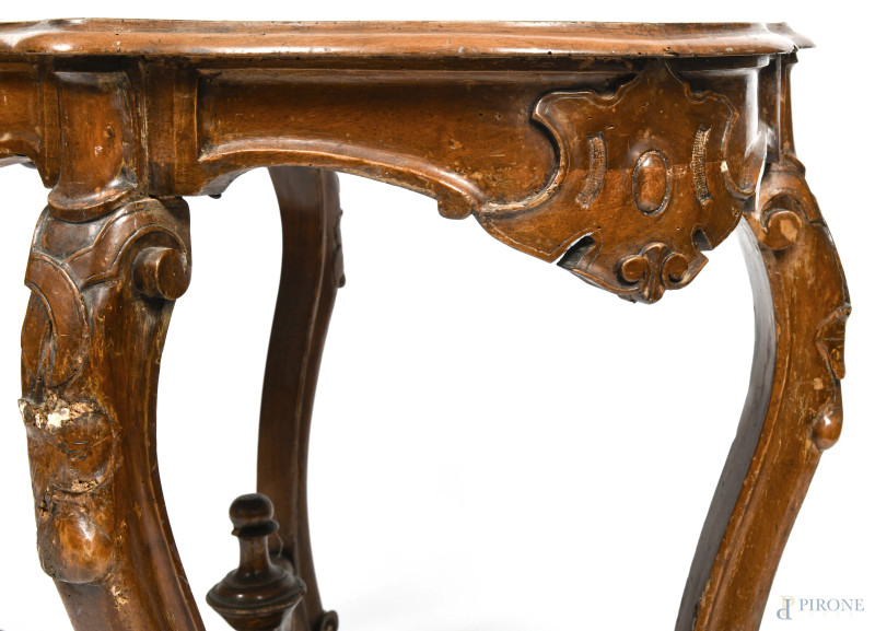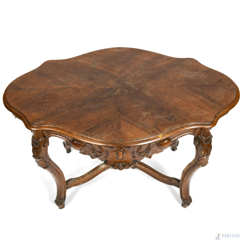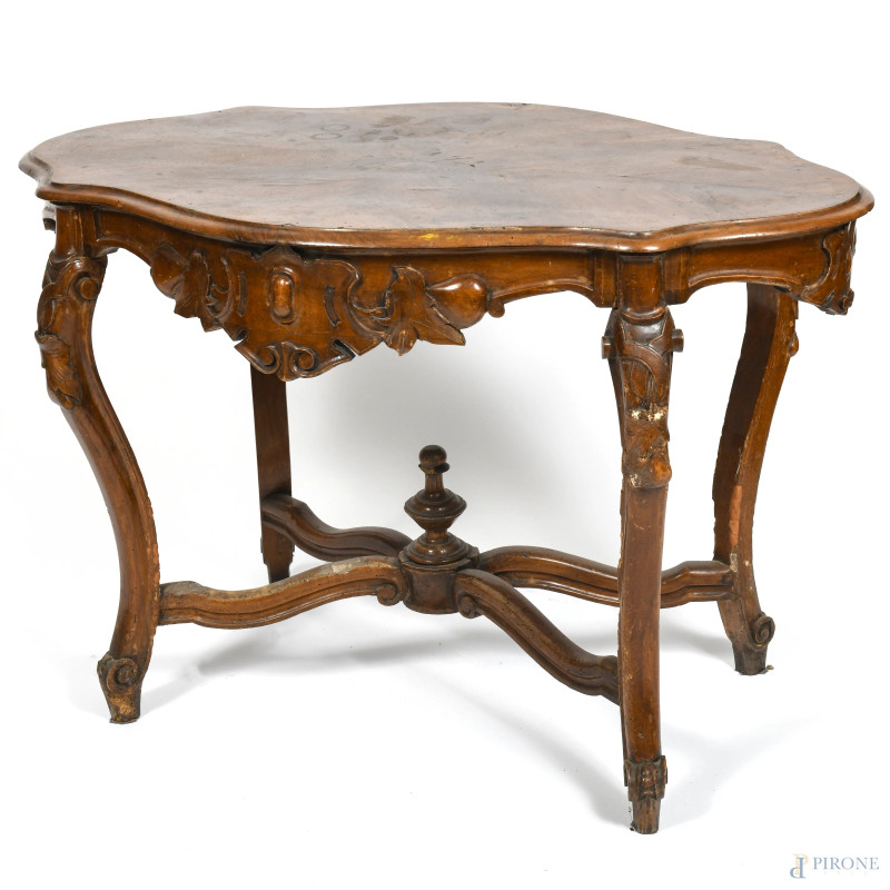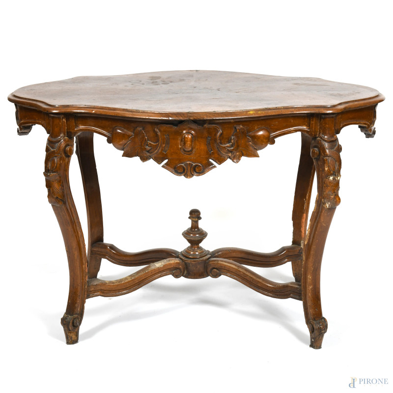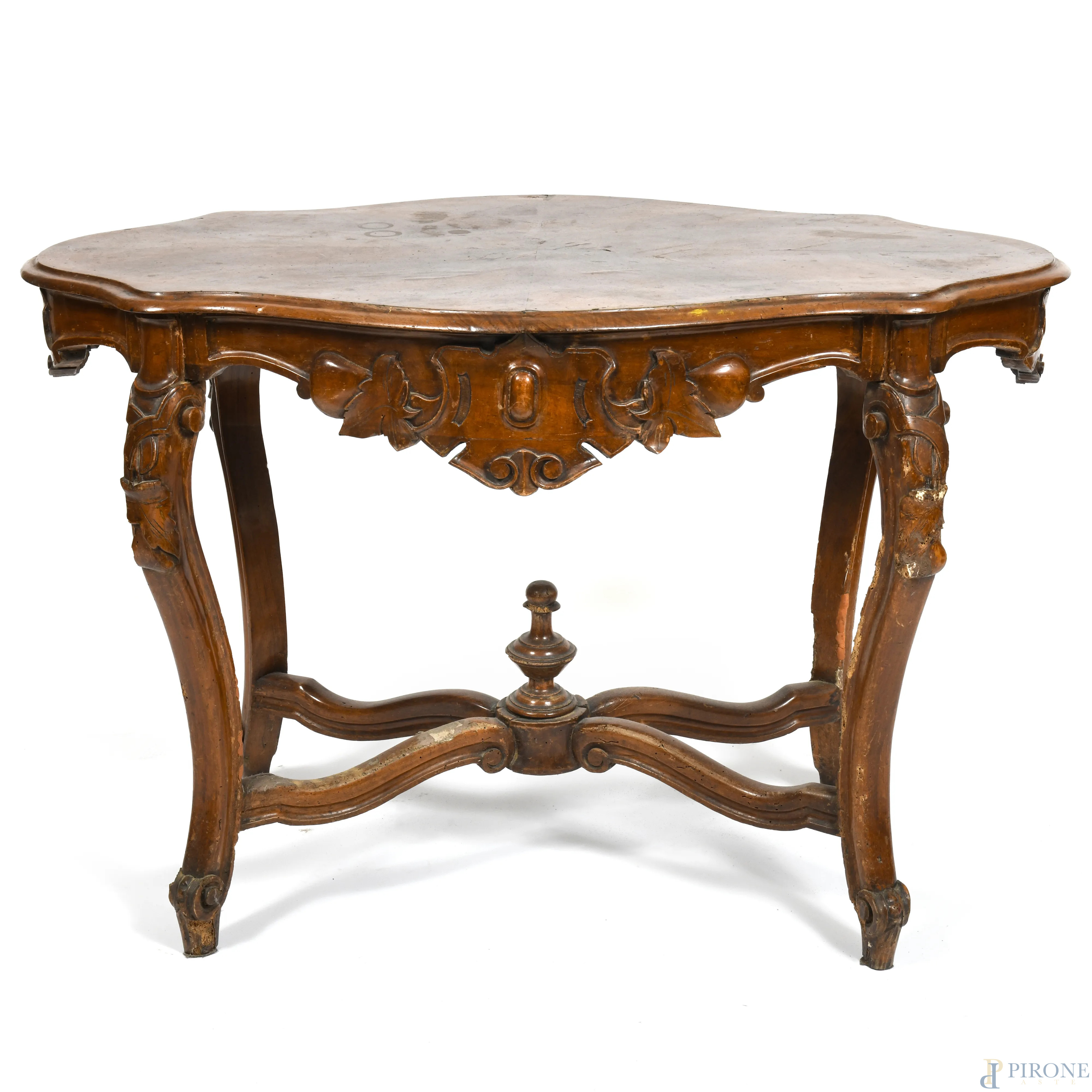 Tavolo in noce con gambe mosse raccordate da traverse ad elemento centrale, XIX secolo, cm 80x119x78, (segni di usura, graffi, abrasioni, scalfiture, fori di tarlo, difetti)