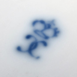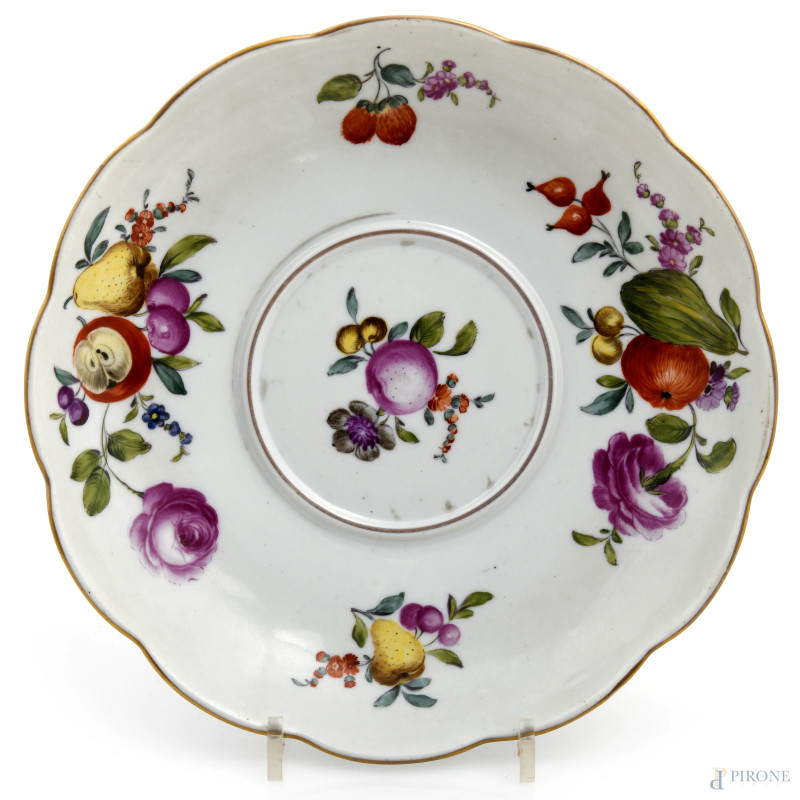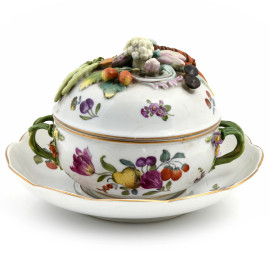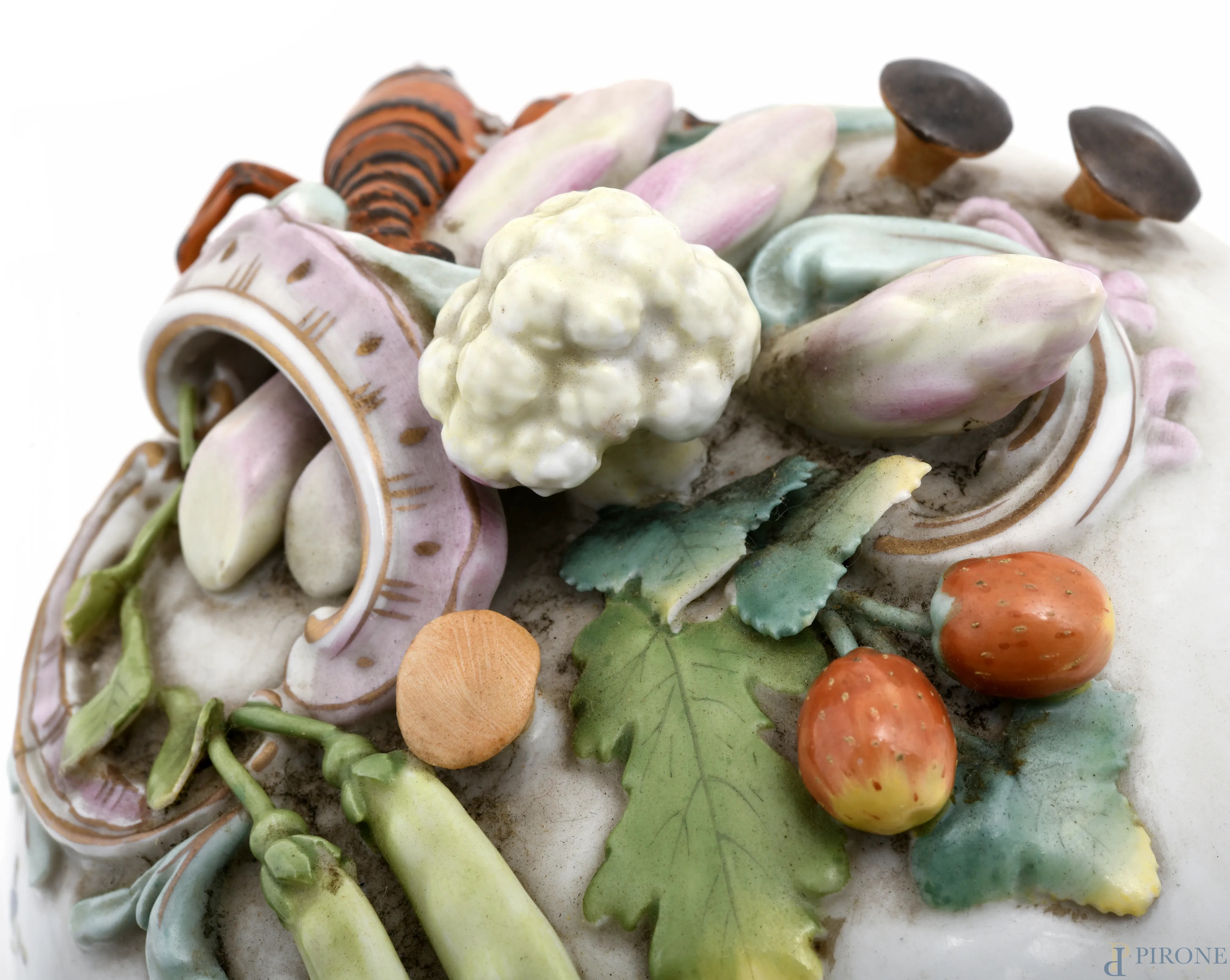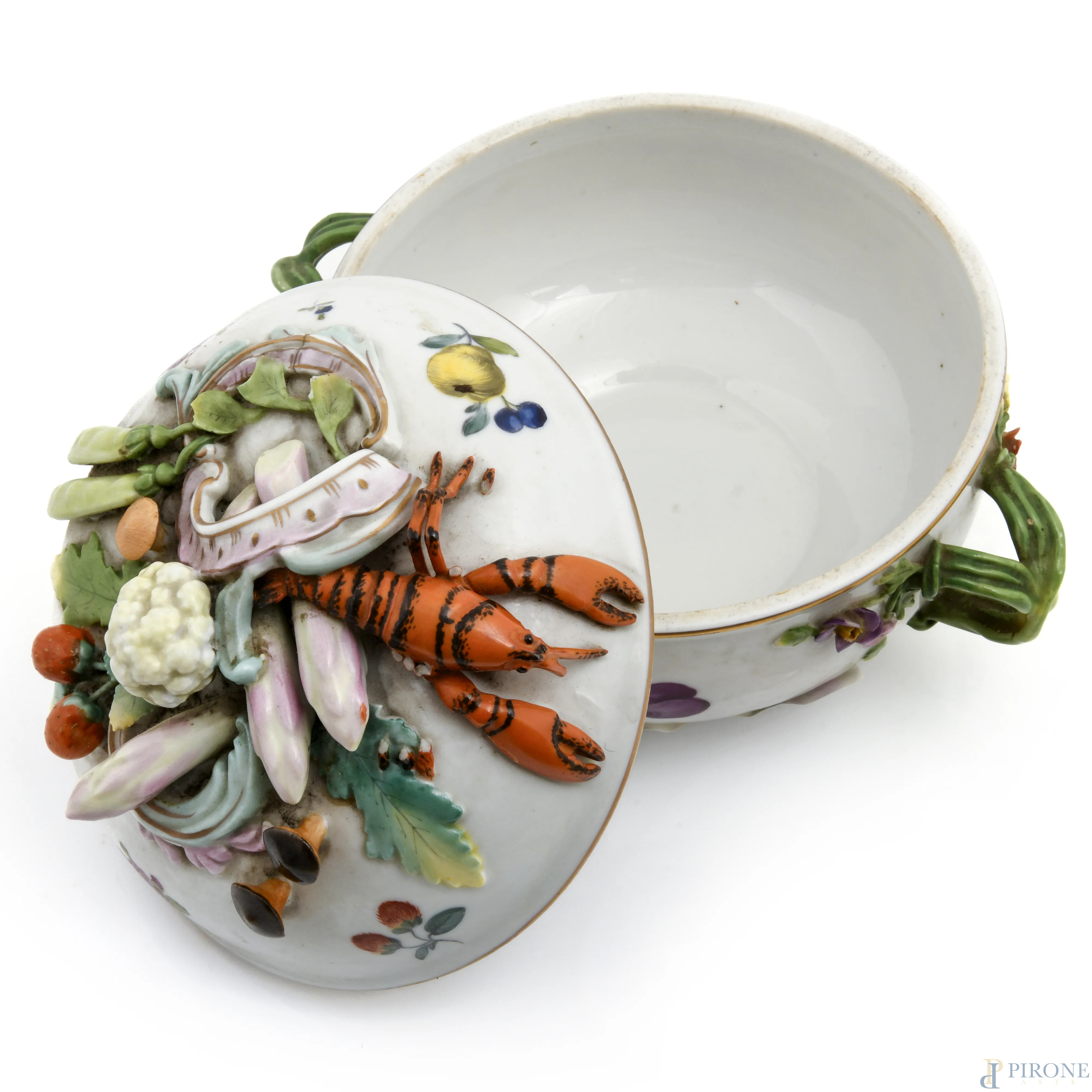 Tazza da brodo e piatto in ceramica Dresda con coperchio a ricchi decori a rilievo di ortaggi e crostacei, XX secolo, altezza cm 13