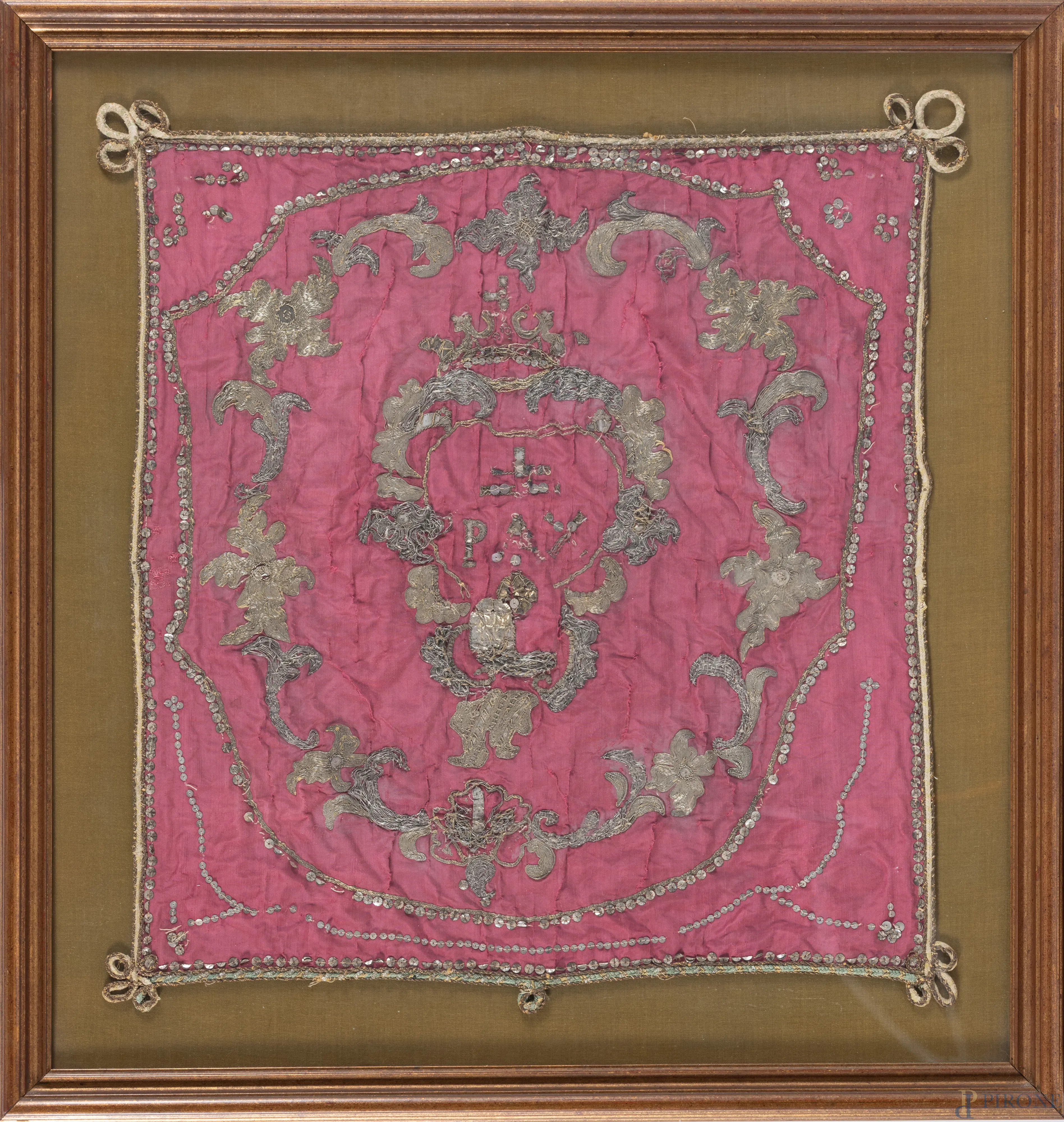 Tessuto con ricami, XIX secolo, cm 55,5x53, entro cornice (segni di usura, difetti)
