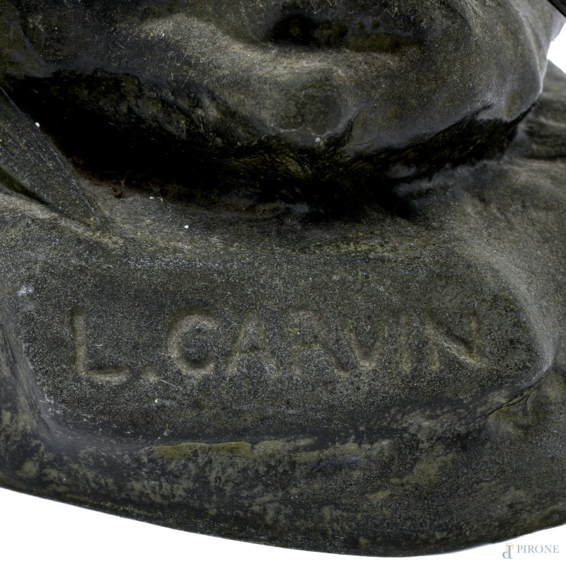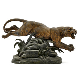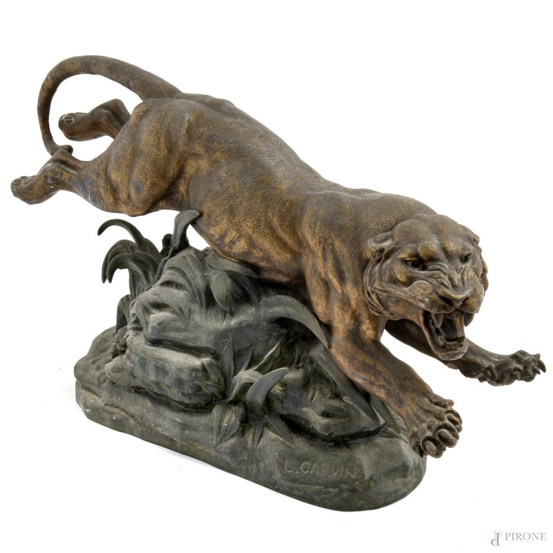 Tigre, XX secolo, scultura in antimonio, cm 33x54x14, firmata, (lievi segni di usura)