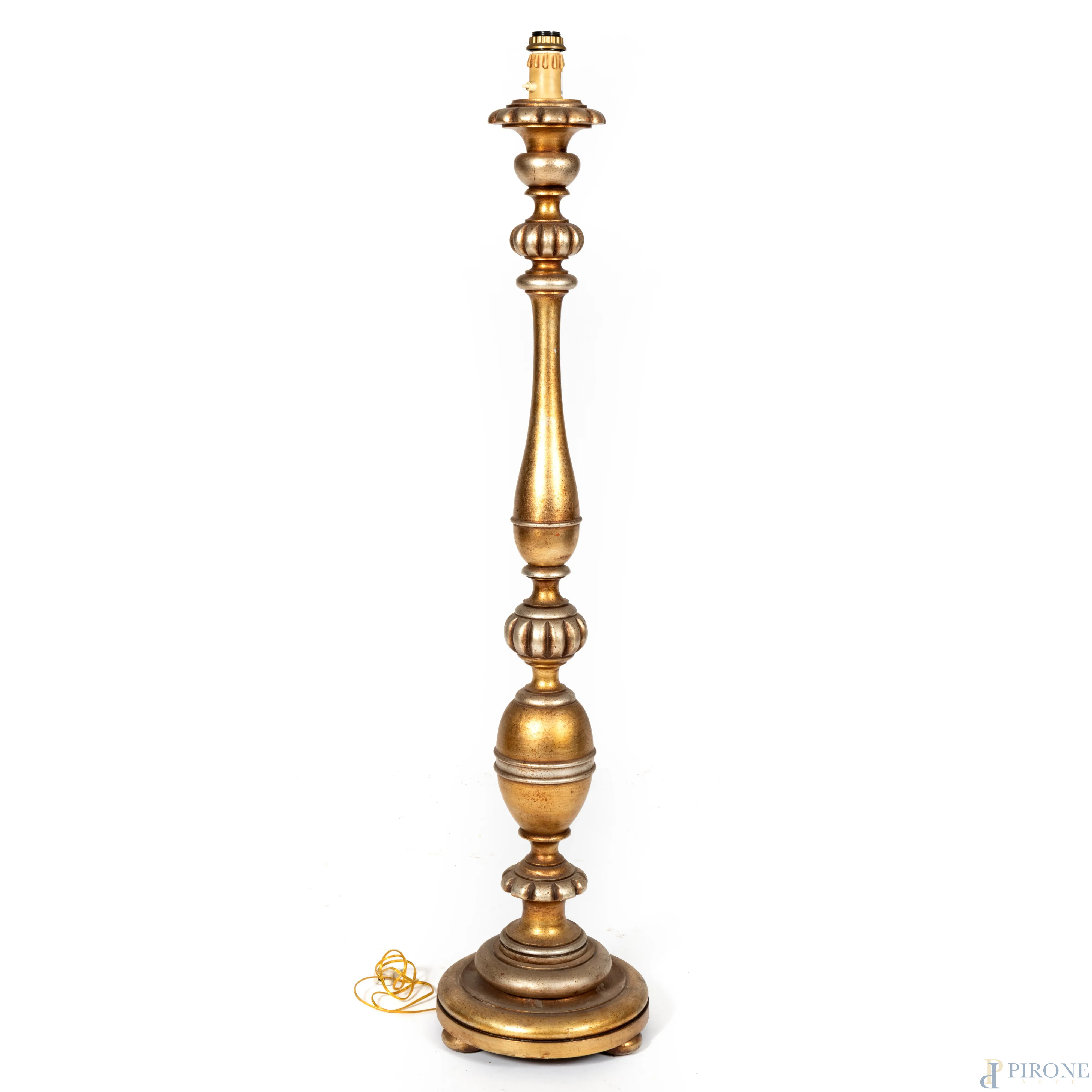 Torciere in legno dorato montato a lampada, XX secolo, altezza cm 144, (segni di usura, difetti, cadute di doratura, da revisionare)
