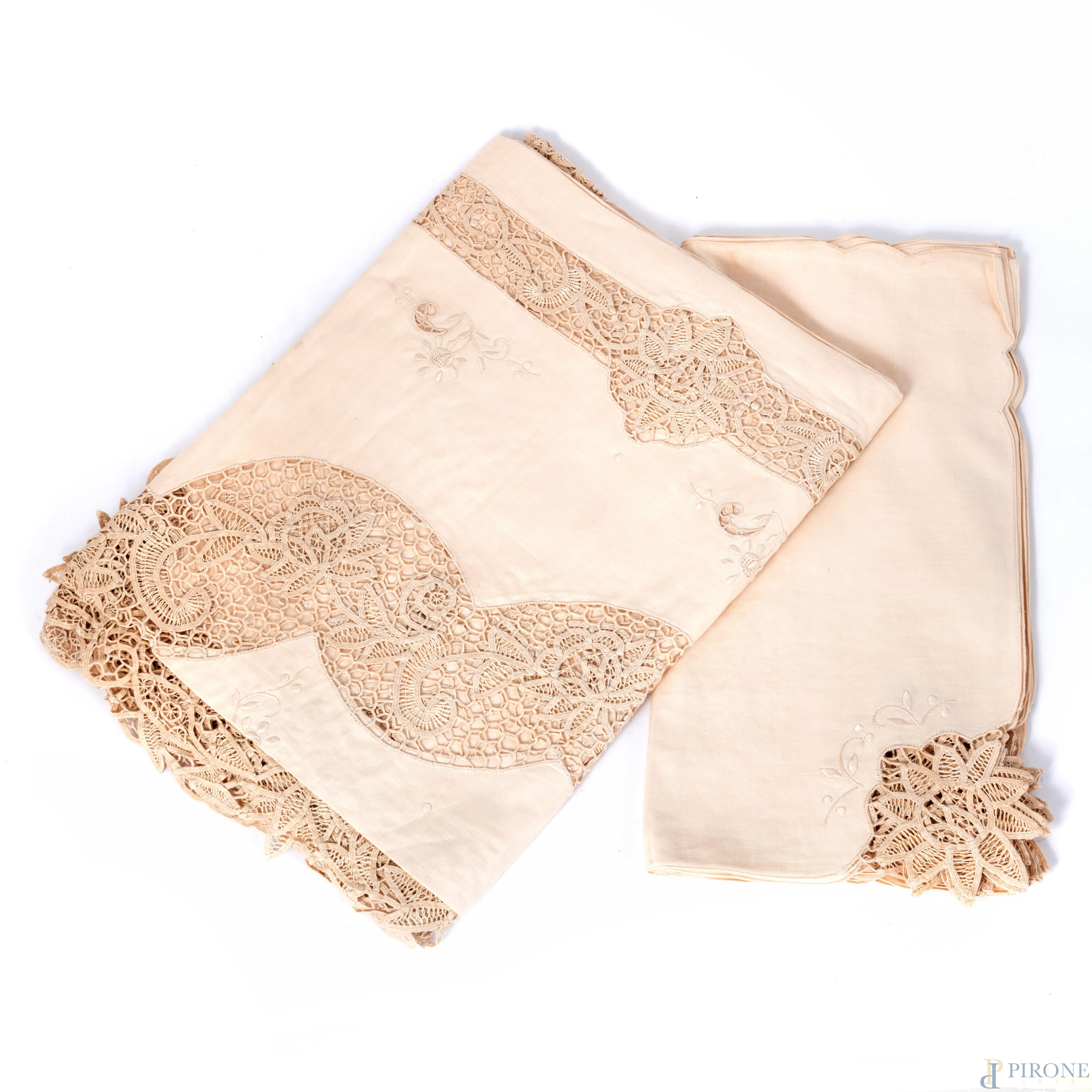 Tovaglia ricamata a mano e 12 tovaglioli, XX secolo, (segni di usura)