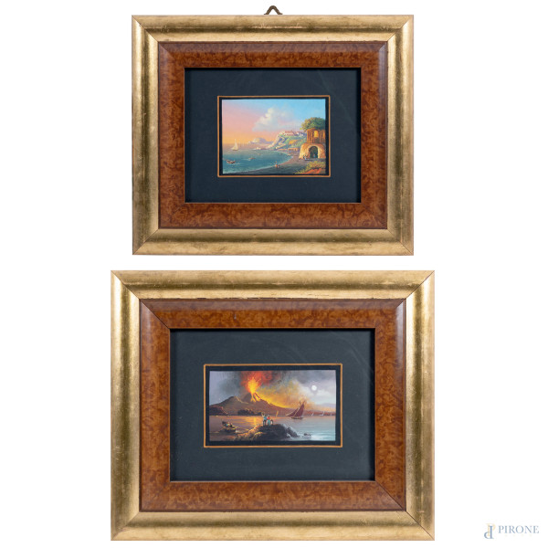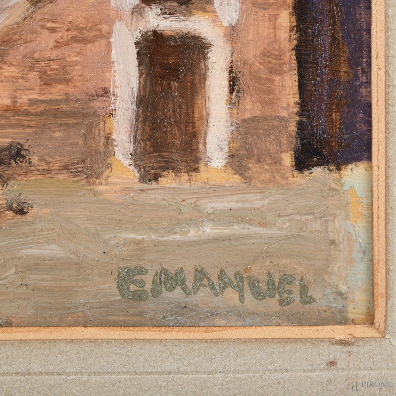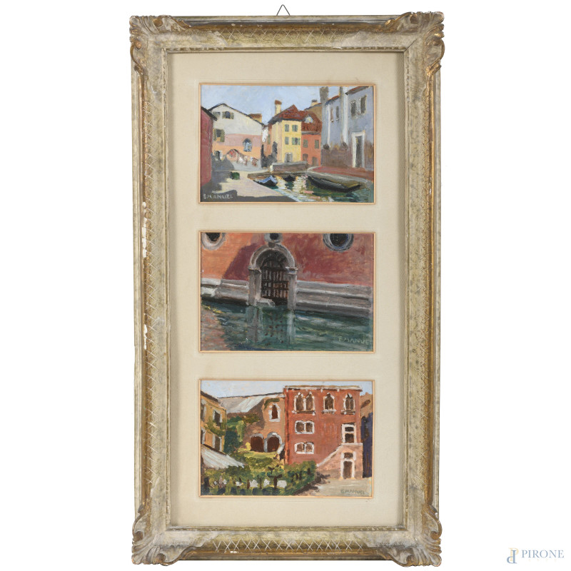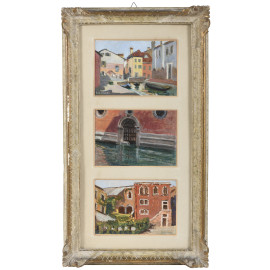 Tre scorci di paese, XX secolo, olio su compensato, entro passepartout tripartito, cm 61,5x31,5, firmati, entro cornice , (supporto imbarcato)