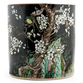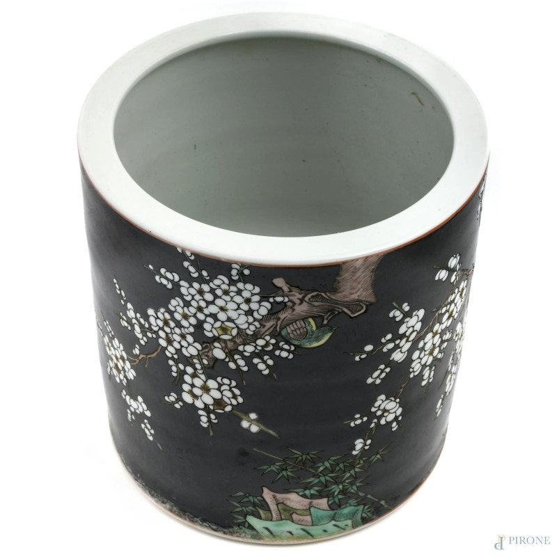 Vaso fioriera in ceramica dipinta a fondo nero con paesaggio. Cina, XX secolo, cm 22,5x22, (lievi segni di usura)