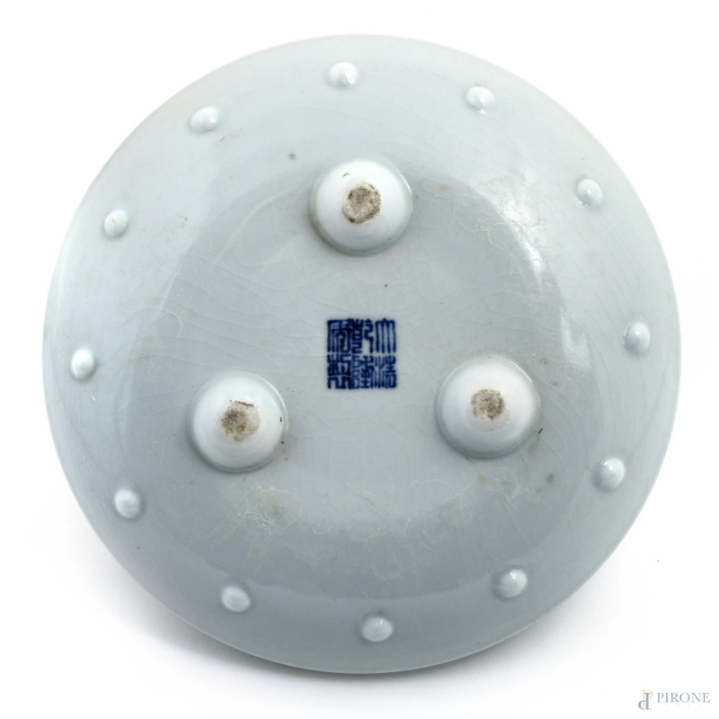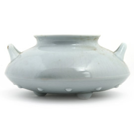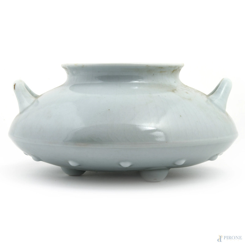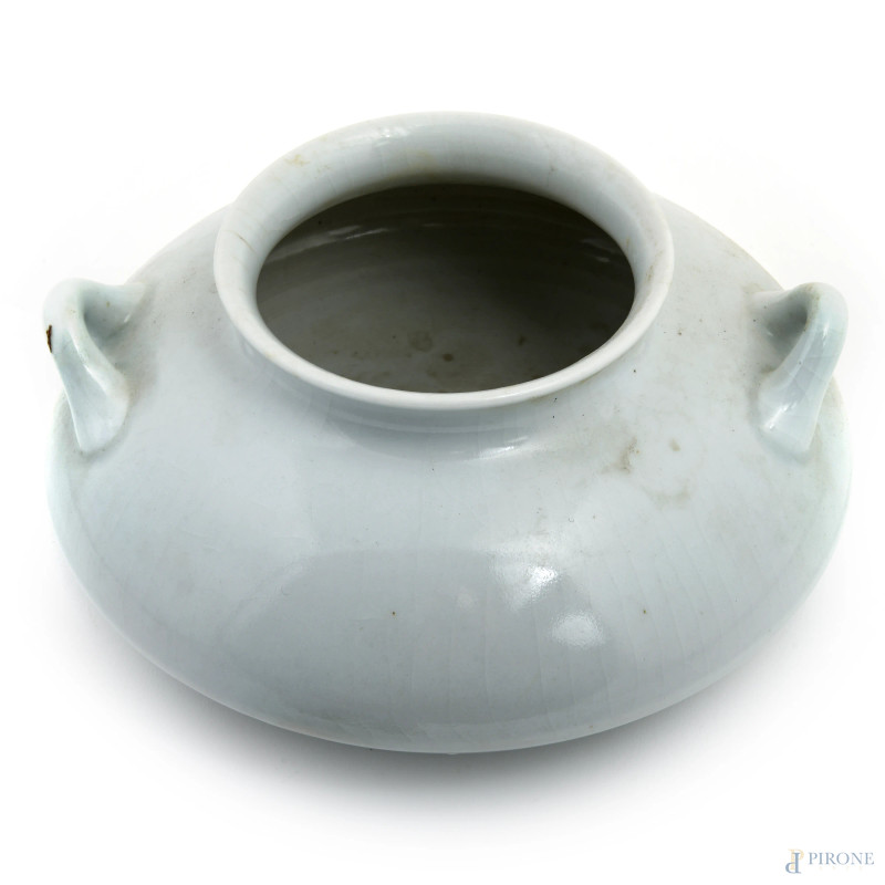 Vaso in porcellana bianca a doppia presa. Cina, XX secolo, cm 12x20, (craquelure, lievi segni di usura)