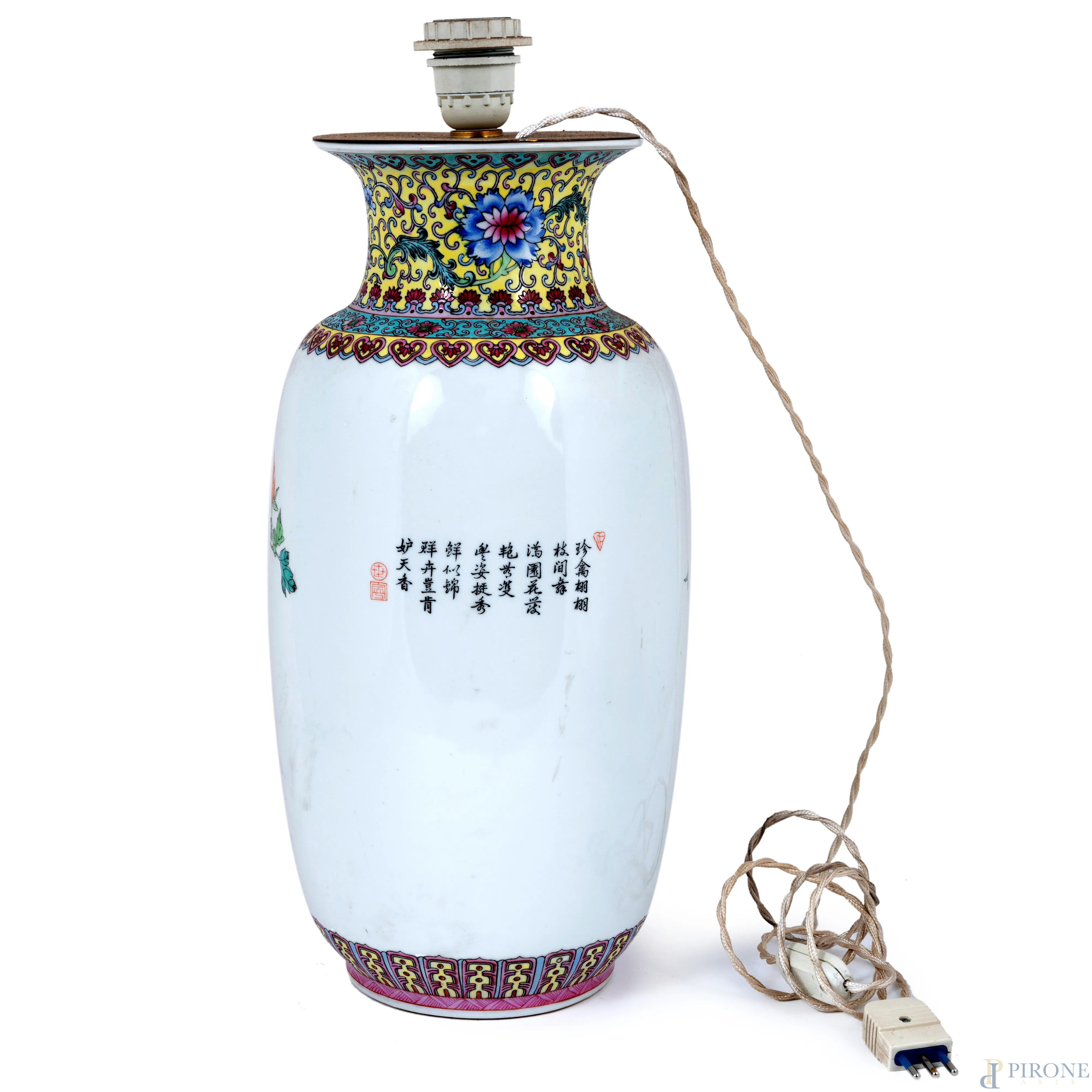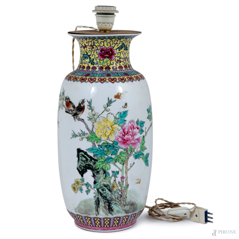Vaso in porcellana montato a lampada decorato a motivi floreali e volatili, Cina, XX secolo, altezza cm 43,5, (lievi difetti di cottura e usura del tempo, da revisionare)