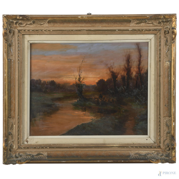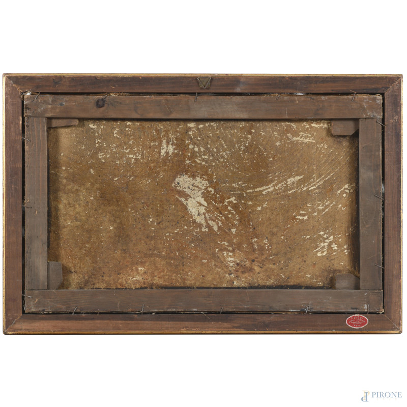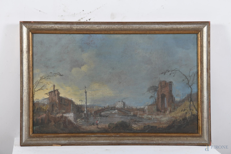 Veduta con architetture, XX secolo, olio su tela, cm 34,5x56,5, entro cornice, (lievi segni di usura)