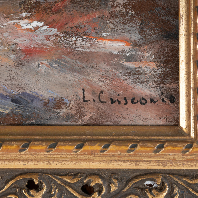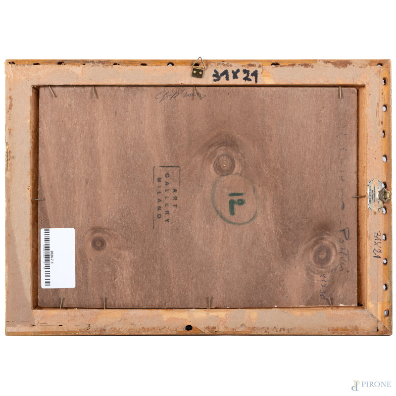 Veduta di paese., XX secolo, olio su compensato, cm 30x21,5, firmato in basso a destra, entro cornice, (difetti)