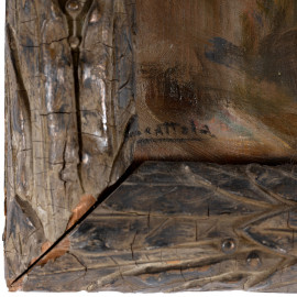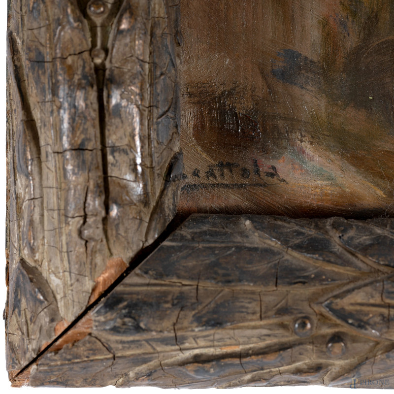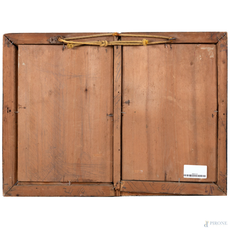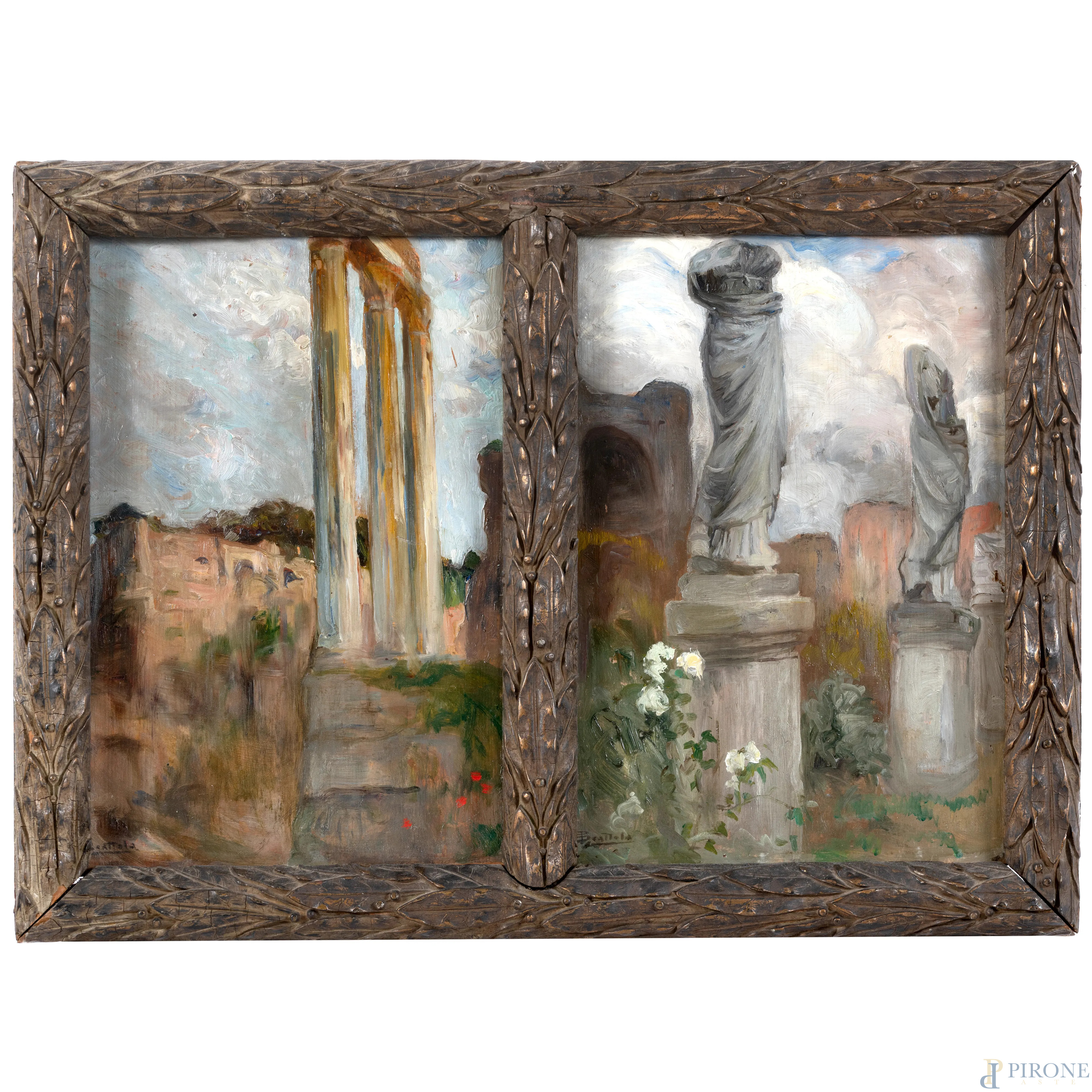 Veduta di rovine archeologiche, XX secolo, olio su doppia tavoletta entro cornice bipartita, firmato, misure complessive cm 55,5x40,5, (segni di usura, difetti, supporti imbarcati)