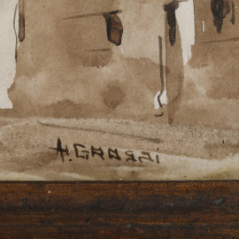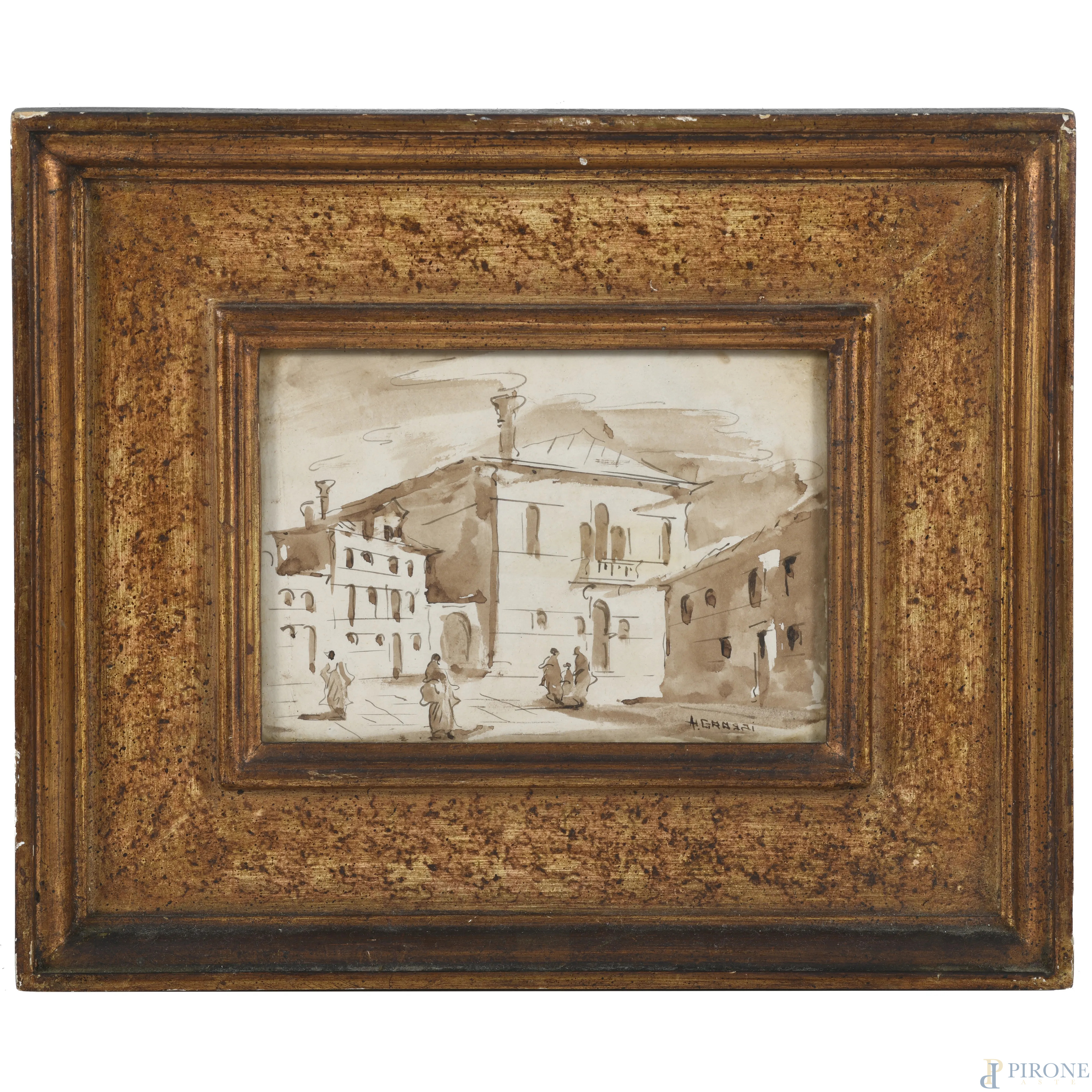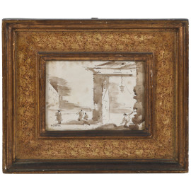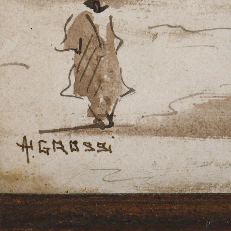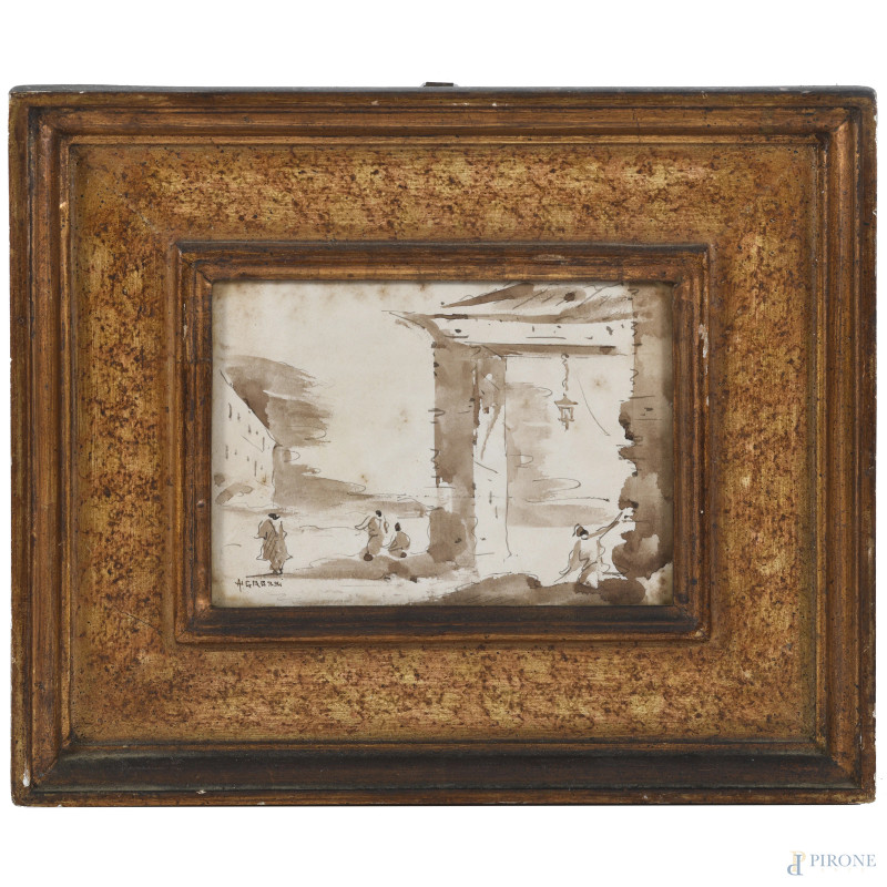 Vedute di paese con figure, XX secolo, tecnica mista su carta, cm 13x18, firmati, entro cornice, (ondulazioni della carta, segni di umidità, foxing, difetti)