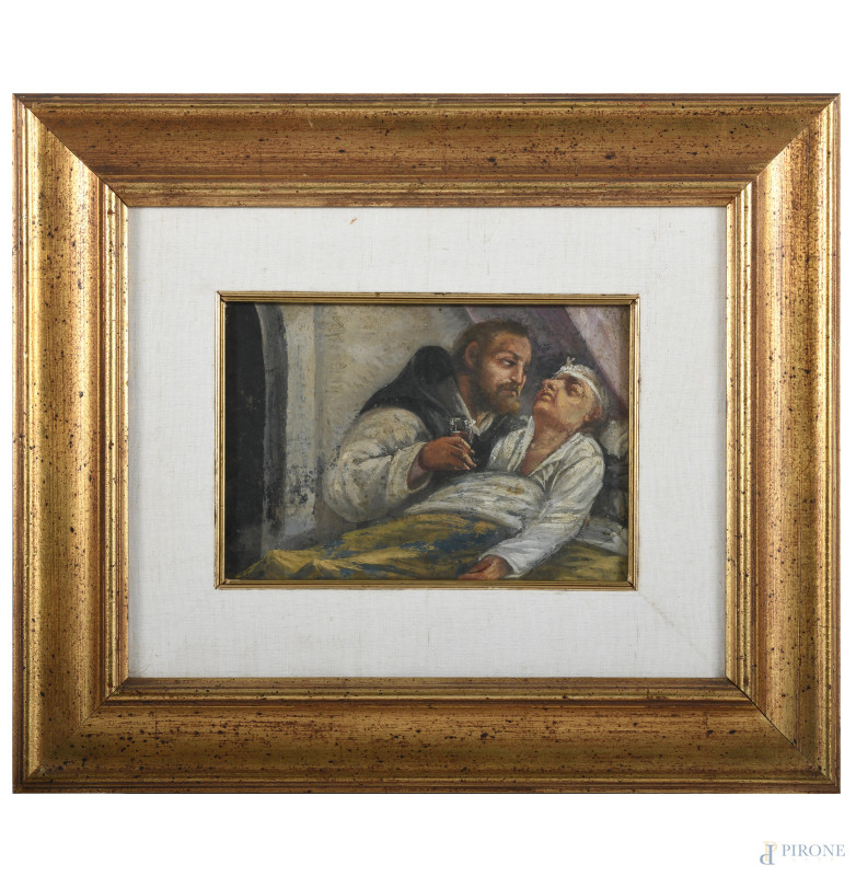 Veglia, olio su cartone, XX secolo, cm 23x35, entro cornice, (lievi segni di usura)