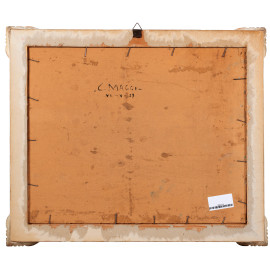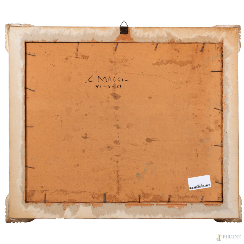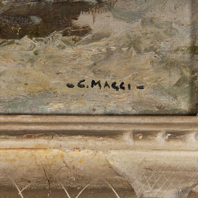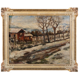 Viale innevato, XX secolo, olio su cartone, cm 40x50, firmato in basso a destra, entro cornice, (segni di usura, difetti)