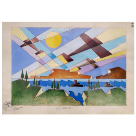 Vittorio Caproni (XX sec.) Aeropittura, tecnica mista su carta, cm 23x33, firma e timbro dell’Artista in basso a sinistra, titolato FUTURAEREI in basso al centro, con cornice