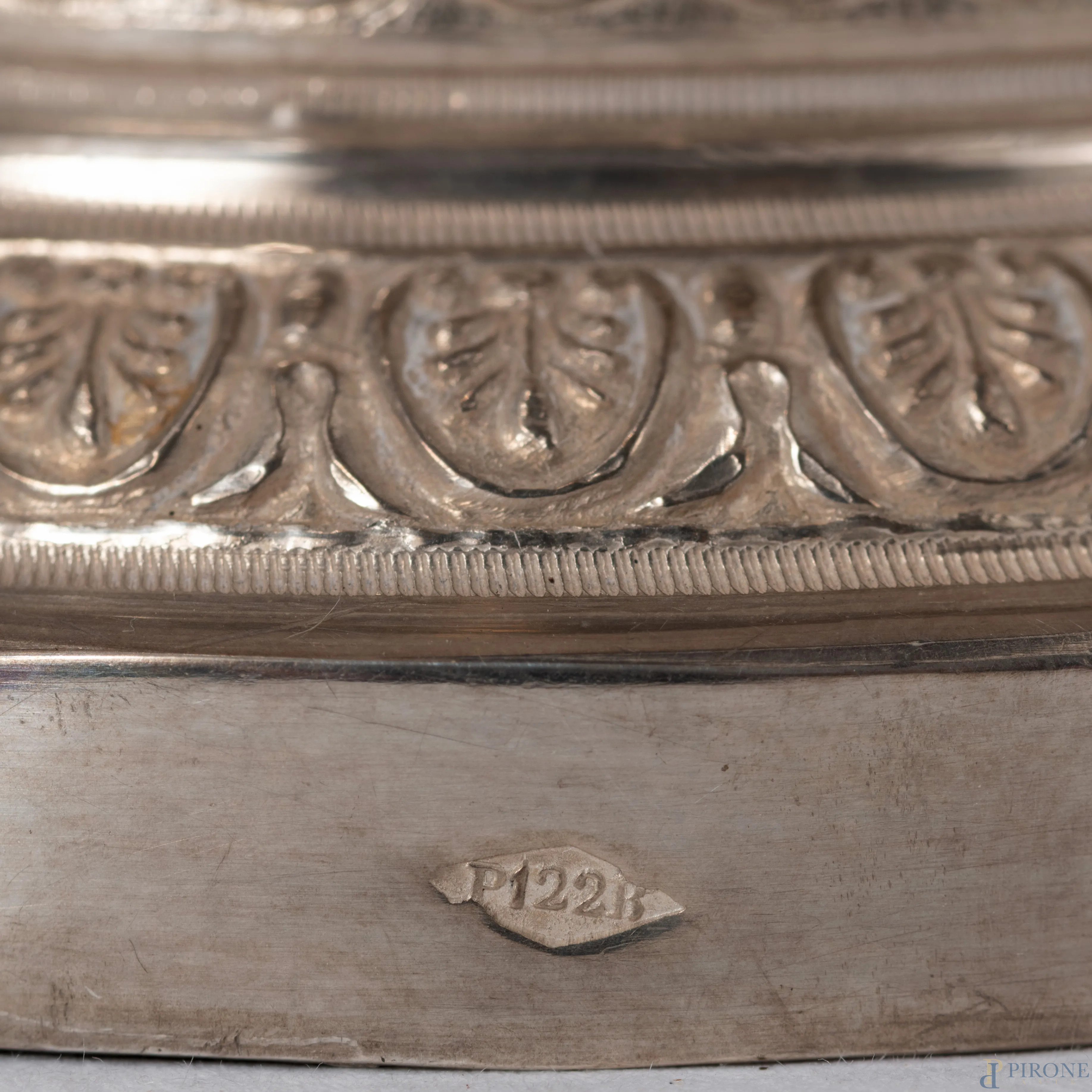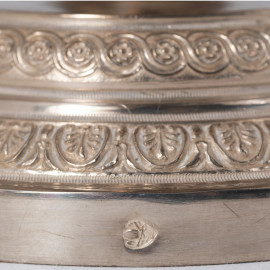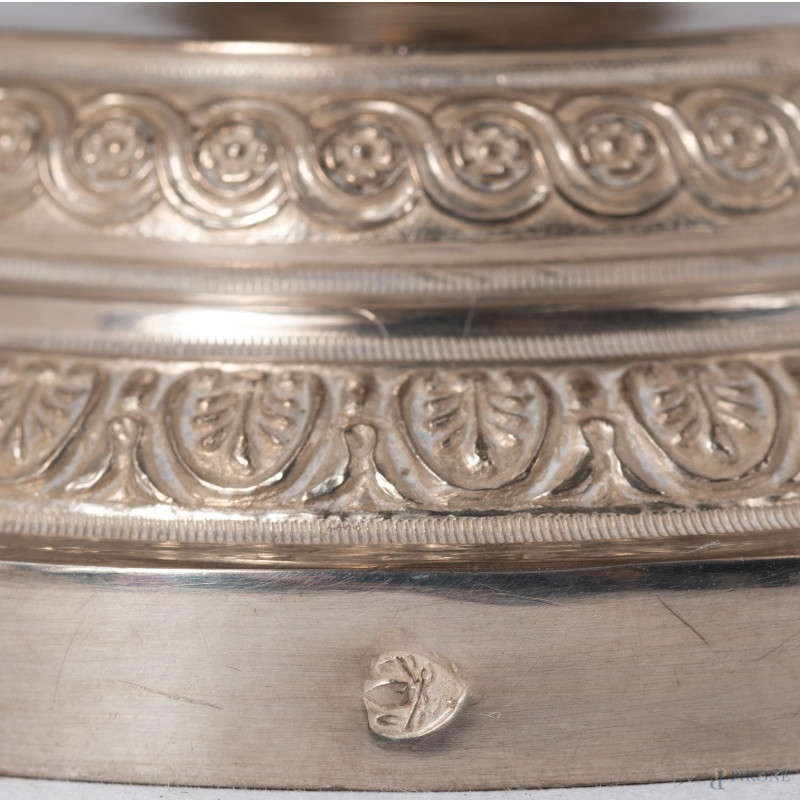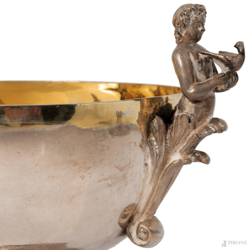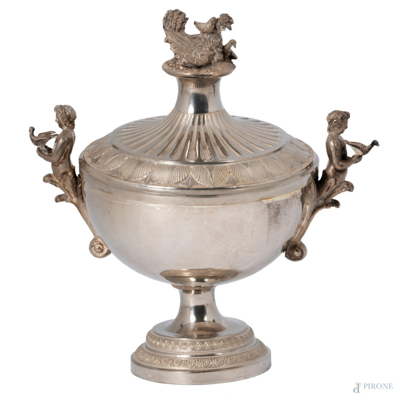 Alzata in argento con prese a rilievo a guisa di giovani con colombe. Coperchio con presa di volatili ed interno vermeil, altezza cm 20, peso gr 410