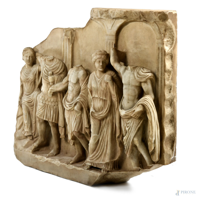 Apoteosi di Augusto, XIX secolo, altorilievo in marmo, cm 65,5x75x16, (scalfiture, graffi, difetti)