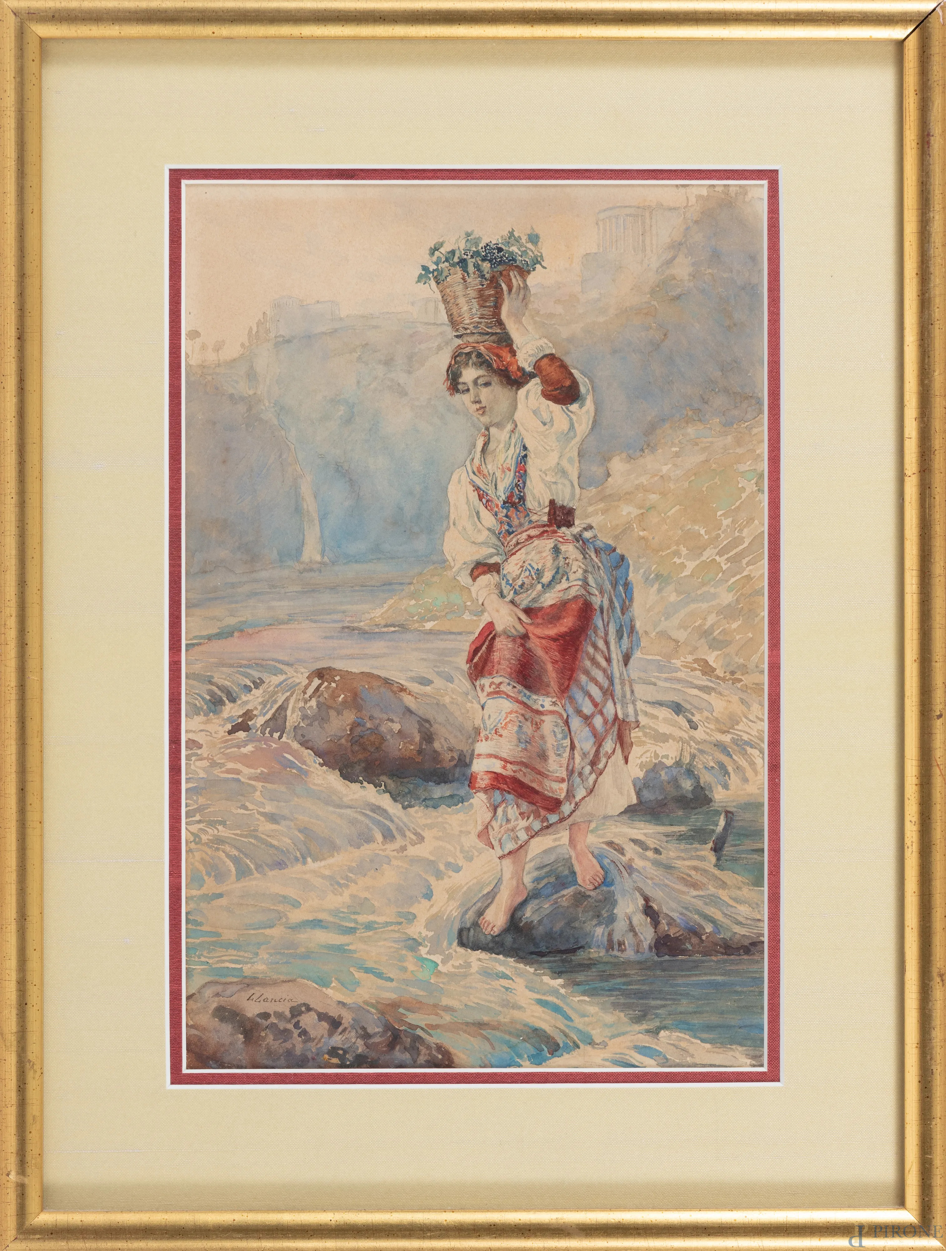 Attraversando il ruscello, XIX-XX secolo, tecnica mista su carta, cm 39,5x29 compreso passepartout, firmato in basso a sinistra, entro cornice, (lievi ondulazioni e brunitura della carta)