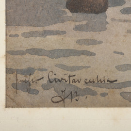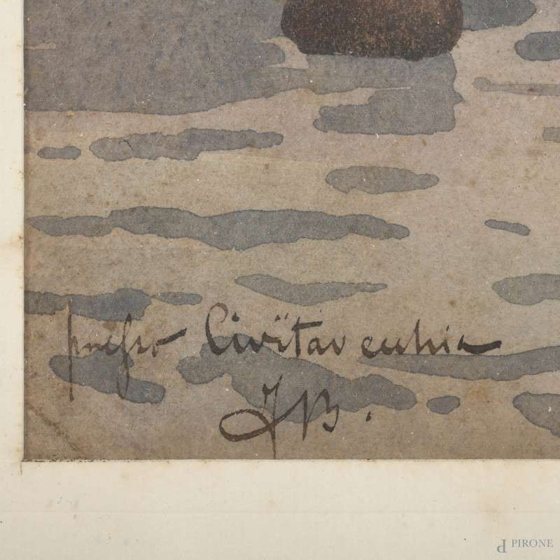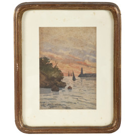 Barche a vela al tramonto, XX secolo, acquerello su carta, cm 20x14, iscritto in basso a sinistra, entro cornice, (bruniture, foxing, gore, tracce di umidità, ondulazioni della carta)