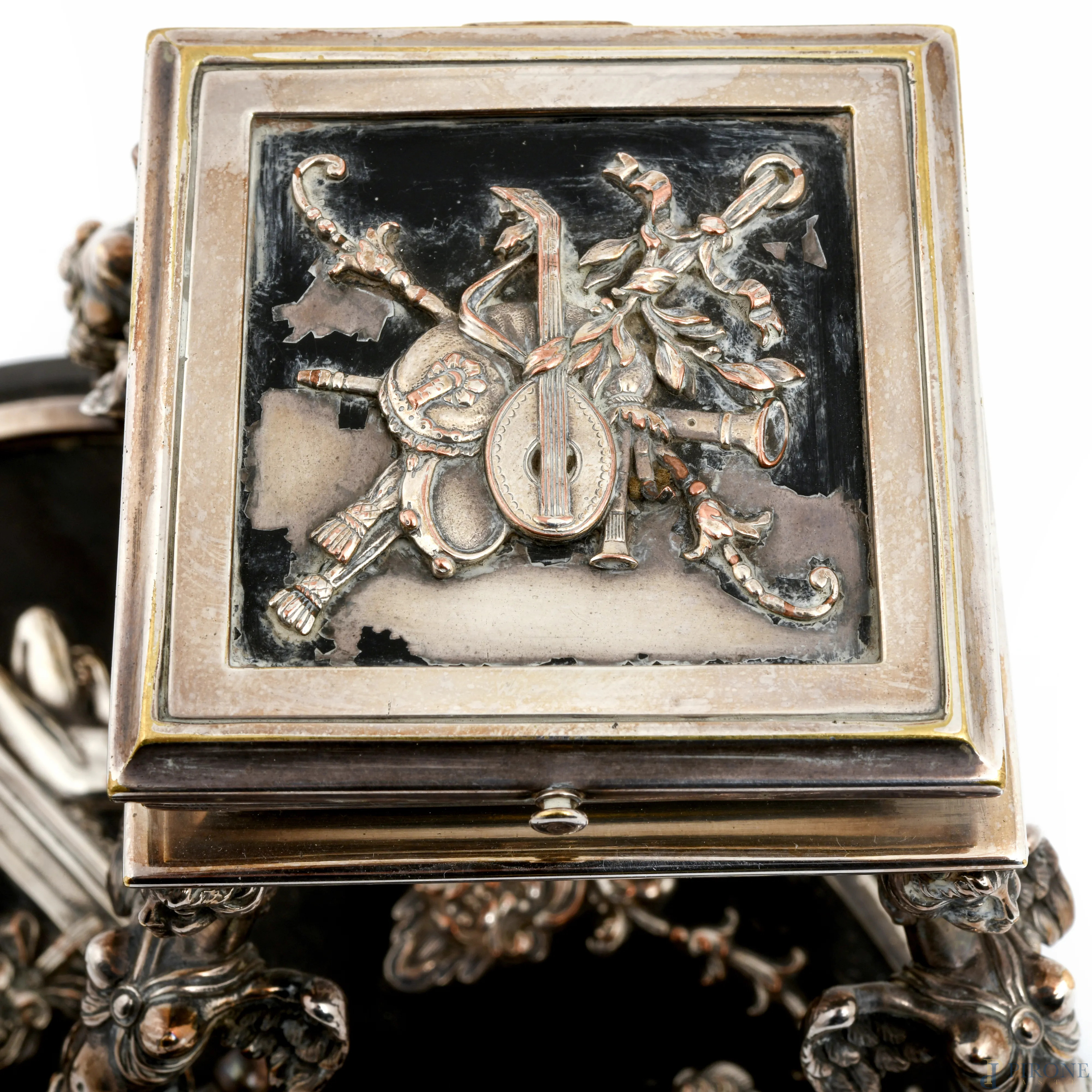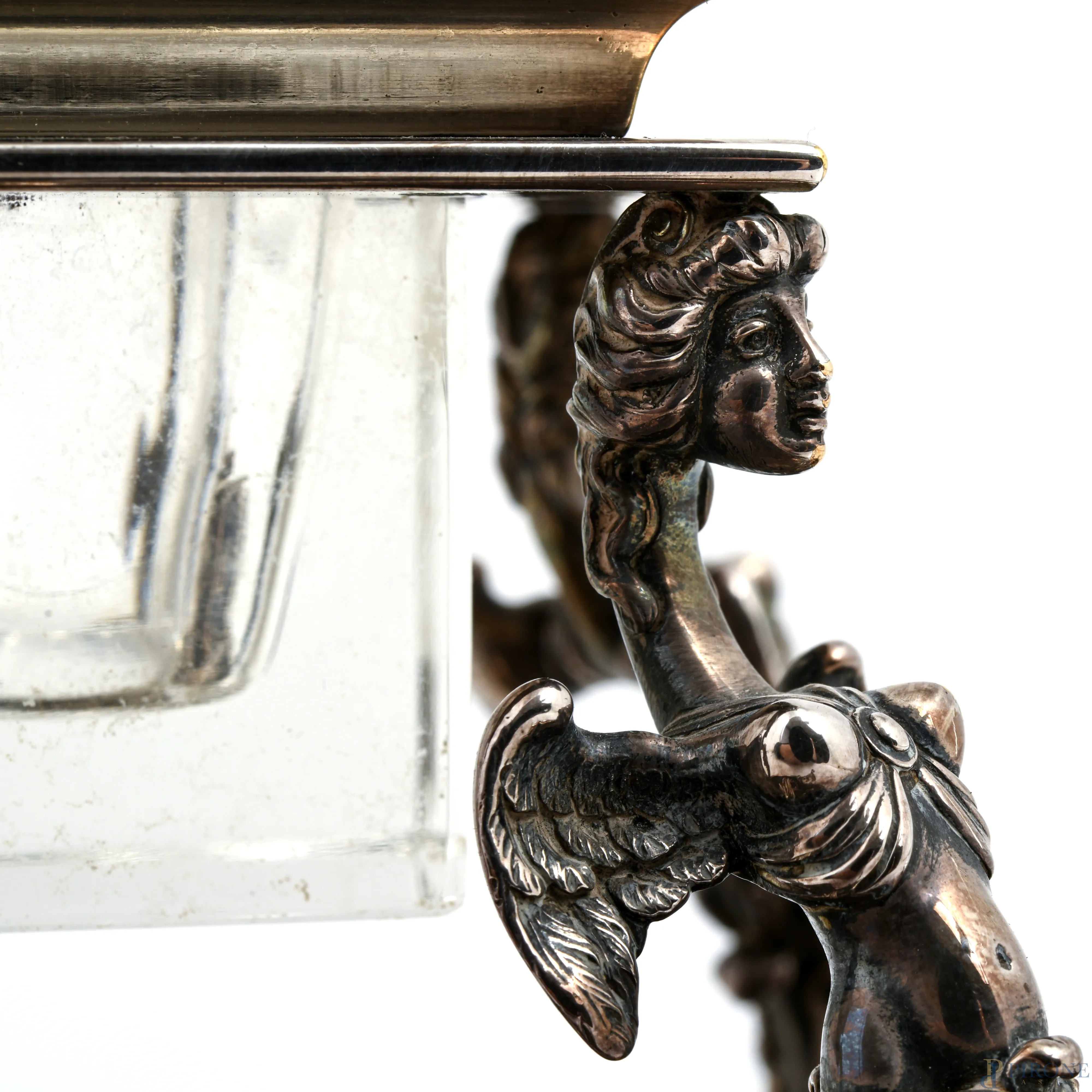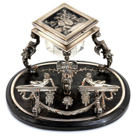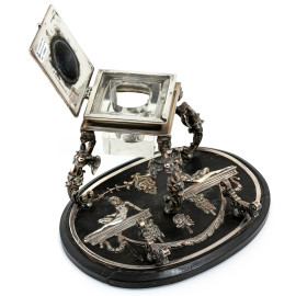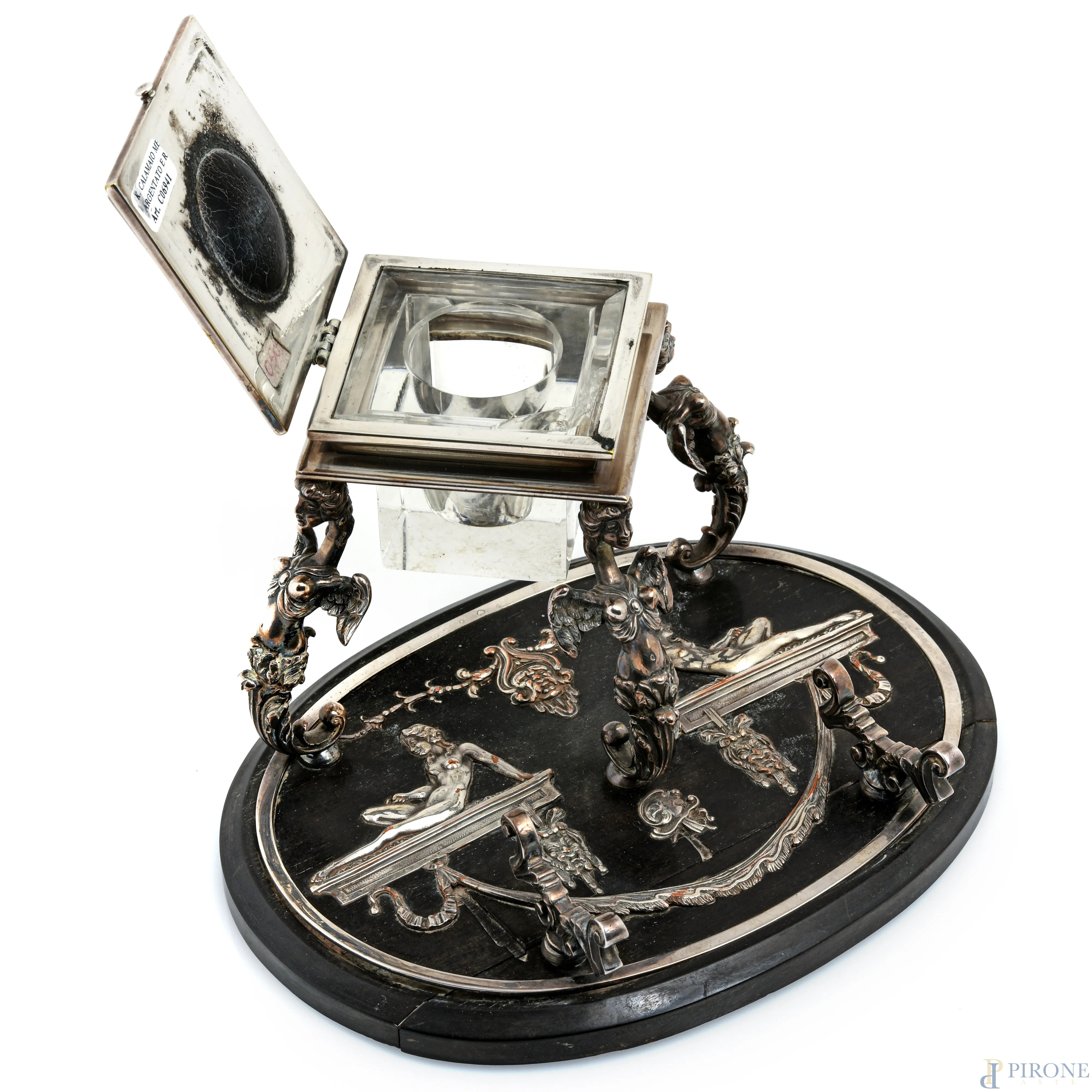 Calamaio in metallo argentato su base in radica dipinta, XVIII-XIX secolo, cm 11x18x14, (rotture)