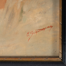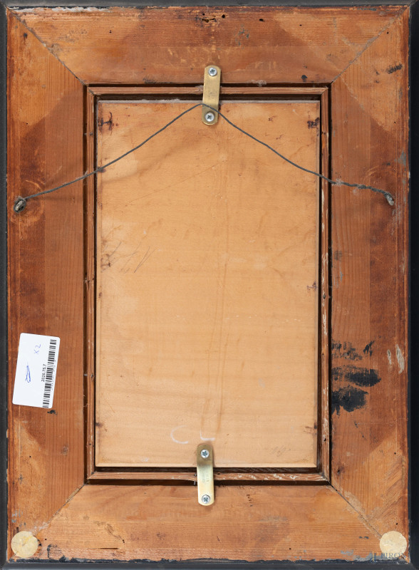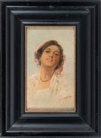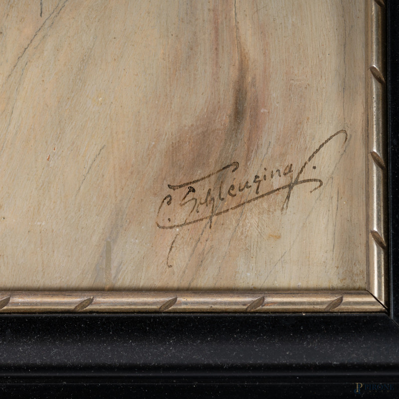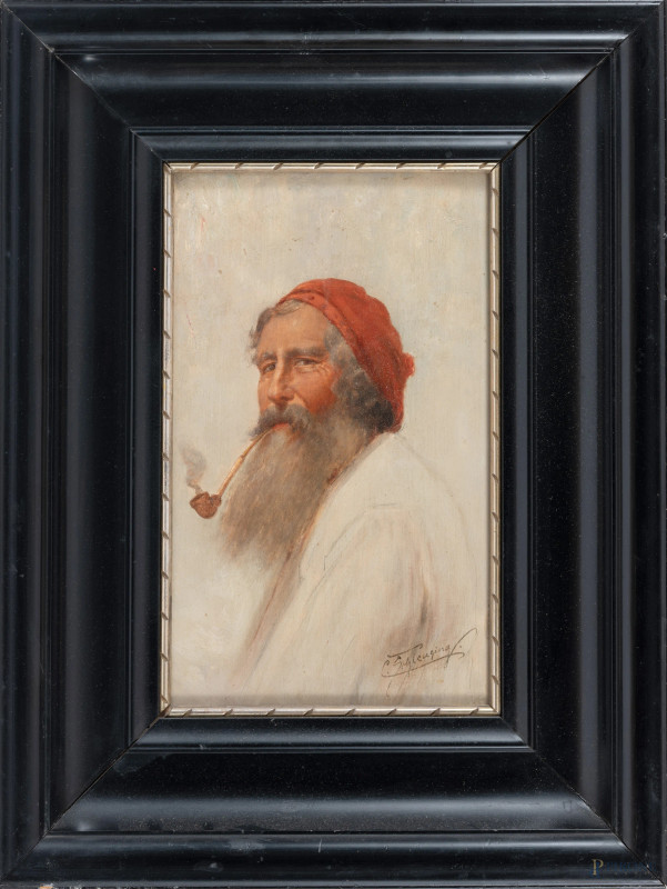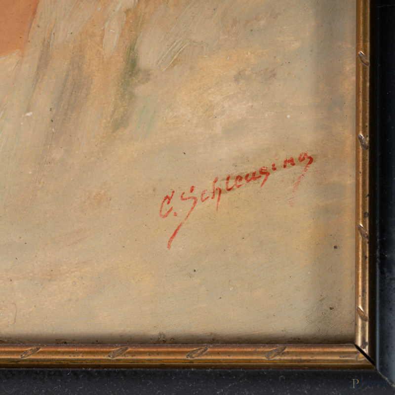 Carl Schleusing (1865-1953), Coppia di ritratti raffiguranti pescatore con pipa e giovane popolana, XX secolo, olio su tavola, cm 29x17, firmati in basso, entro cornice, (segni di usura, piccole abrasioni)