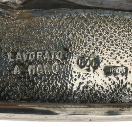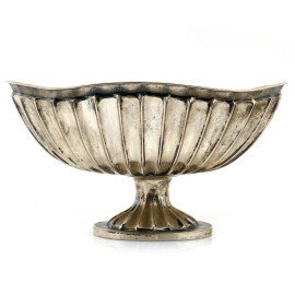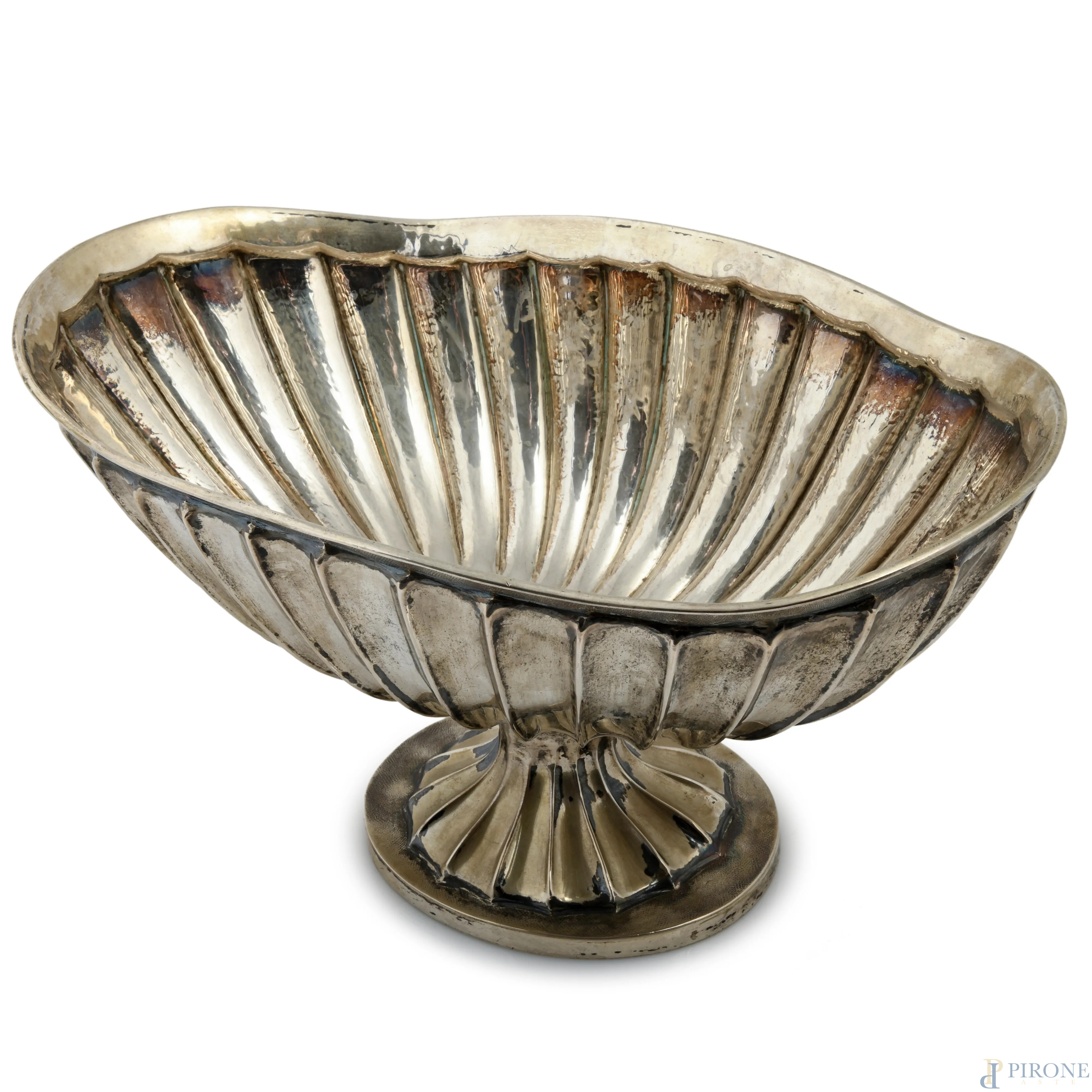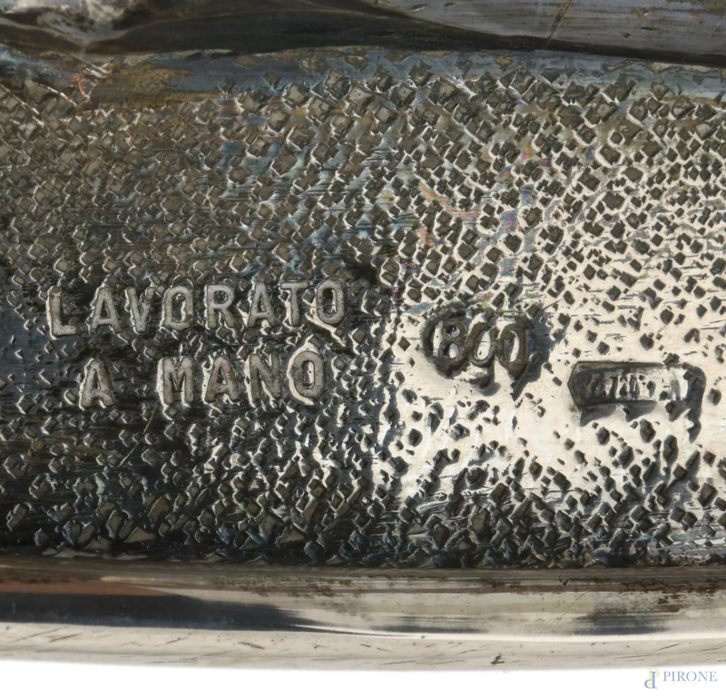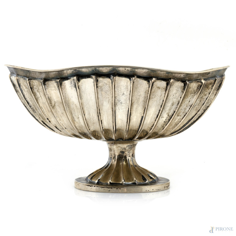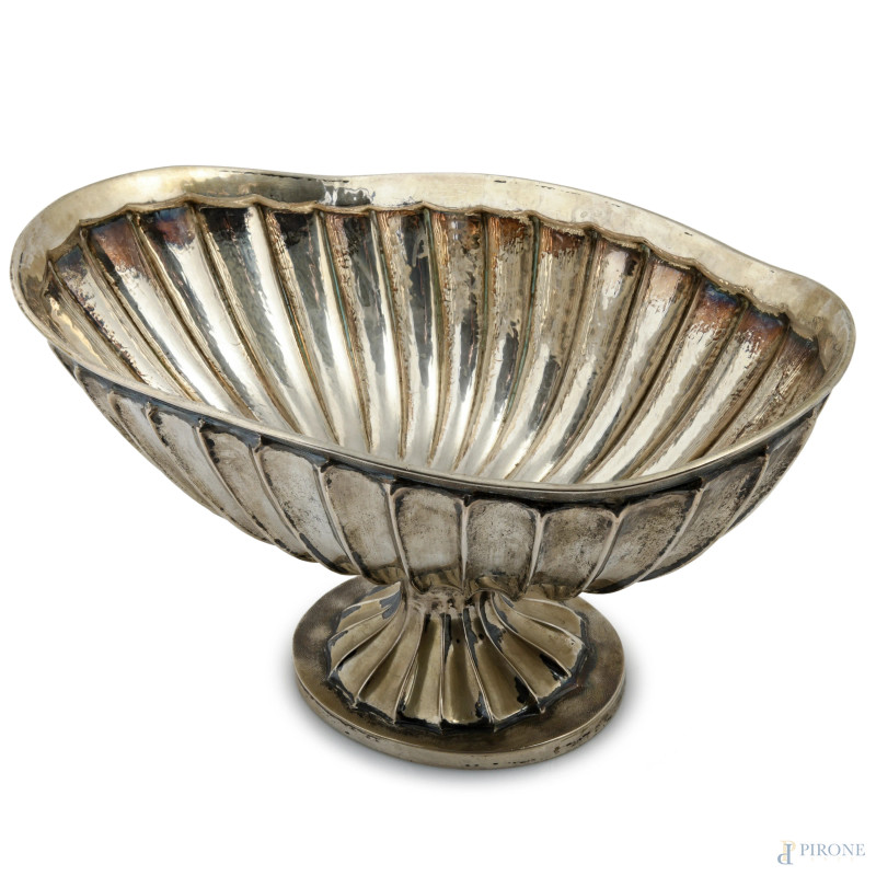 Centrotavola in argento 800/000 lavorato a scanalature, XX secolo, cm 20,5x38,5x23,5, peso gr 1350