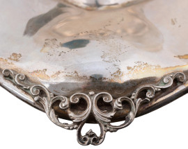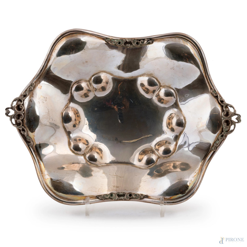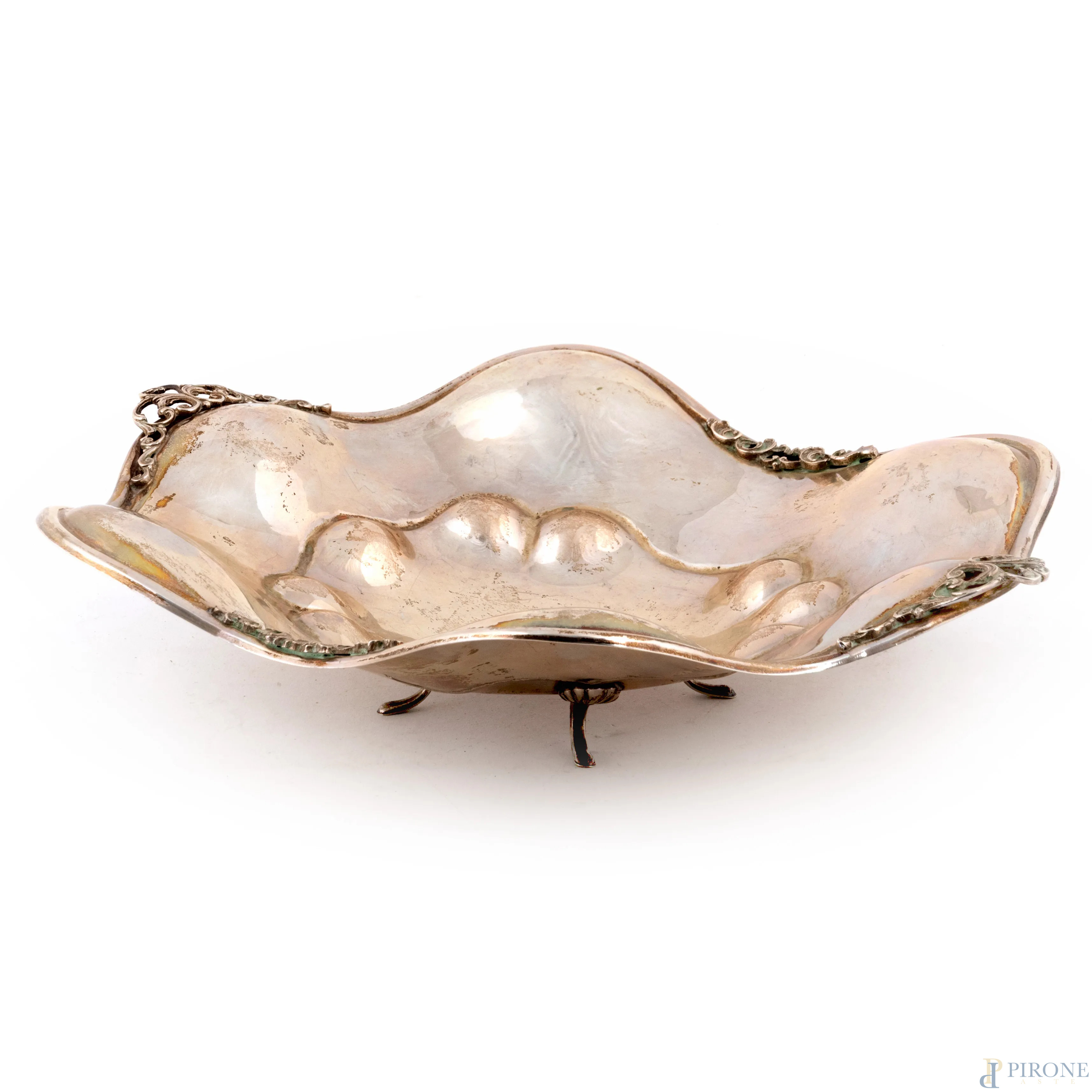 Centrotavola polilobato lavorato a cesello e sbalzo poggiate su quattro piedini in argento 800/000, cm 6,5x28,5x21,5, peso gr 300