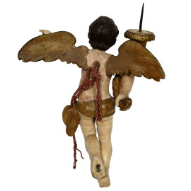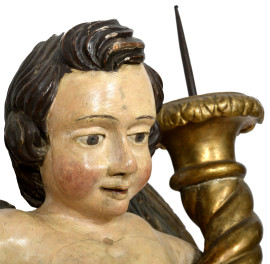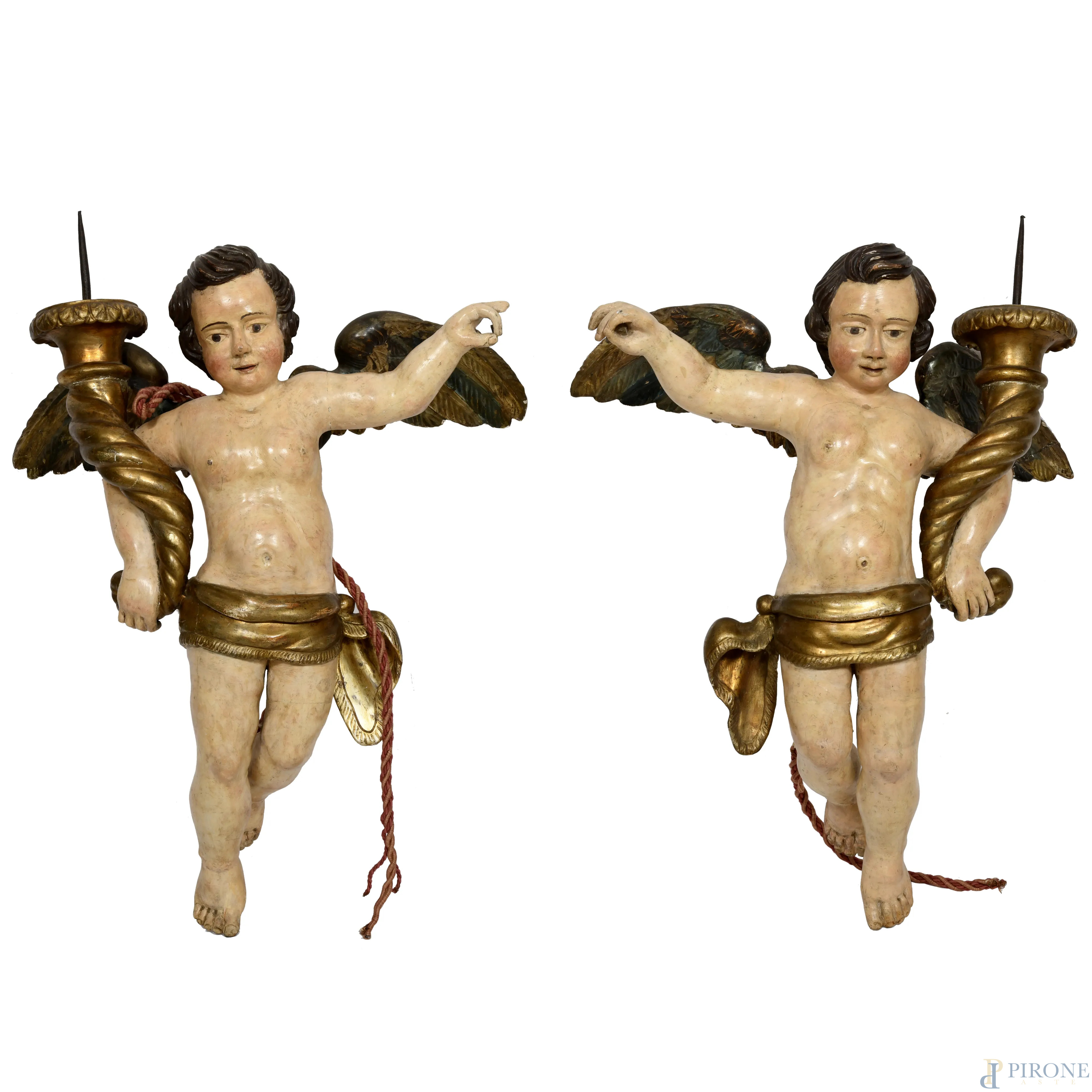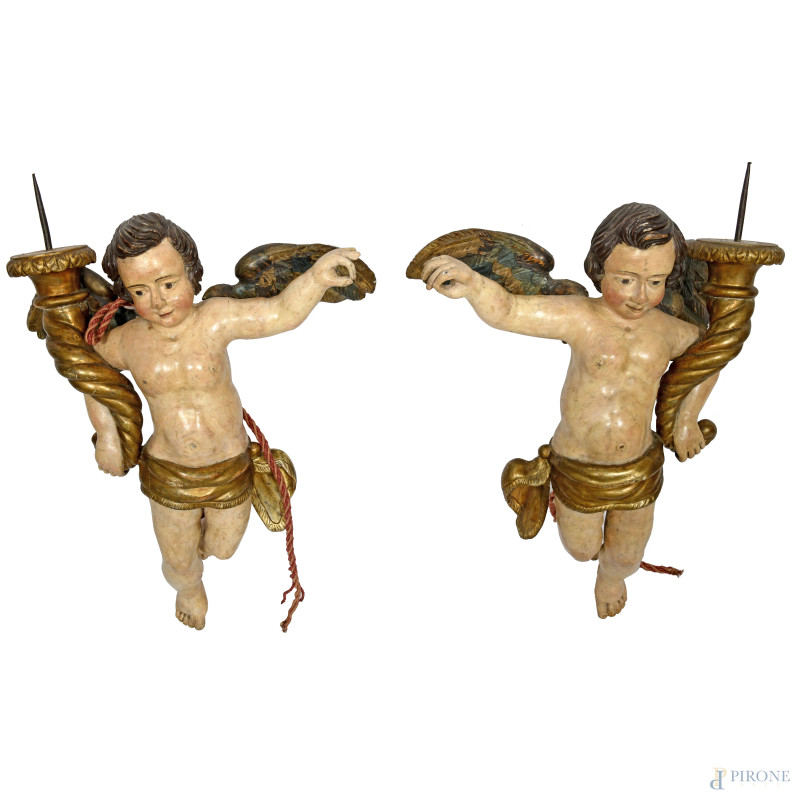 Coppia di angeli portacero in legno dipinto e dorato, XVIII secolo, altezza cm 84, (segni di usura, scalfiture, cadute di colore, restauri, difetti)