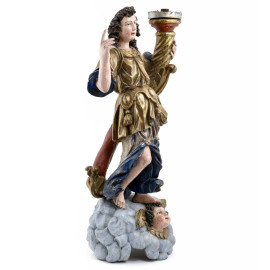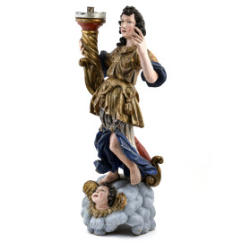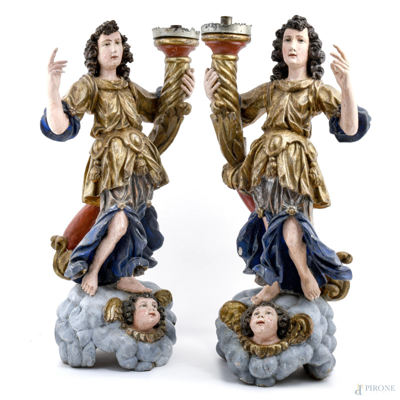 Coppia di angeli reggicero in legno dipinto e dorato, XVIII secolo, altezza cm 74, (segni di usura, rotture, mancanze, restauri, difetti)