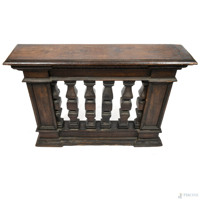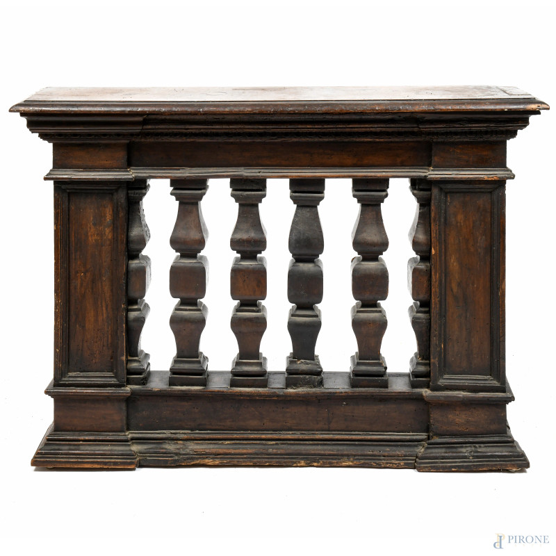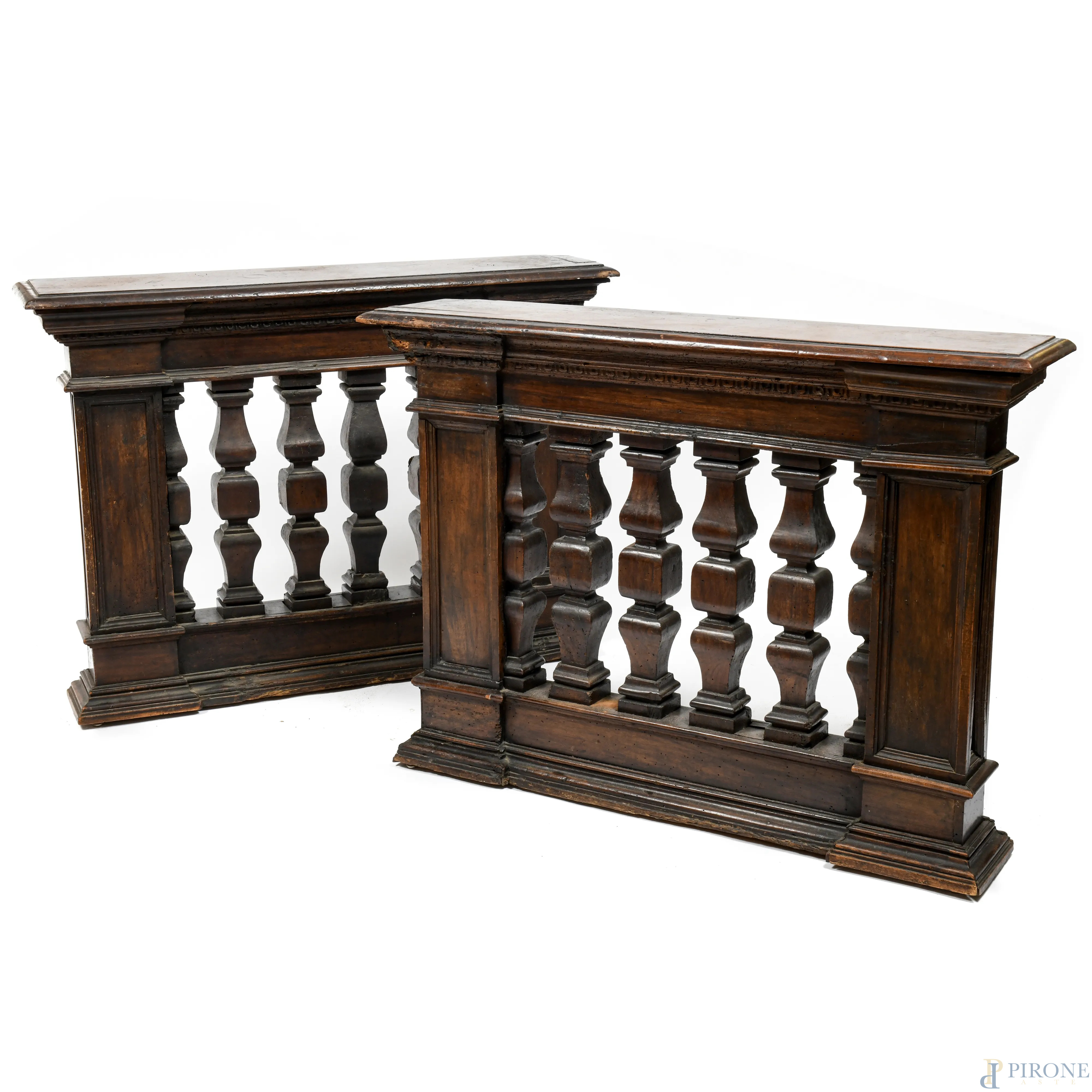 Coppia di balaustre in noce, XIX secolo, cm 87x119,5x28, (segni di usura, scalfiture, fori di tarlo, difetti)