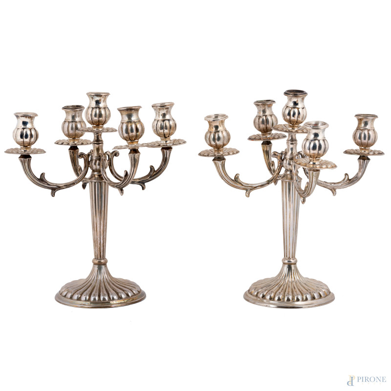 Coppia di candelabri a cinque luci in argento 800/000, XX secolo, altezza cm 30, peso lordo complessivo gr 1260 , (segni di usura, rotture)